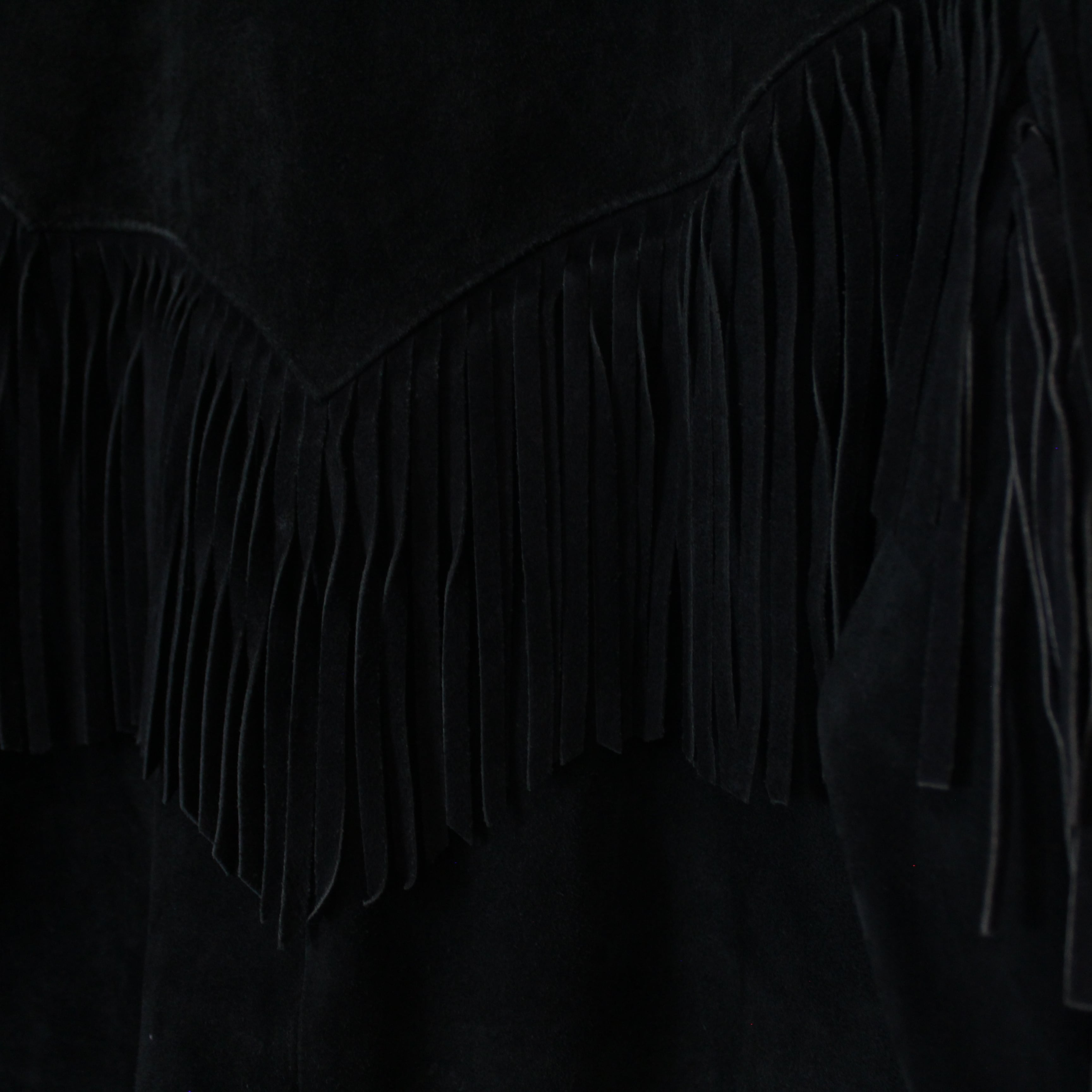 しっとりと滑らかで柔らかい極上のスエードレザーを用いたボディに、肩からから身頃にかけてフリンジを施したウエスタン仕様のレザージャケット。