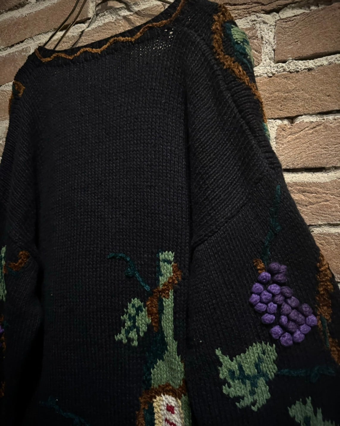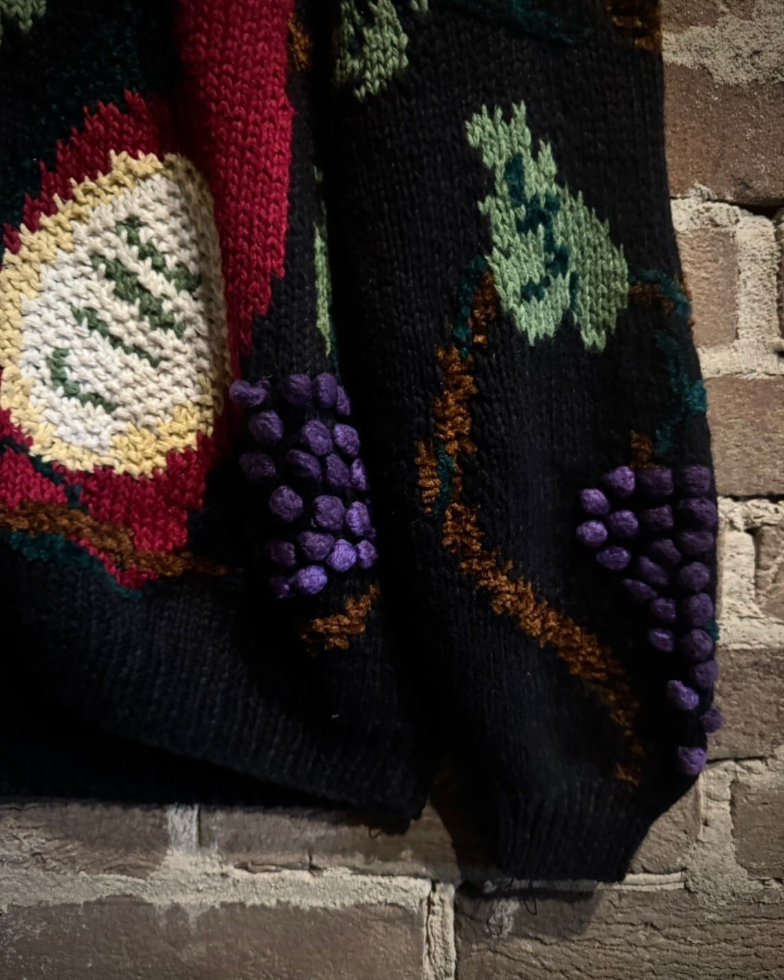 ブラックのボディをベースに、葡萄や赤白のワインをニッティングで表現した、ヨーロピアンな雰囲気を纏ったニットカーディガン。