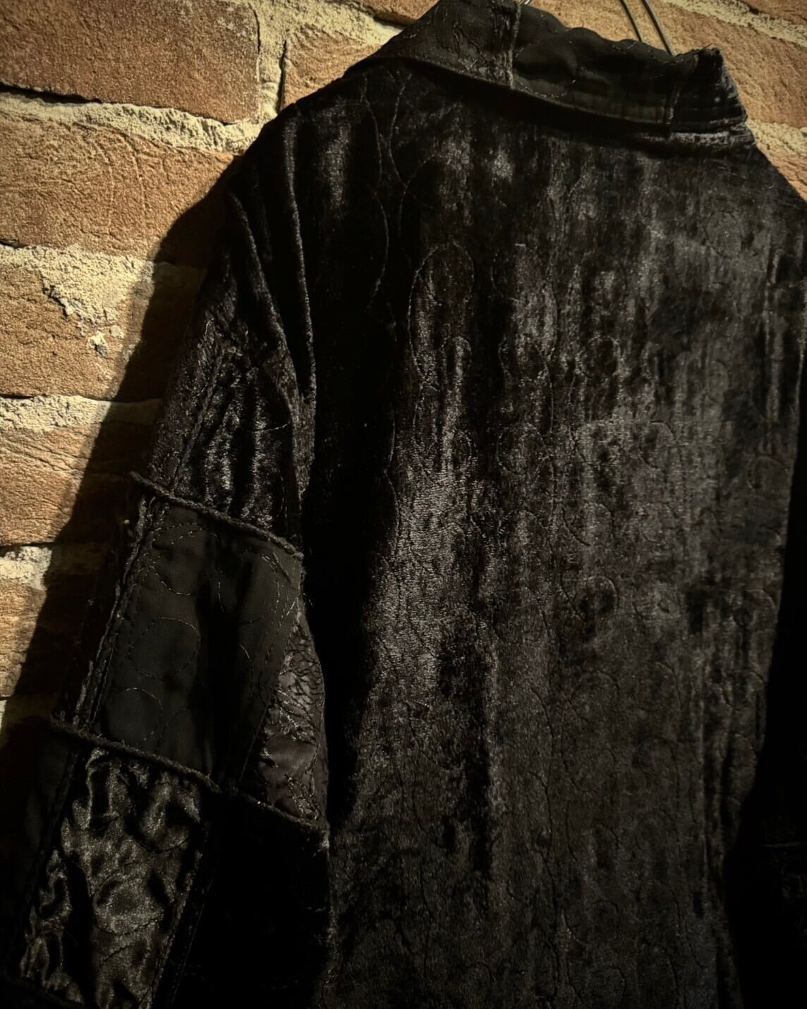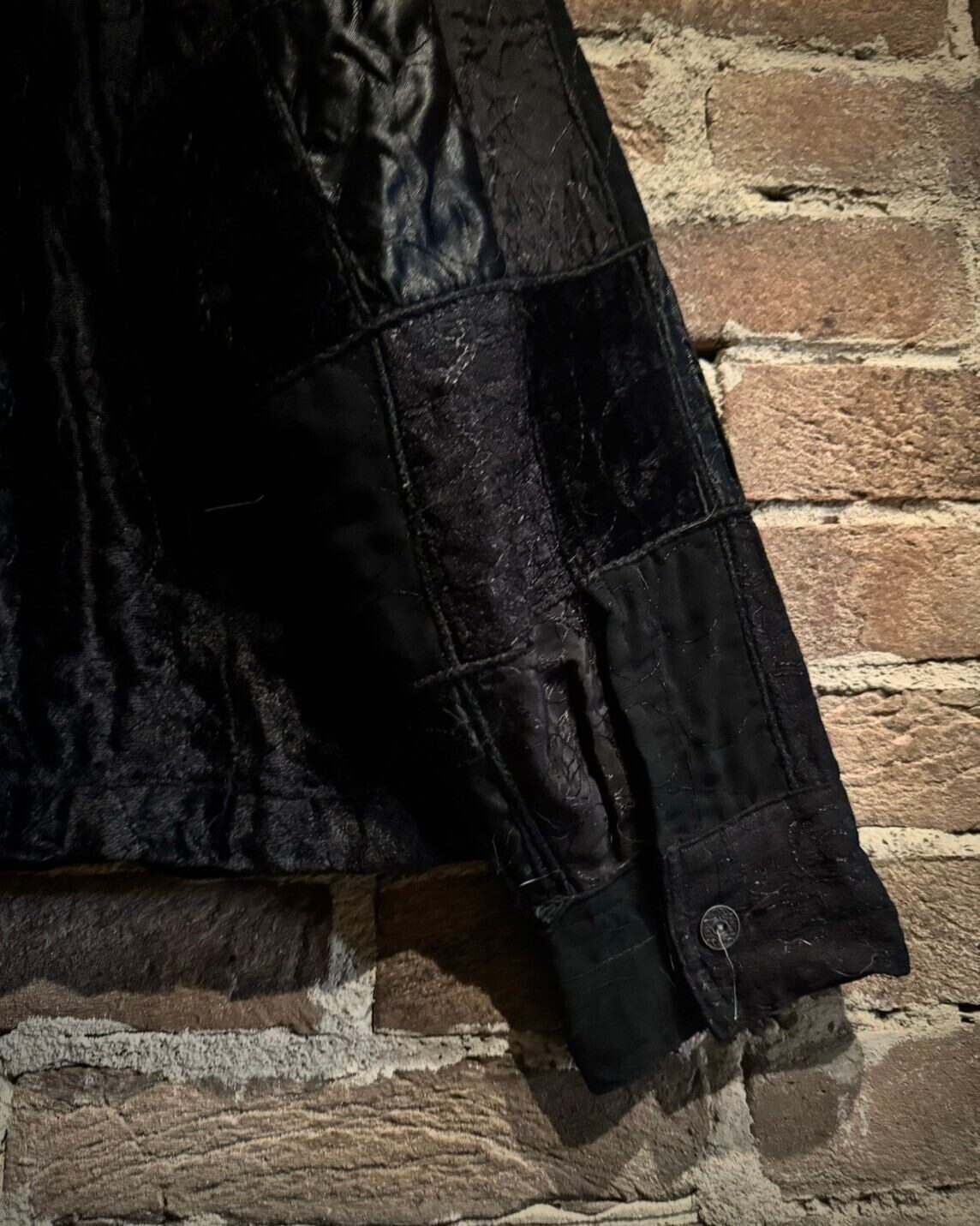 モード感溢れるブラックカラーをベースとし、サテンやベロアなど様々な素材をブロック状にパッチワークで繋ぎ合わせたシャツジャケット。