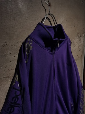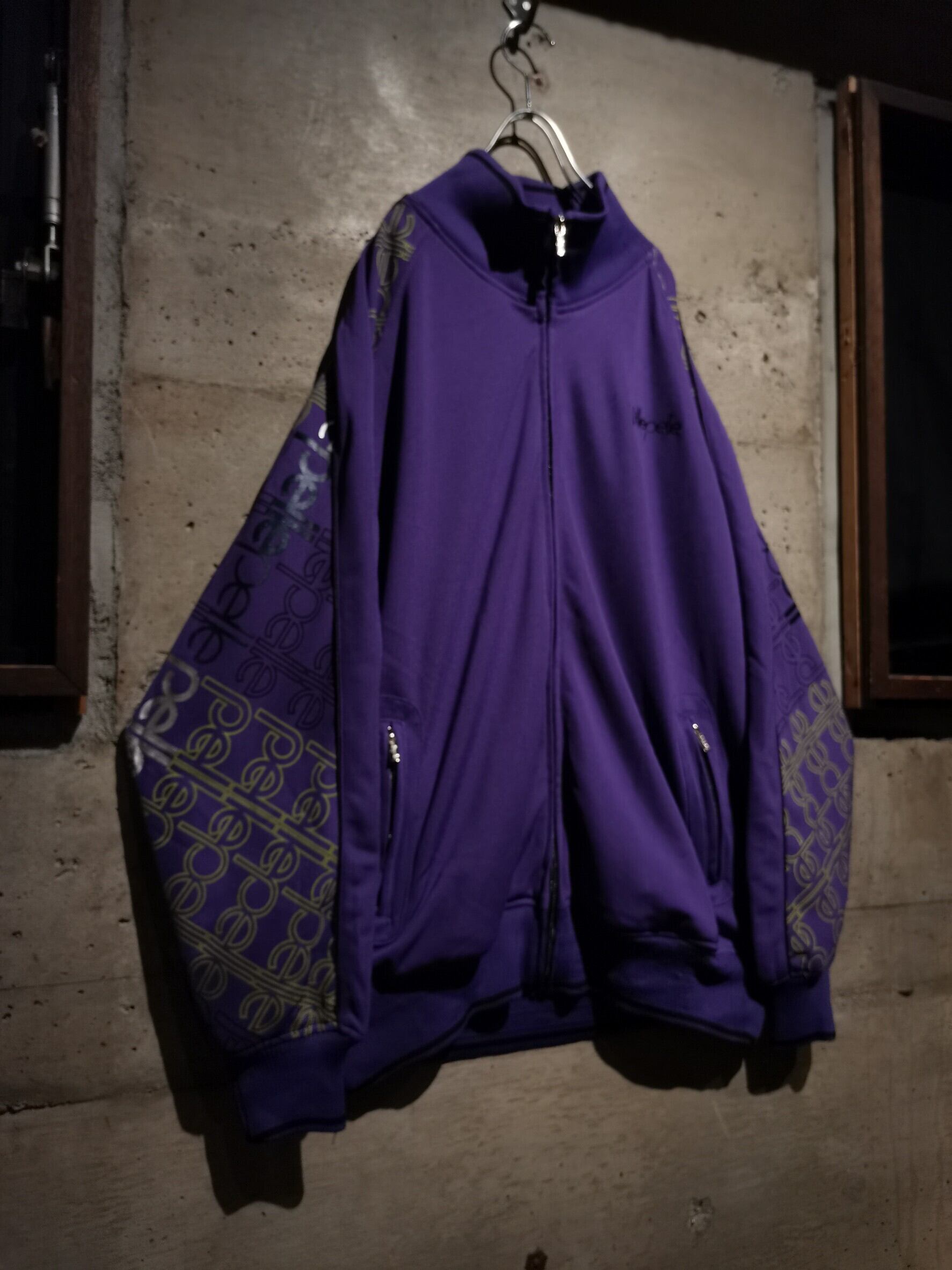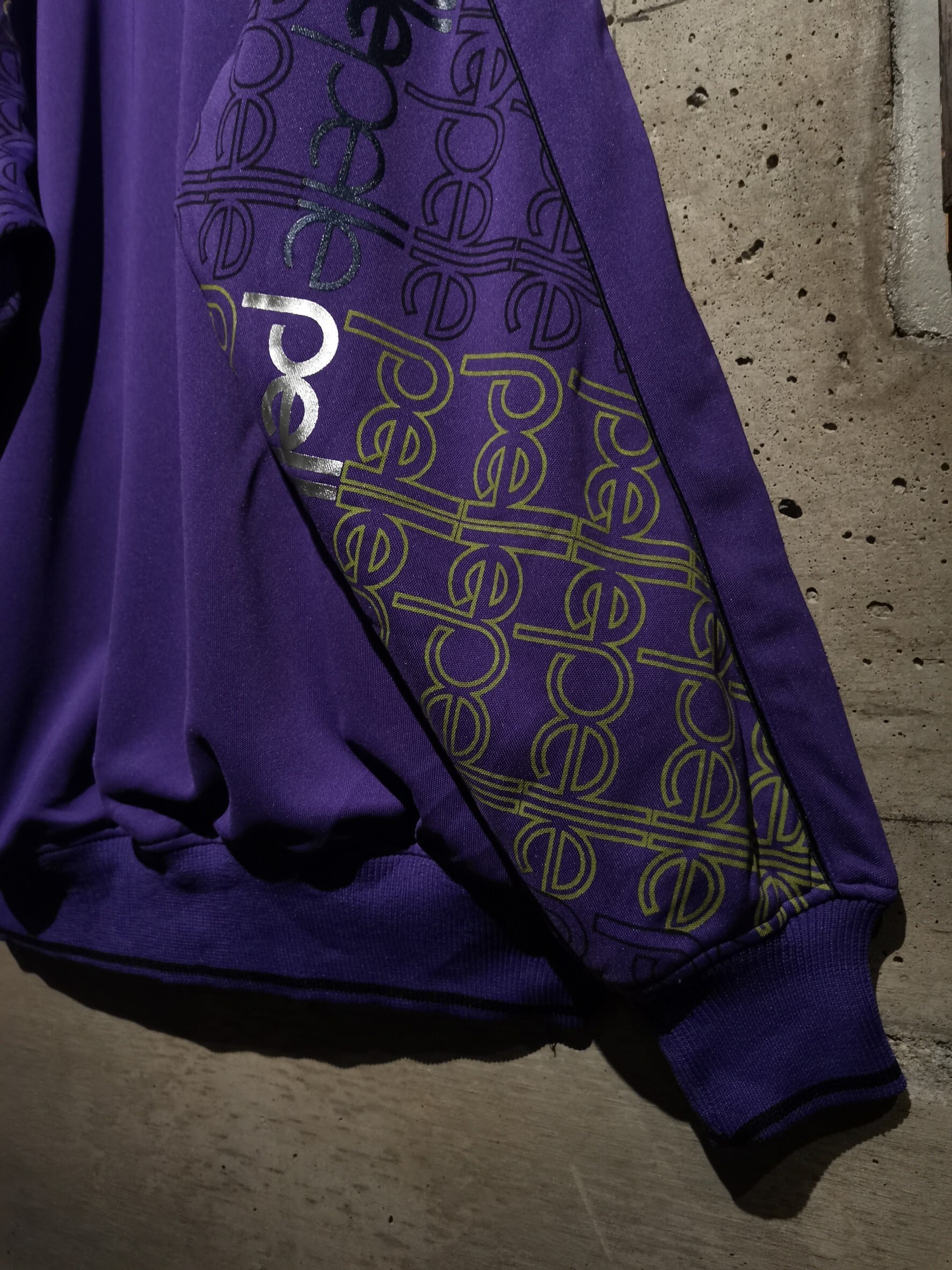パープルを基調としたボディに、ブラック、ネオングリーン、シルバーのカラーリングでブランドのロゴをマルチに載せた1着。