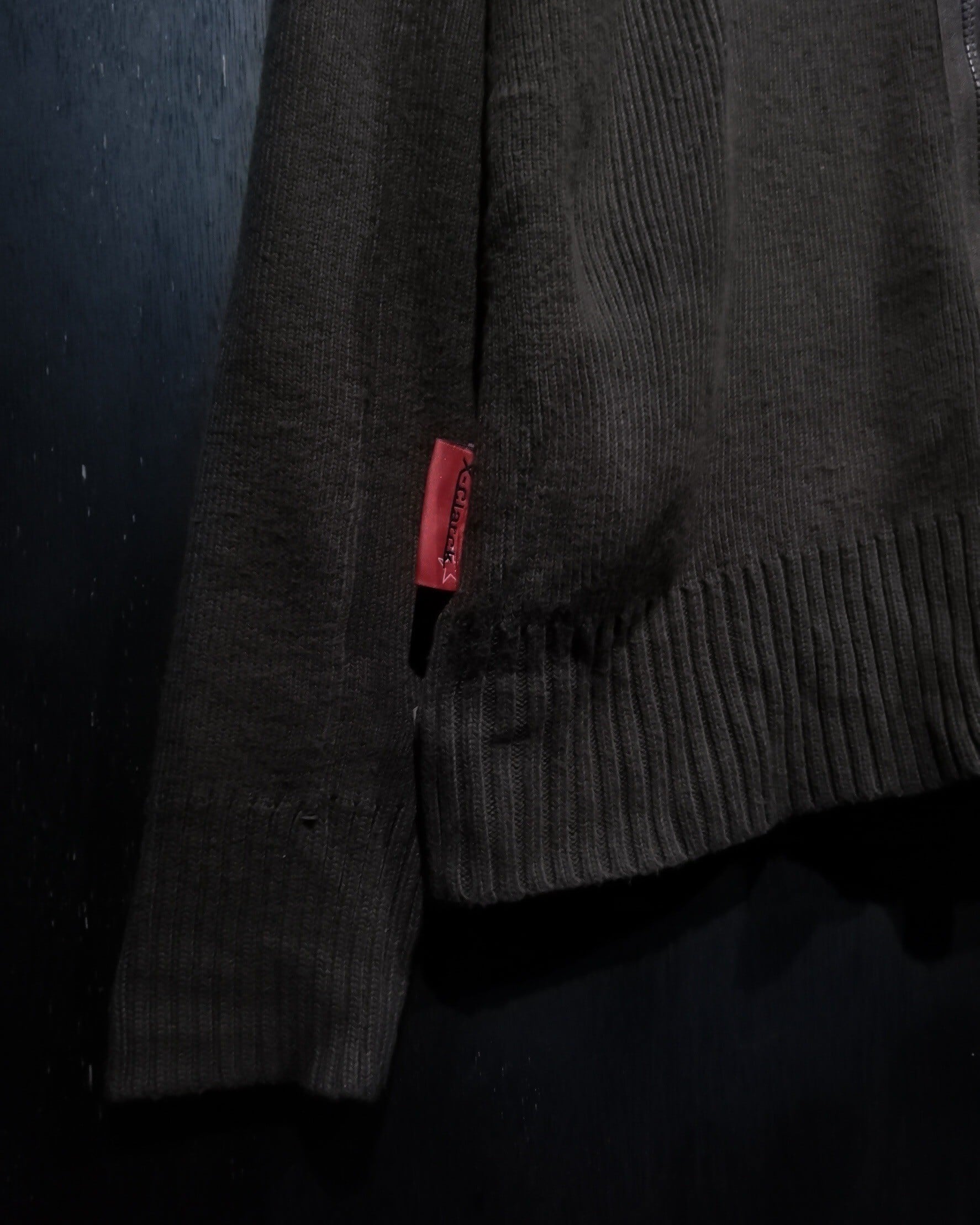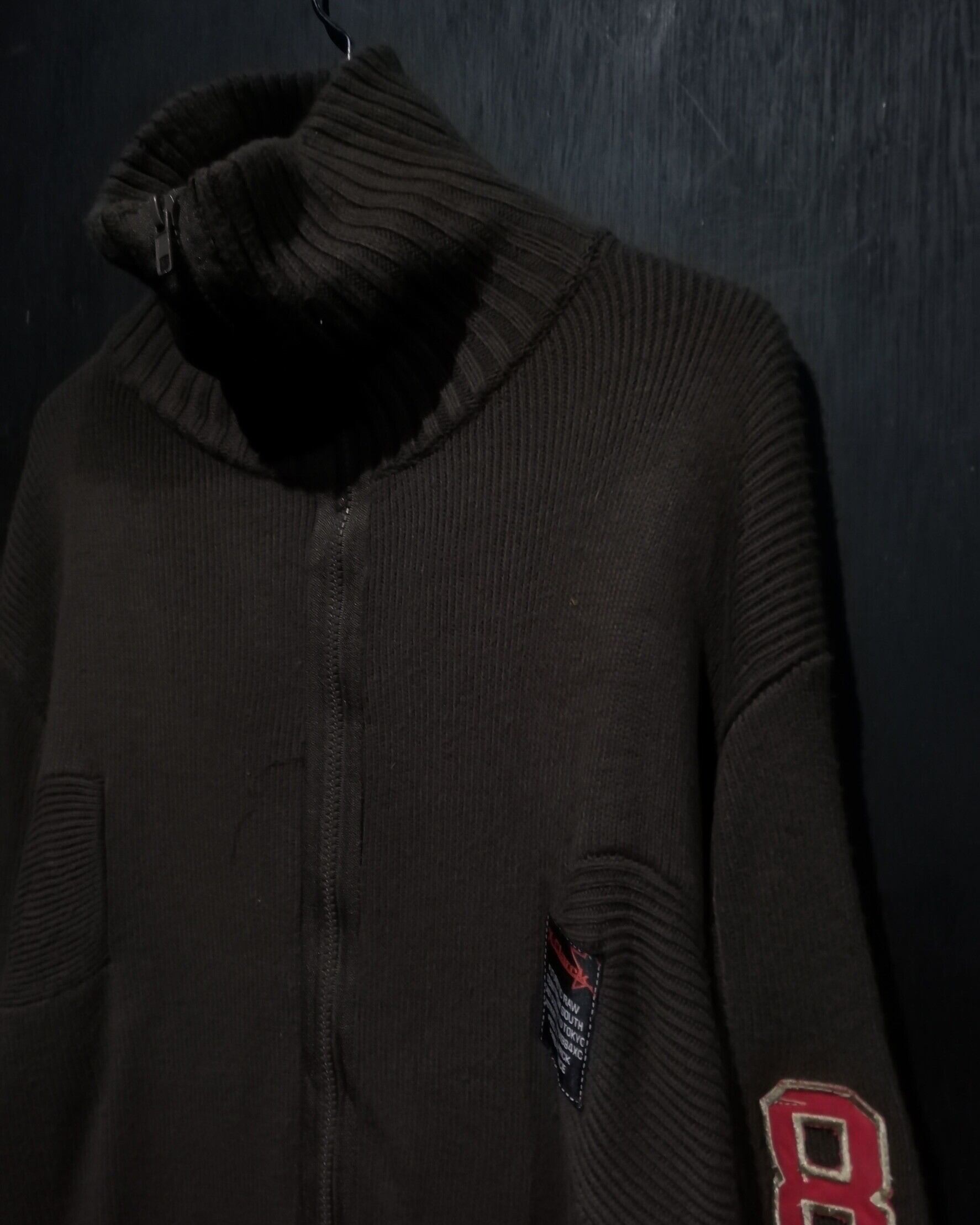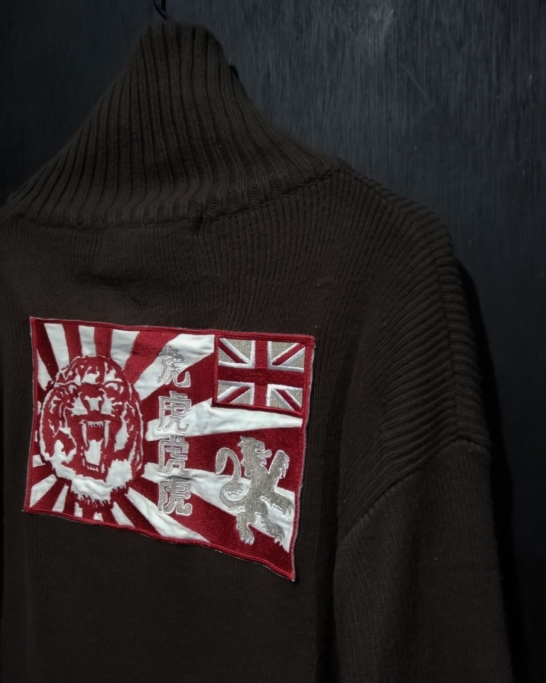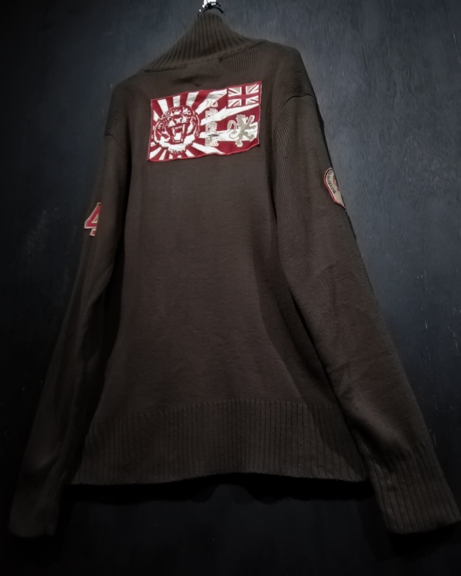 ブラウンのボディをベースに、右腕には龍、背面には虎のワッペンを載せた、ドライバーズ型のニットジャケット。