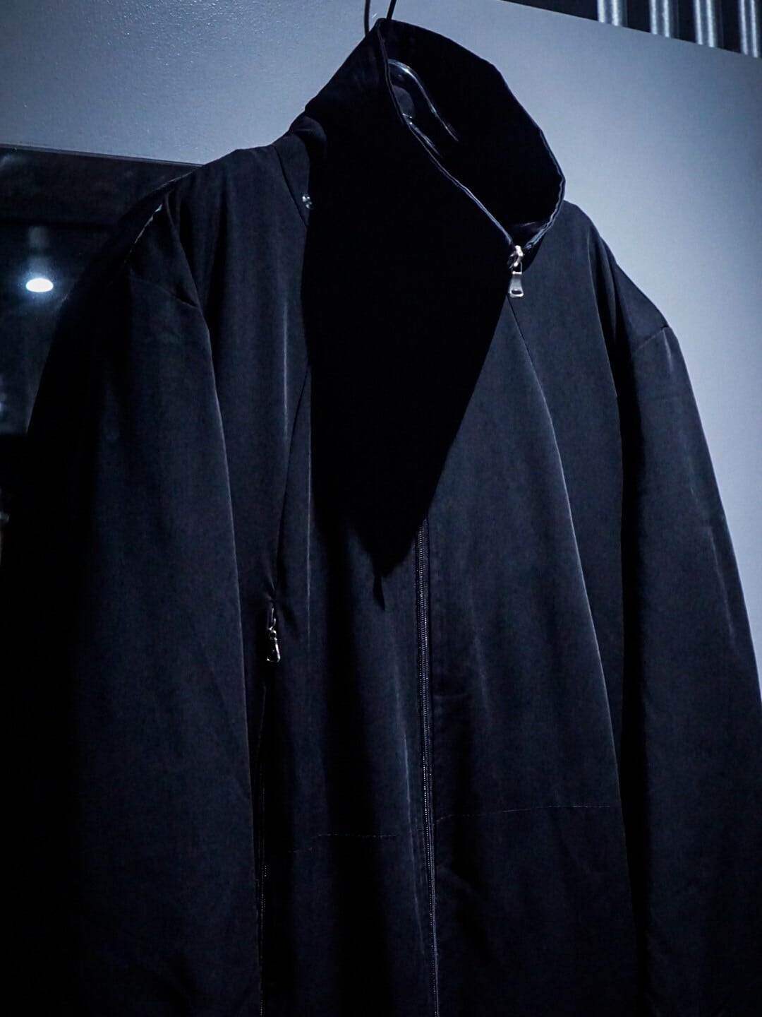 艶やかな光沢を帯びたブラックナイロンをボディに使用したハイネック仕様のジップアップコート。