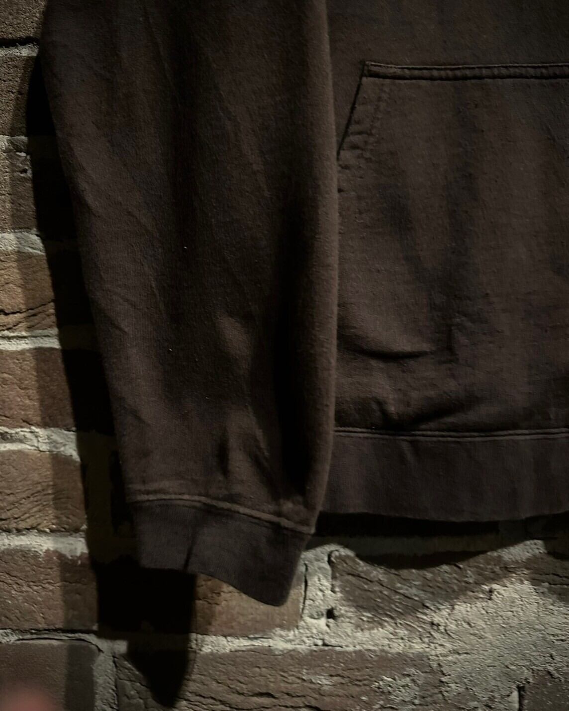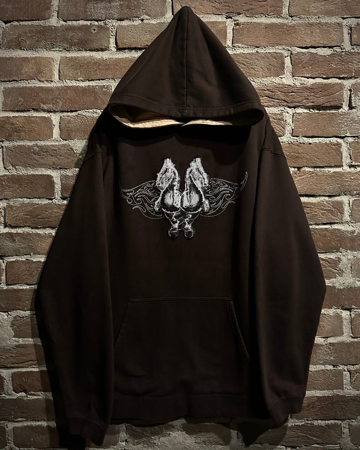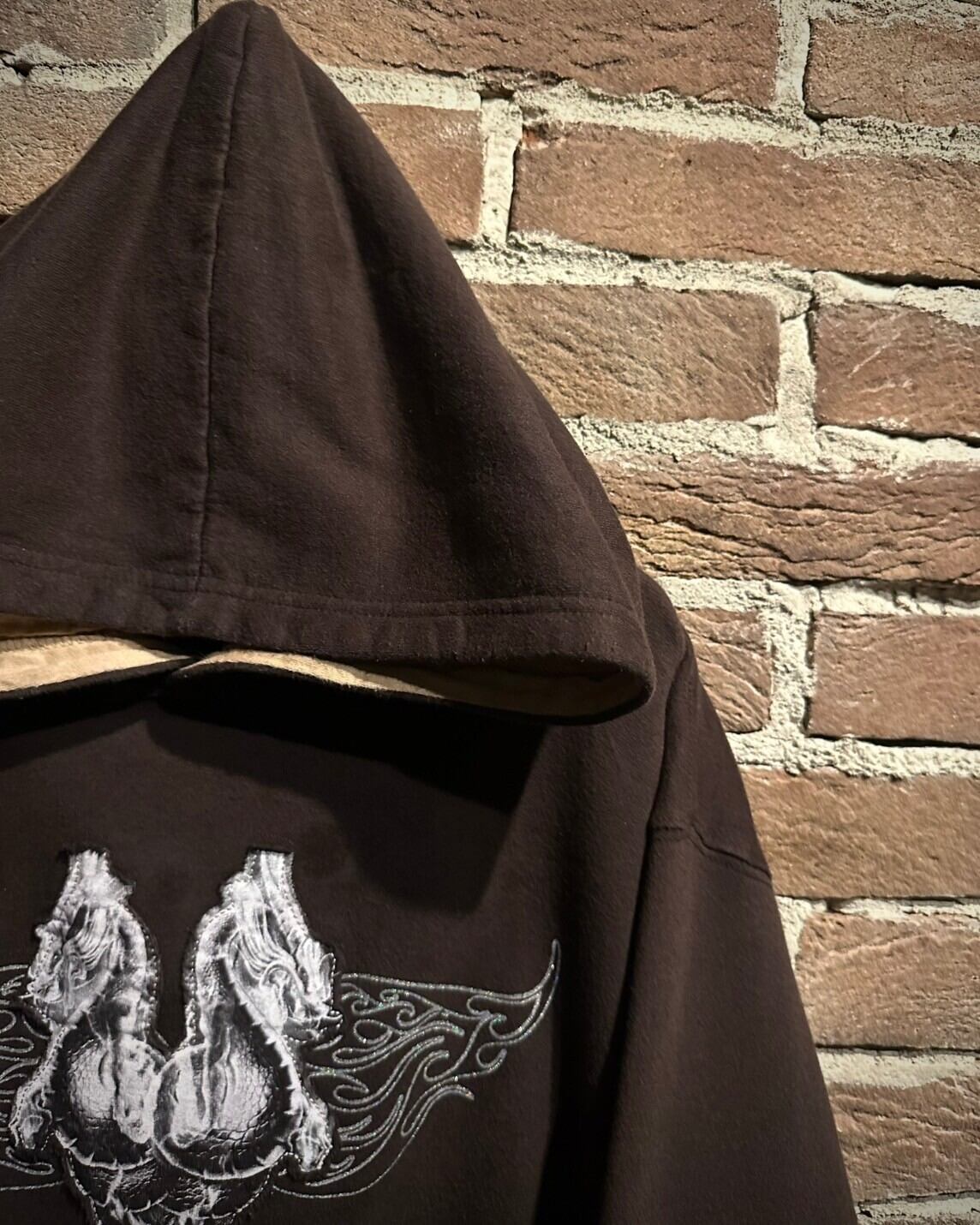 ブラウンのボディをベースに、トライバル柄の炎、龍を載せた、今季の気分ドンズバなプルオーバーフーディ。