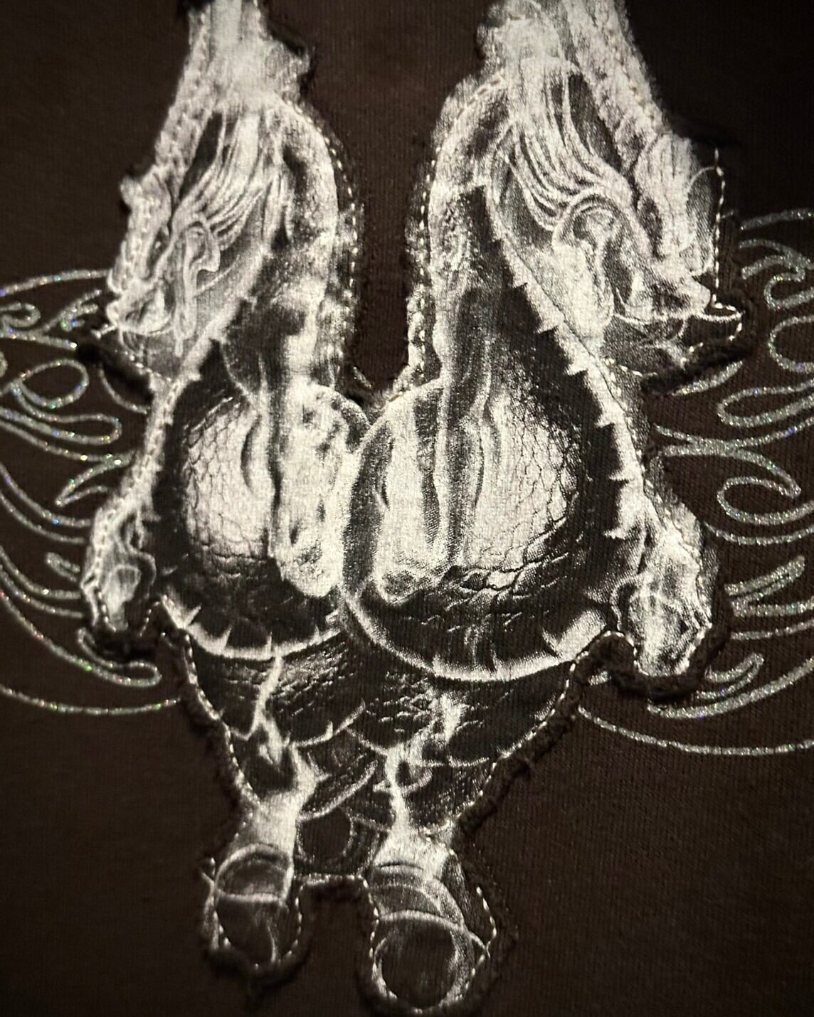 ラメプリントを用いたトライバルな炎の上に、龍を緻密にデザインしたパッチを載せたことでより一層迫力のあるデザインに。