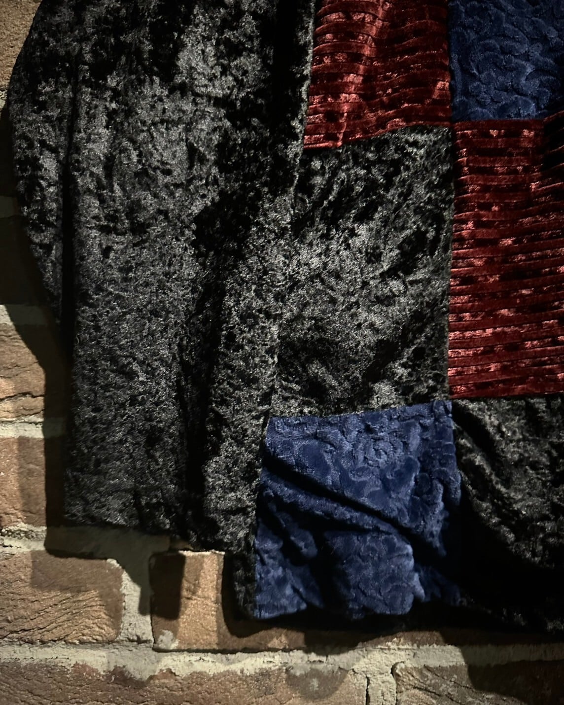 ベロアの鈍い光沢にパッチワークの立体感が合わさり非常に存在感のある1着に。このラグジュアルなルックスが堪りません、、、フロントはパッチワーク風に、背面はシンプルに仕上げられ、前後で異なる表情を見せるのも魅力の一つですね。