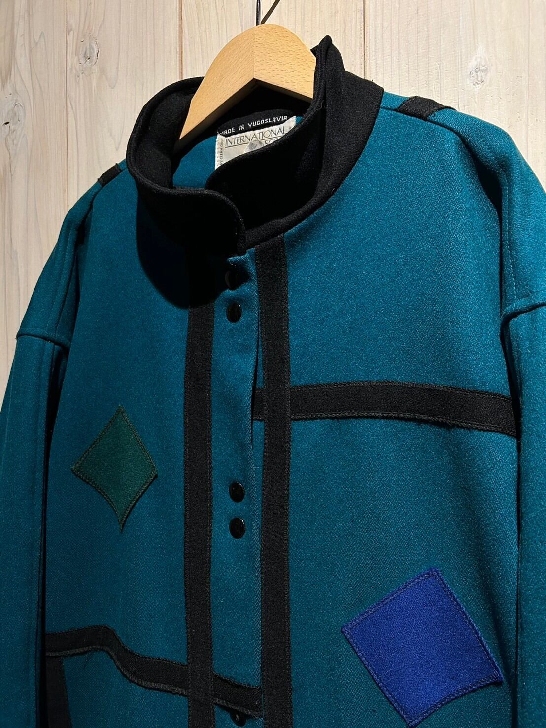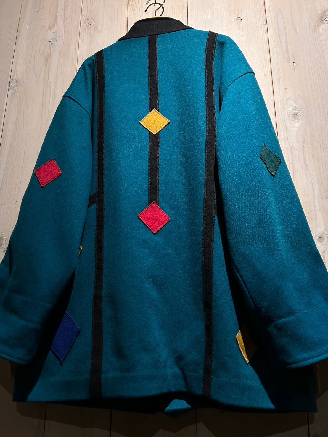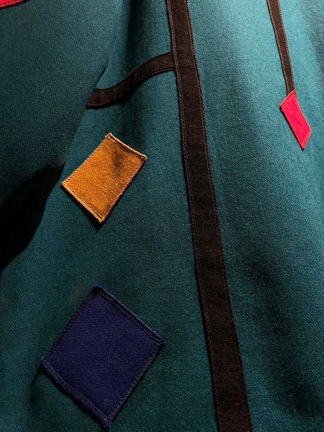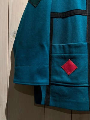 保温性が高い上質なウールを採用。ターコイズブルーのボディにモンドリアン的な切り替えを施した稀有かつスペシャルなコート。イヴ・サンローランが1965年にモンドリアンから着想を得て、モンドリアンルックと呼ばれる作品を作ったことも。