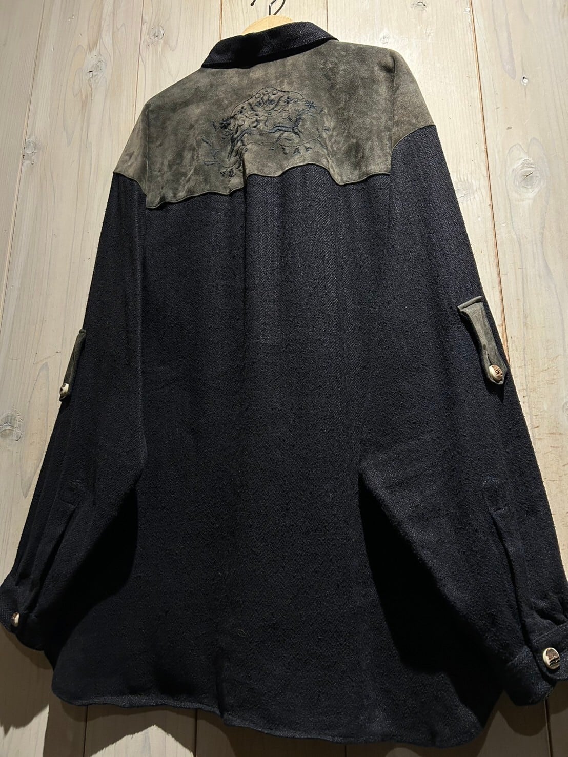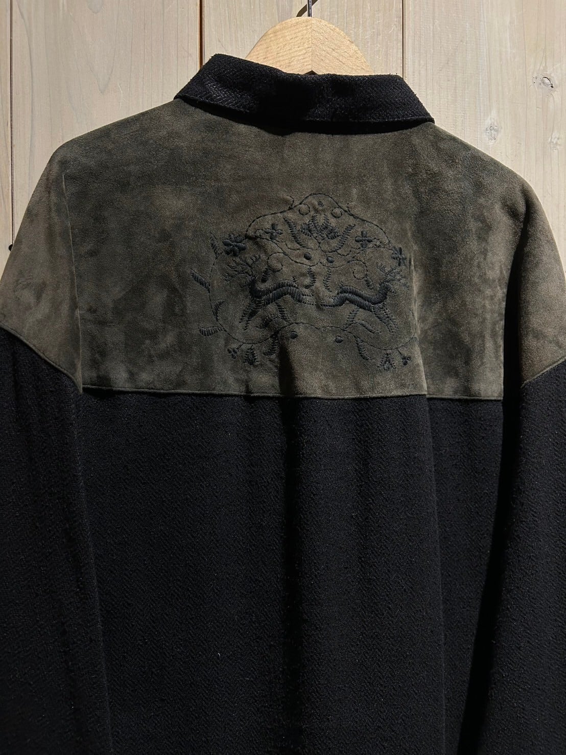 背面ヨーク、アームのベルト、ポケット口にはしっとりと柔らかなスエードレザーを切り替え。さらに背面ヨークには刺繍を刻み、チロリアンらしさをしっかりと組み込みながらも、どこかモードな雰囲気を纏った1着に。