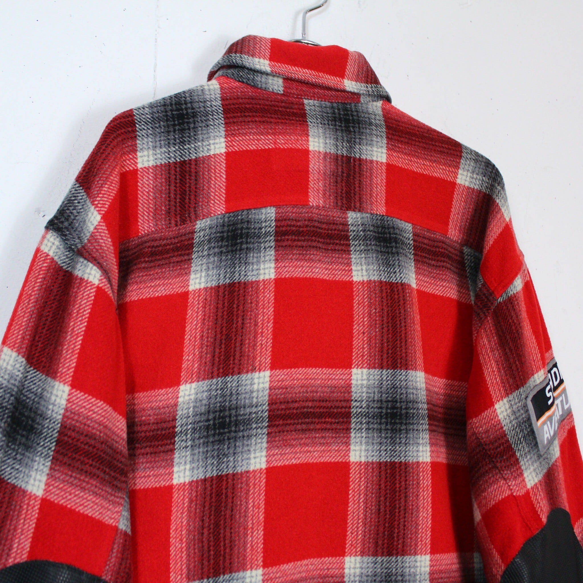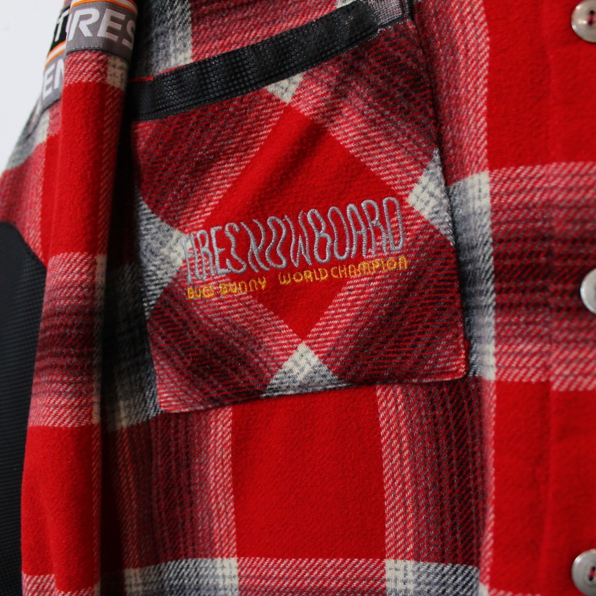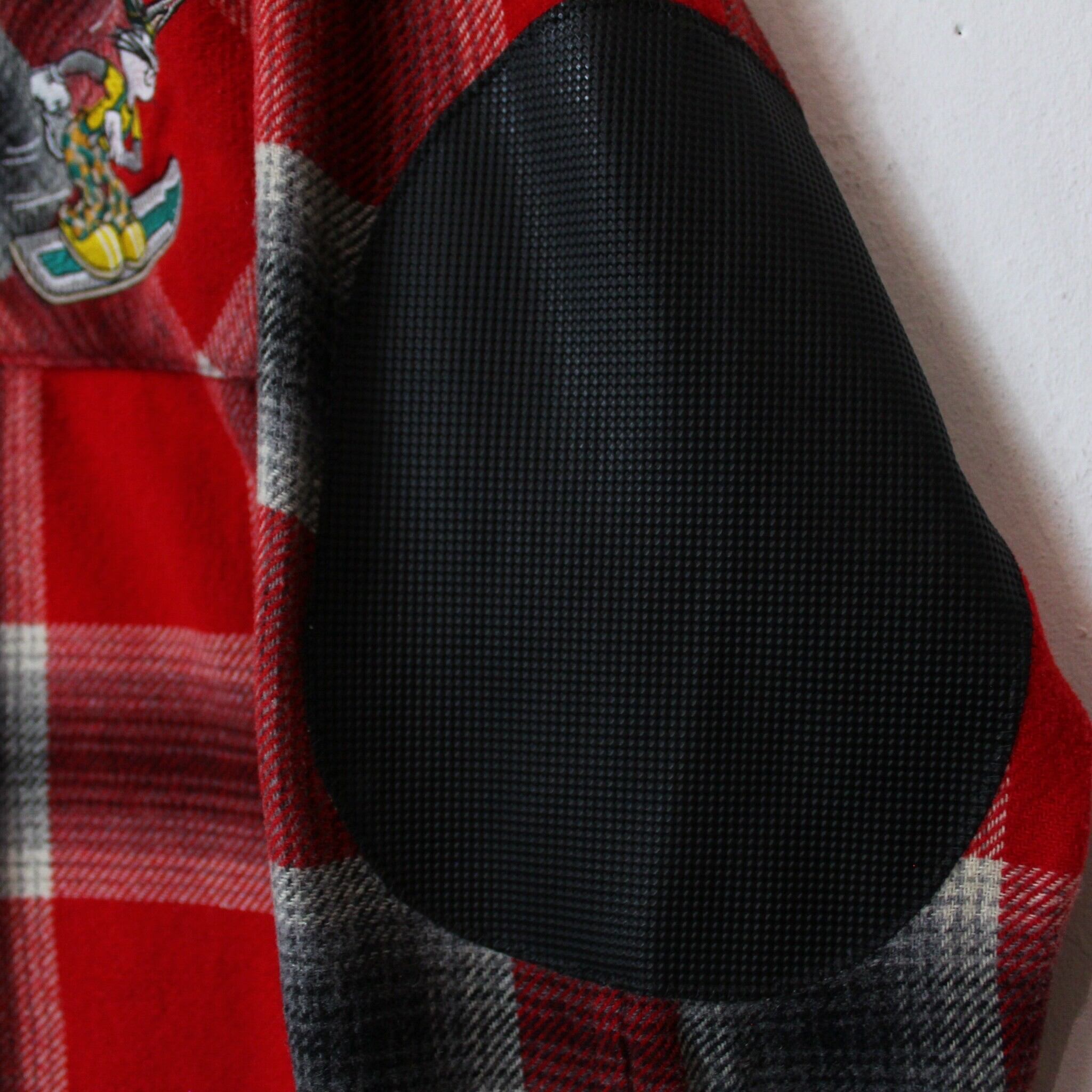赤をベースに白×黒のグラデーションの美しいオンブレチェックをON。左胸にはボードに乗るバックスバニーを刺繍で表現。