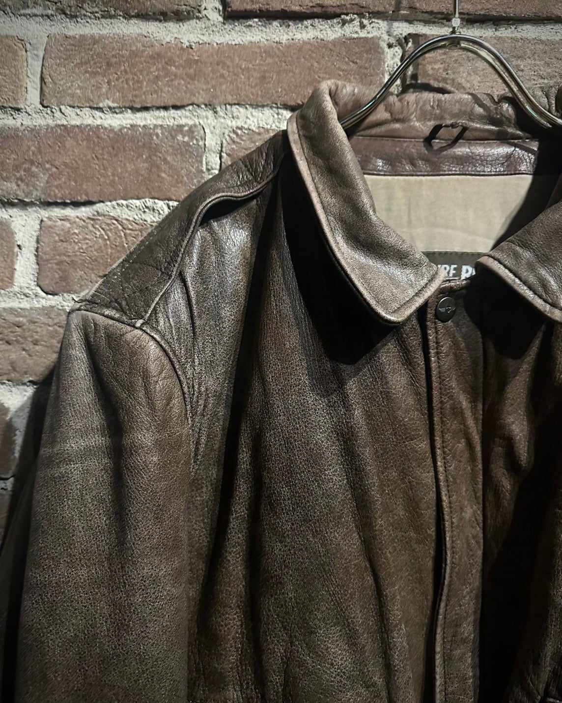 経年によるレザー特有のエイジングが味わい深く、艶やかな光沢が雰囲気を押し出すブラウンレザーにフライトジャケットの代表格である"A-2"型を落とし込んだレザージャケット。