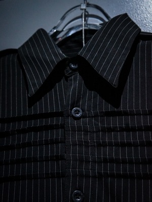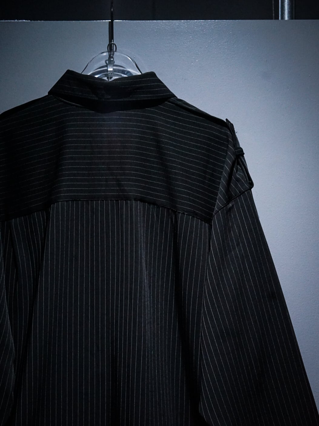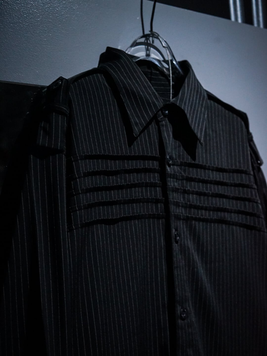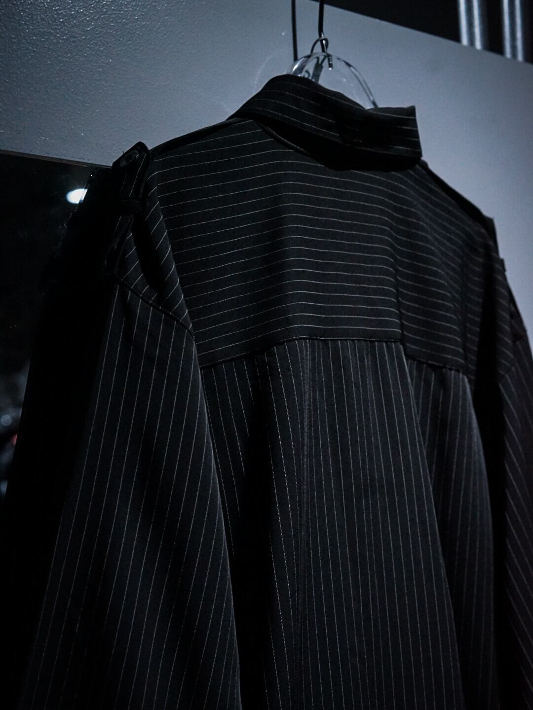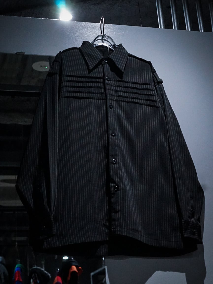 シャツは胸元にプリーツを施し、平面的なストライプ面に立体感を演出。そして肩にはエポレットを施し、シンプルながらデザインへの拘りを強く感じられます。