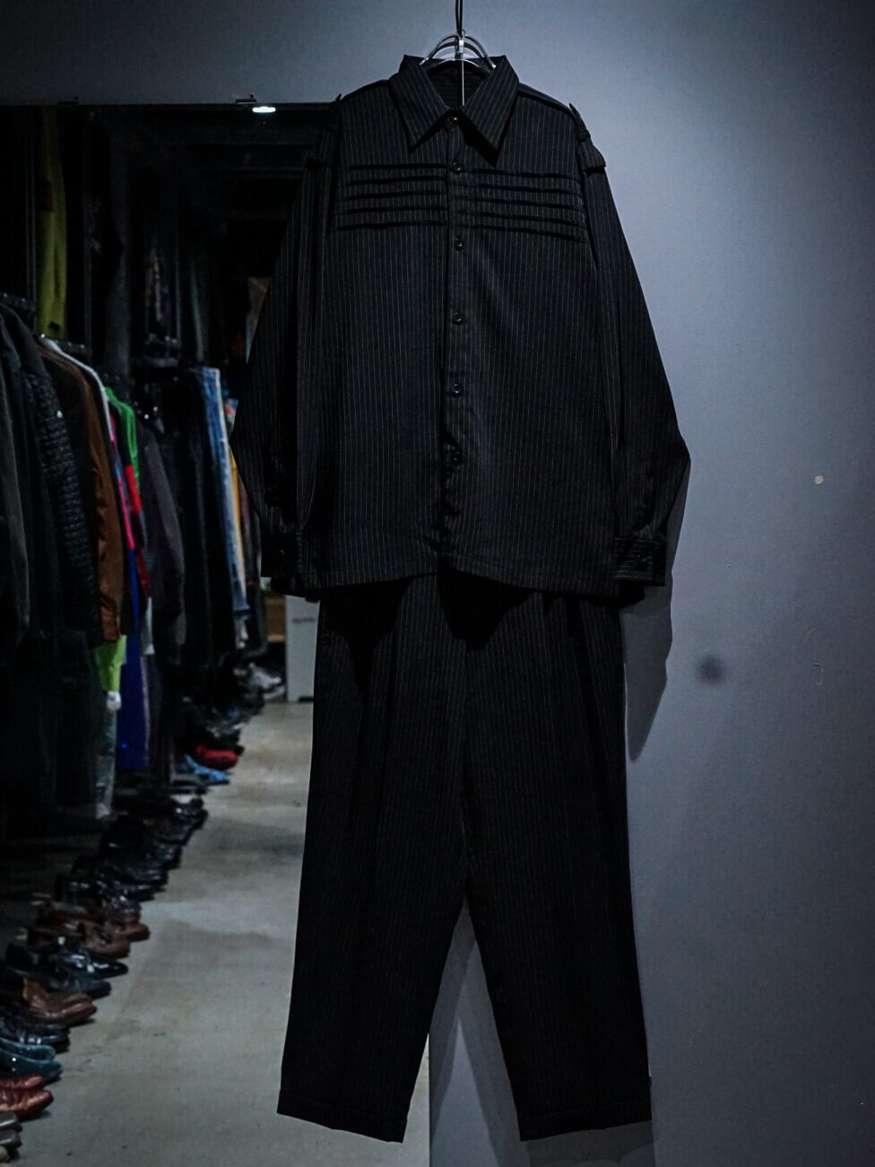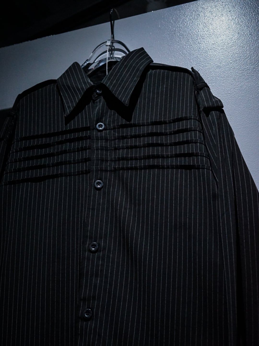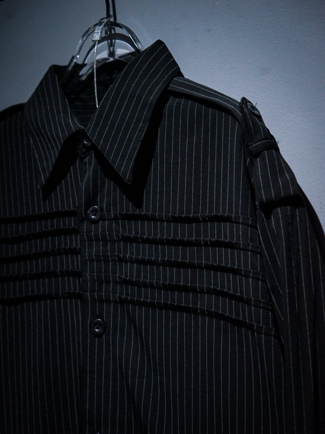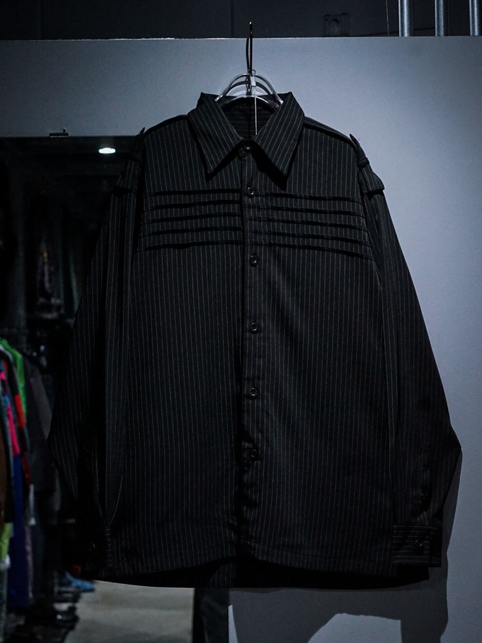 シャツは胸元にプリーツを施し、平面的なストライプ面に立体感を演出。そして肩にはエポレットを施し、シンプルながらデザインへの拘りを強く感じられます。