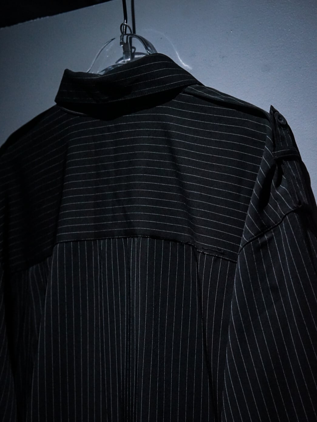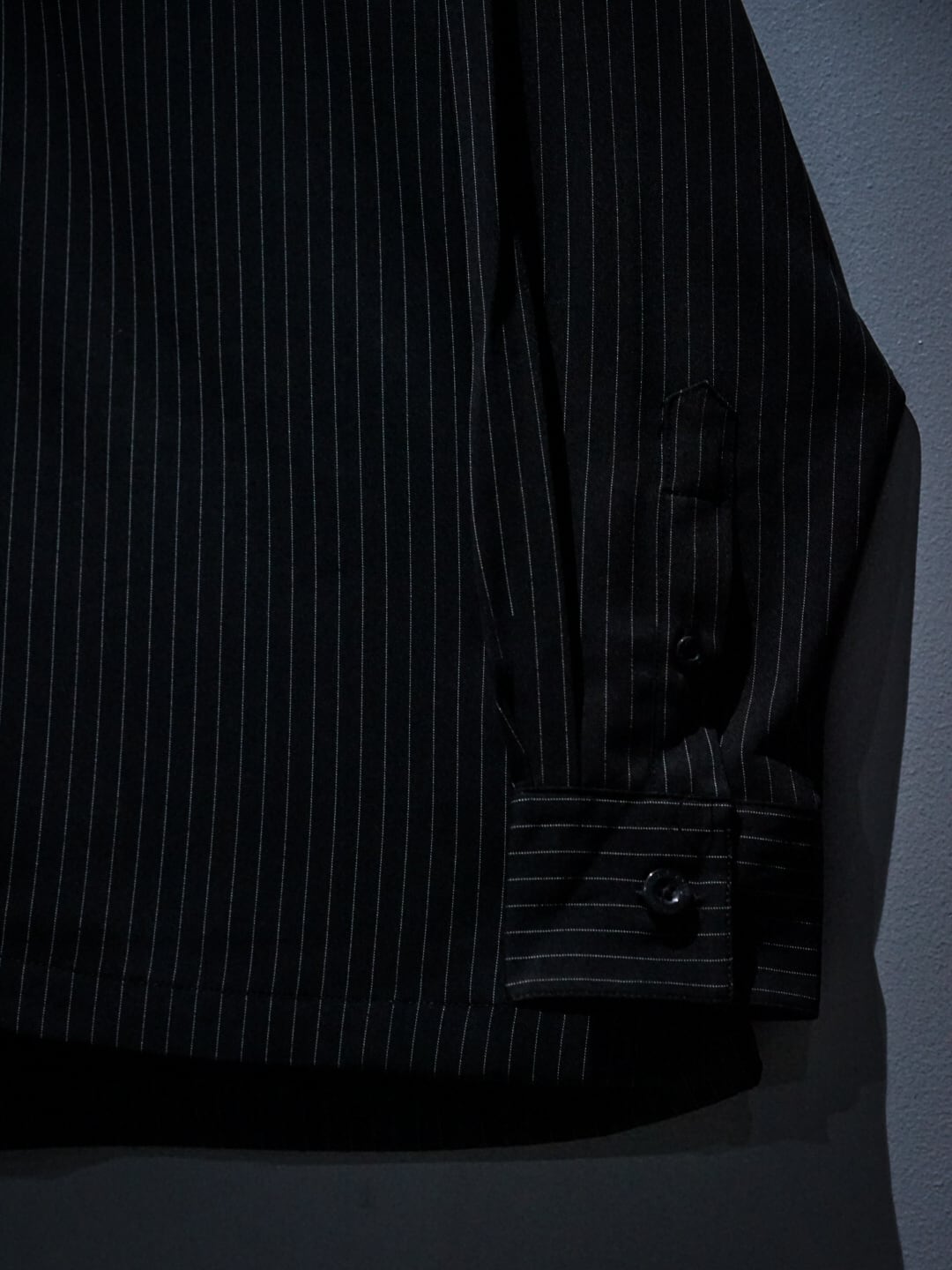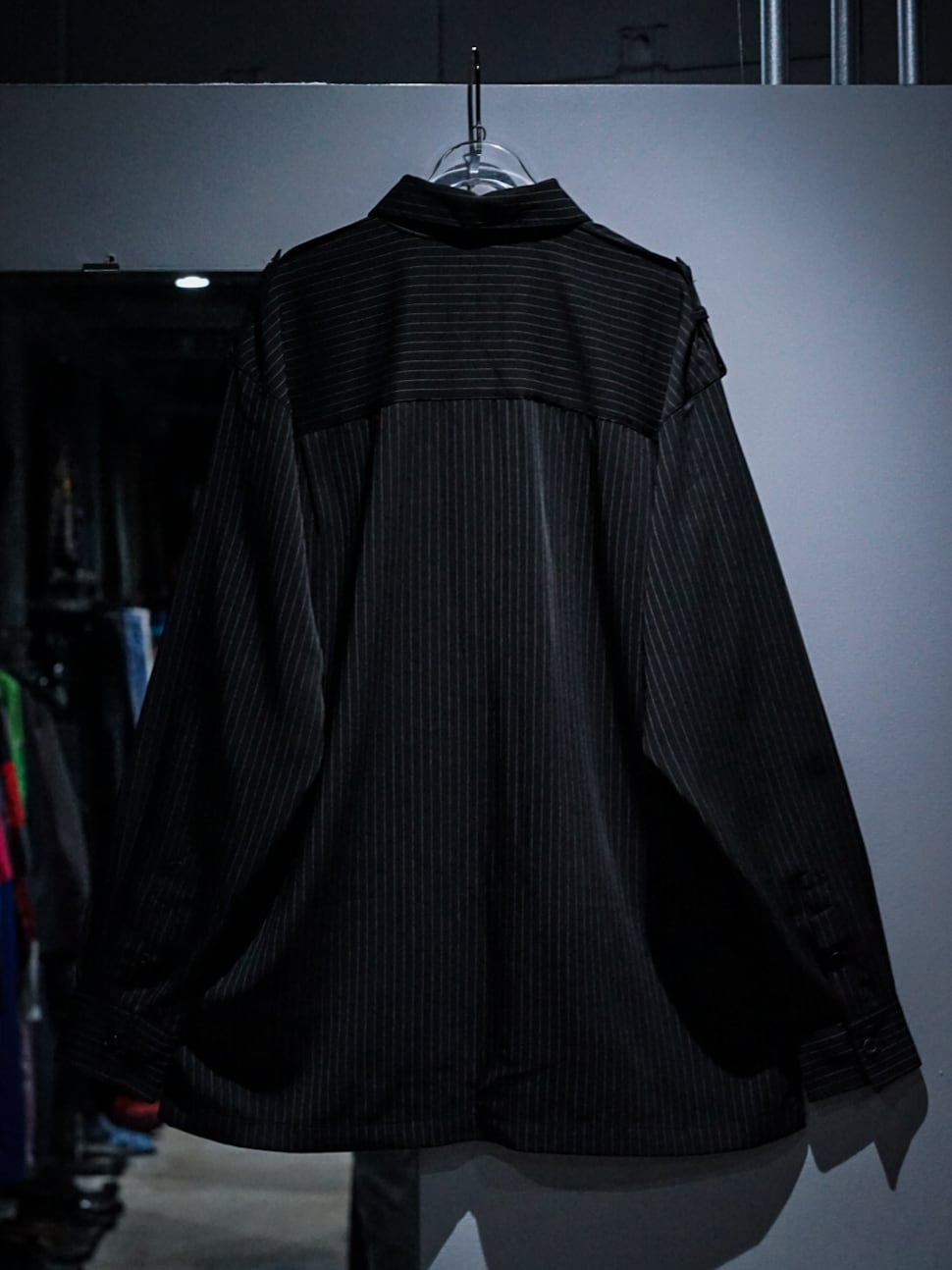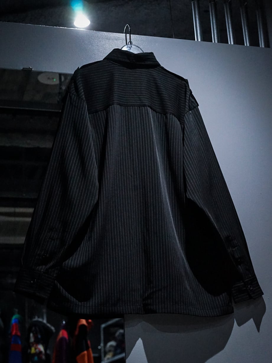 シャツは胸元にプリーツを施し、平面的なストライプ面に立体感を演出。そして肩にはエポレットを施し、シンプルながらデザインへの拘りを強く感じられます。
