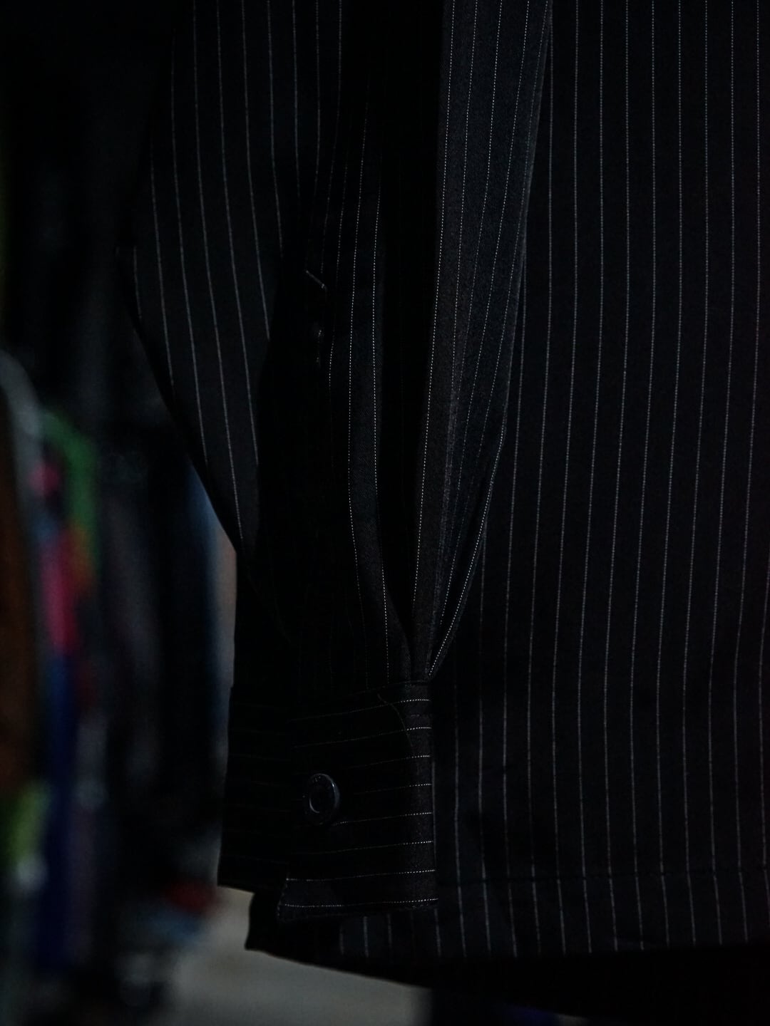 ブラックのボディをベースに繊細なホワイトのストライプを載せた1着。
