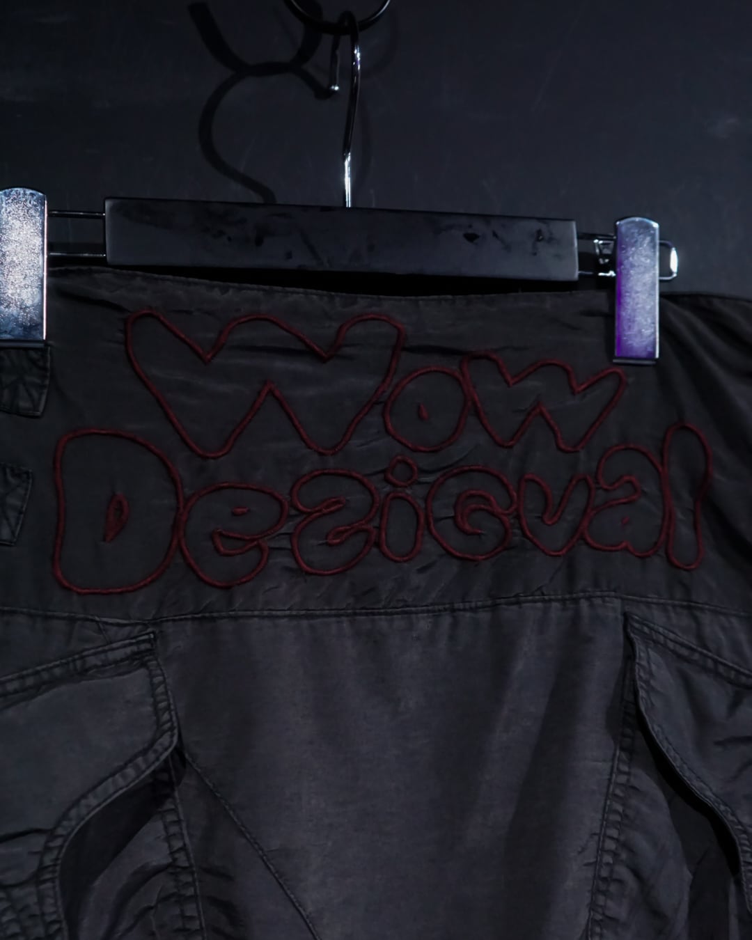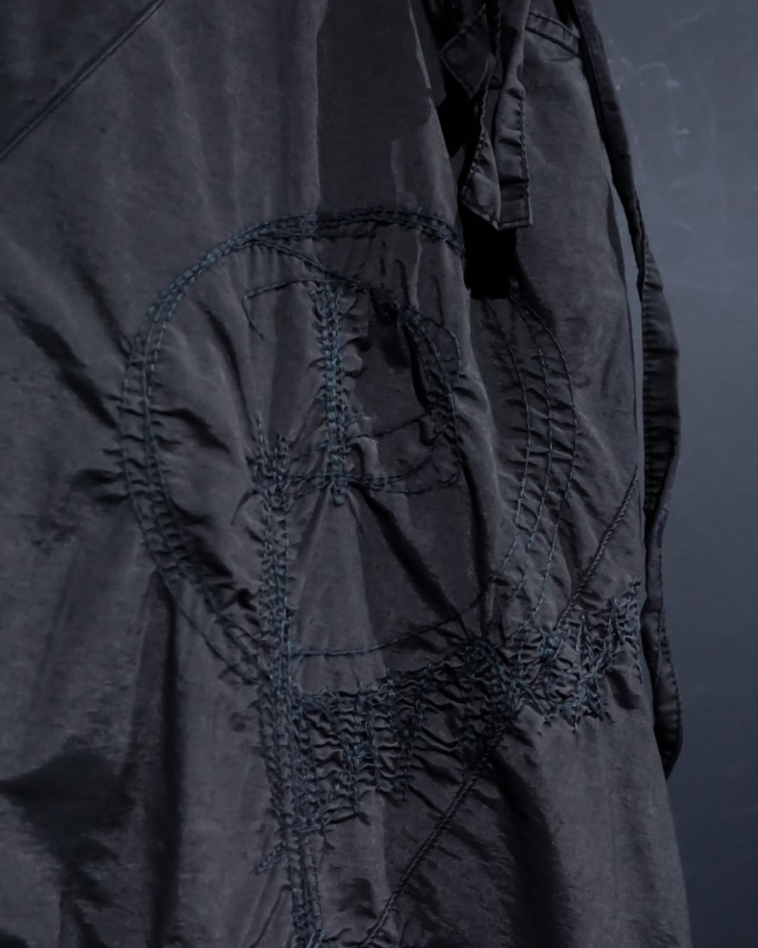 フェード感のあるボディをベースに、抽象的なデザインを刺繍で刻み、随所にギミックを載せたサルエルパンツ。