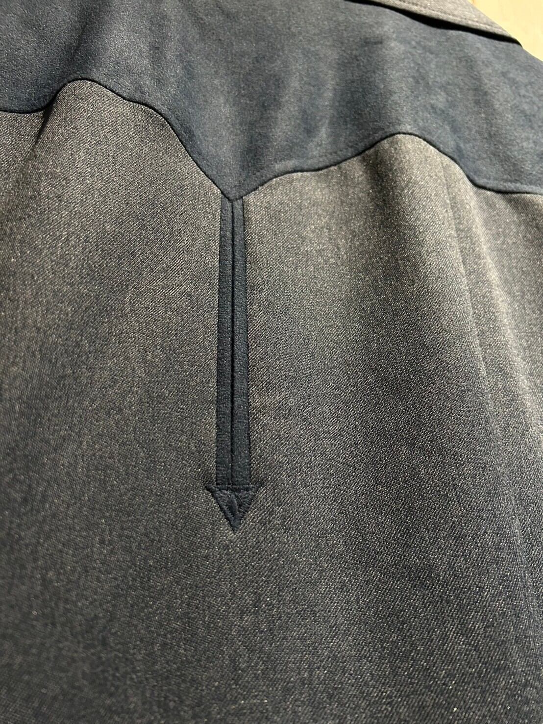 ヨーク部にはトーンを変えた起毛感のある素材での切り替えを施すことにより、ウエスタン特有のヨークの存在感を強調。後ろ身頃にはセンターベントが入っているため、着用時の機動性と立体的な美しいシルエットを確保しています。