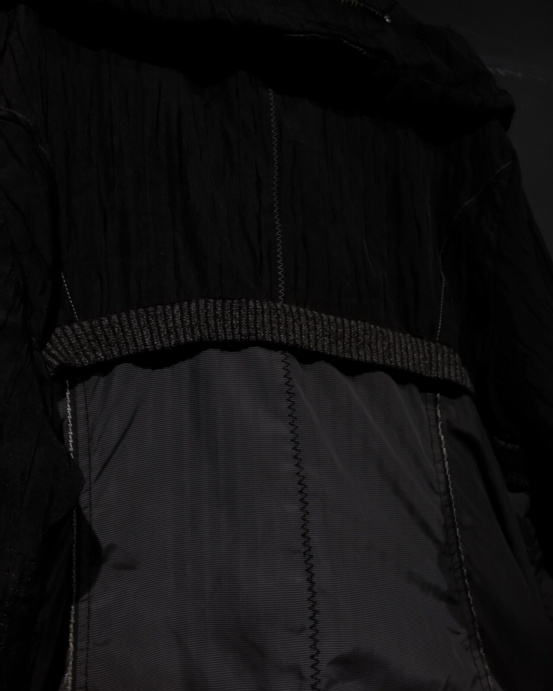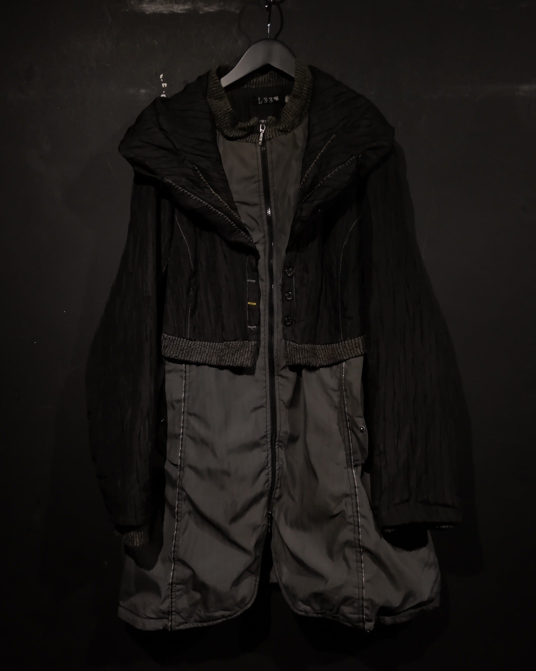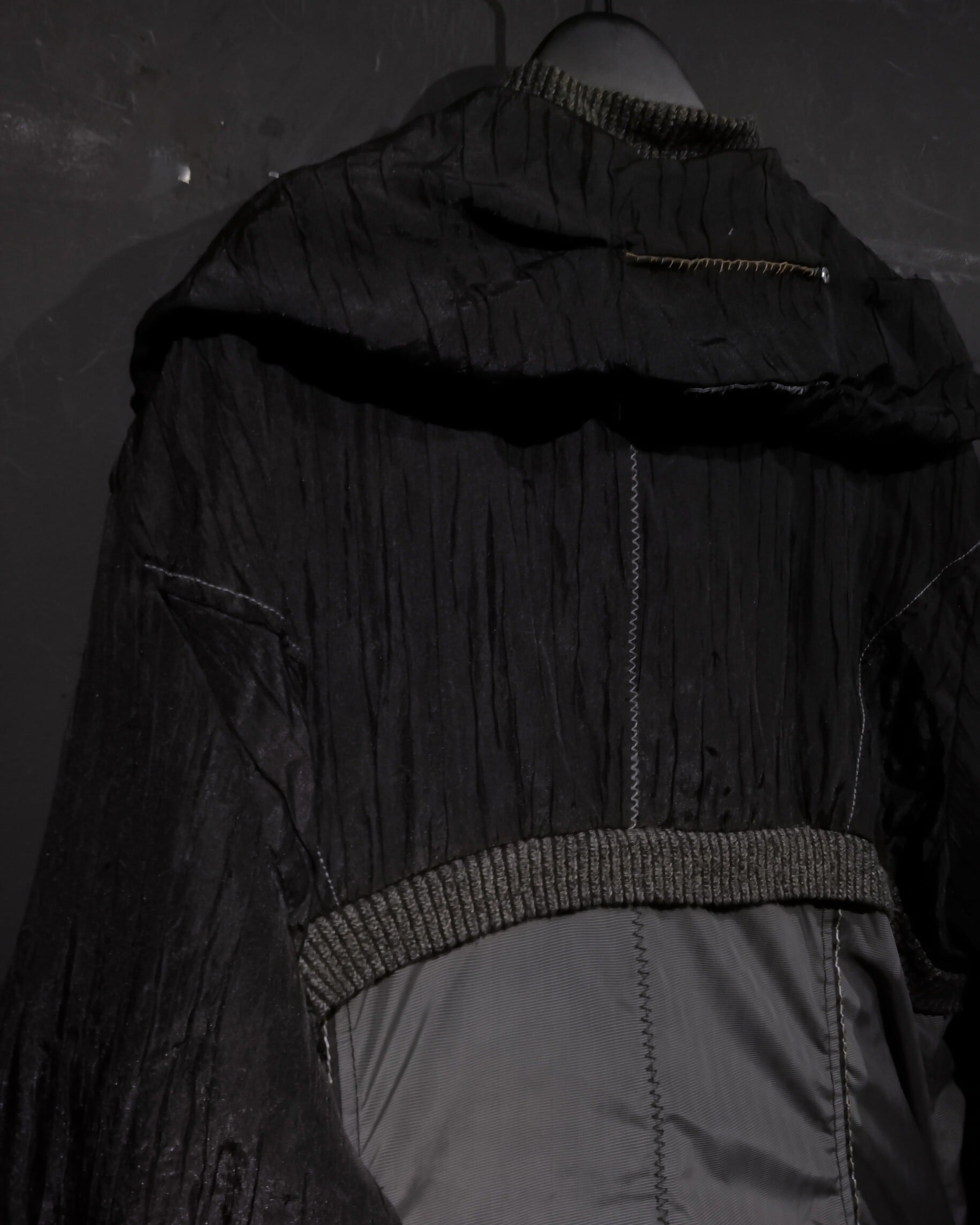 シワ加工が施されたショート丈のジャケットに、インナーにハイネックのコートをレイヤードさせたように仕上げたスペシャルな1着。