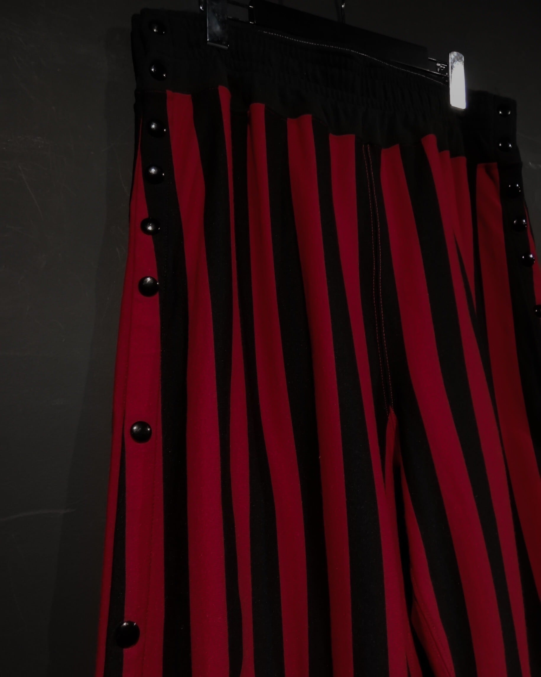 赤×黒のストライプをボディ全体に載せ、両サイドウエスト部分から裾までスナップボタンを施した、スポーティーかつモードな雰囲気を漂わせる逸品。