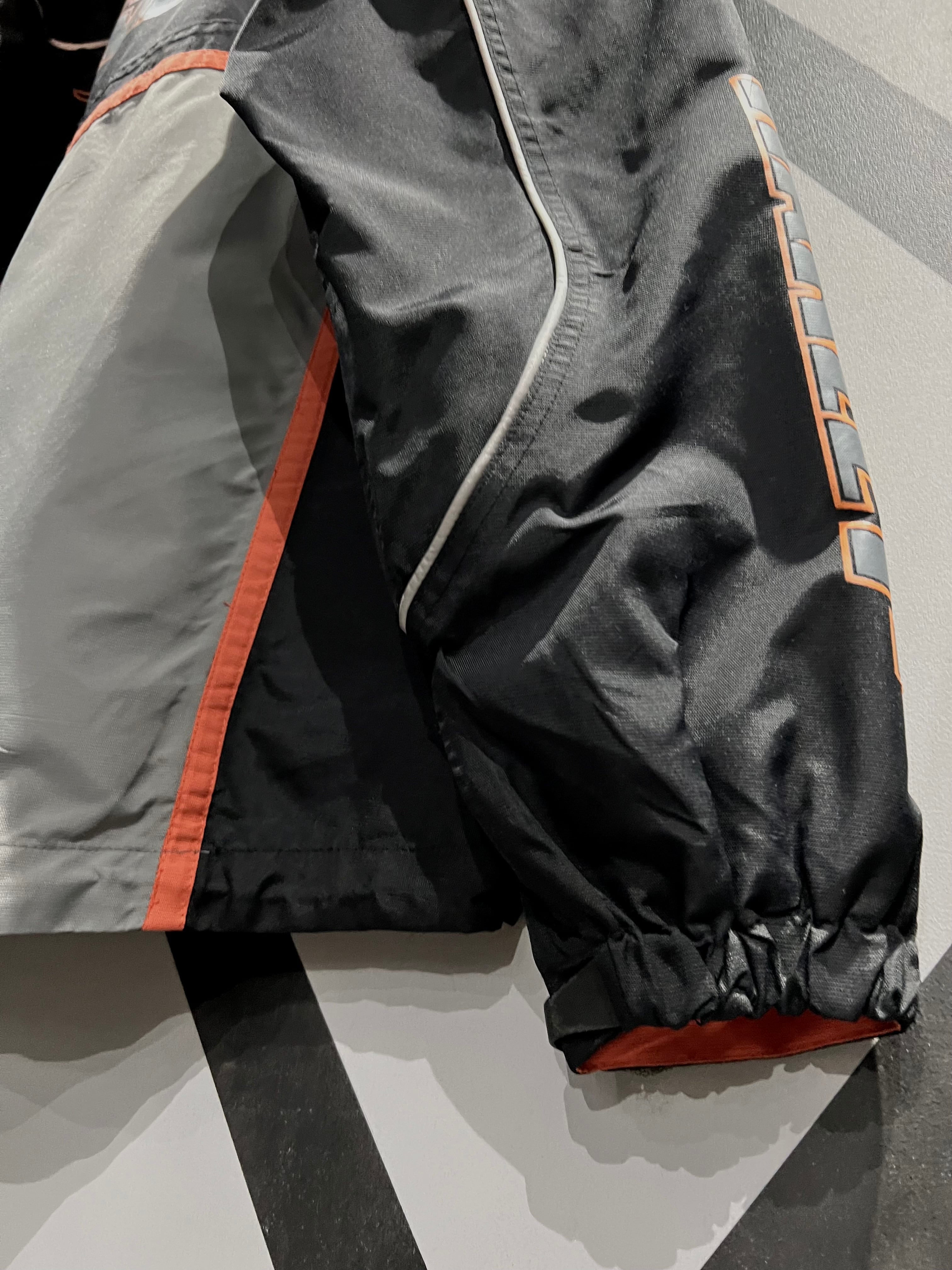 ハリのある、タフなブラックのボディにオレンジ×グレーのカラーリングで切り替え。ボディの随所にブランドロゴを載せたレーシングギアジャケット。