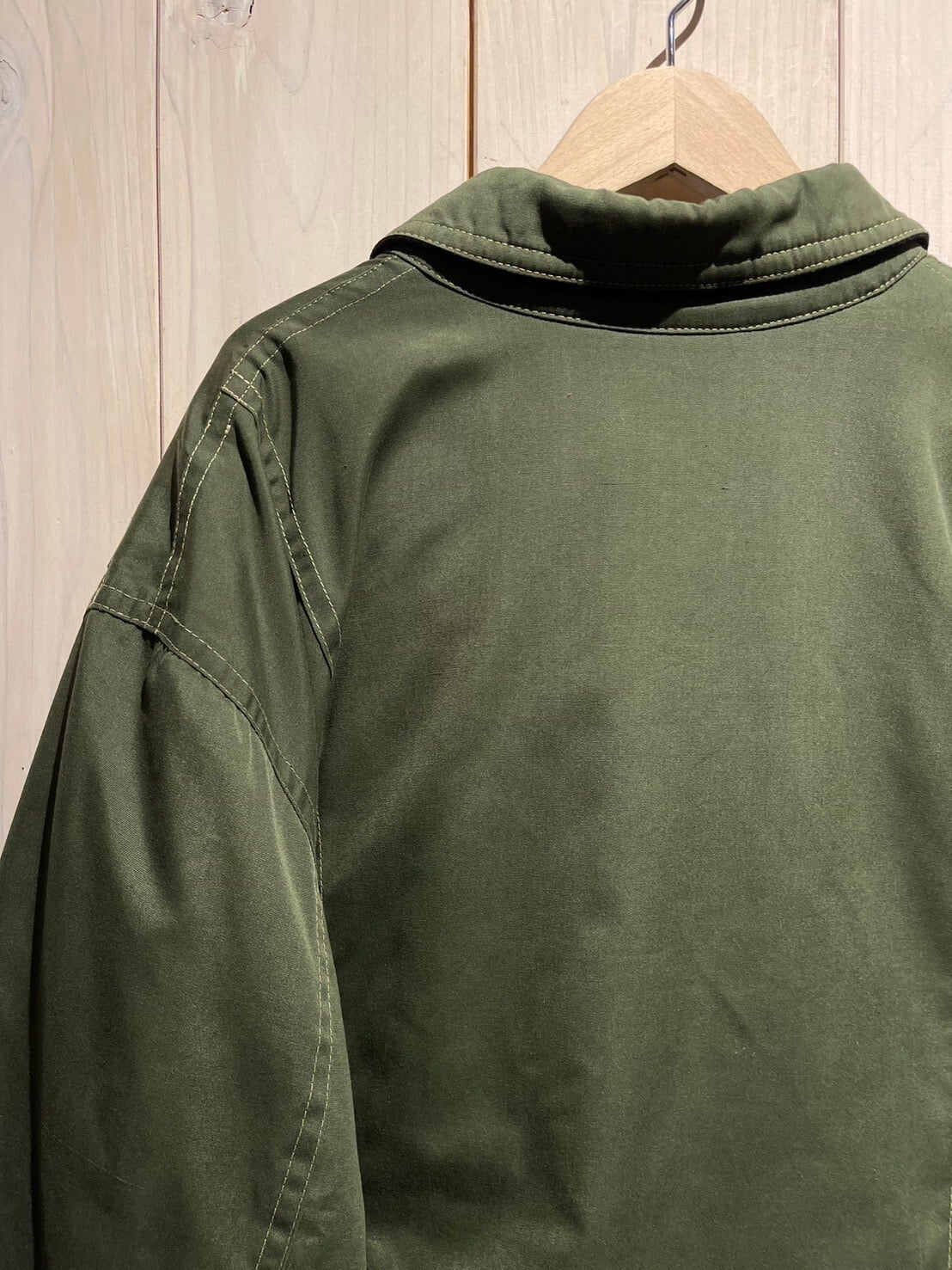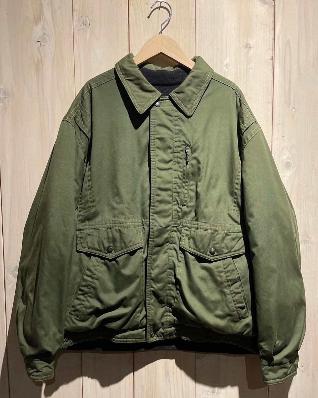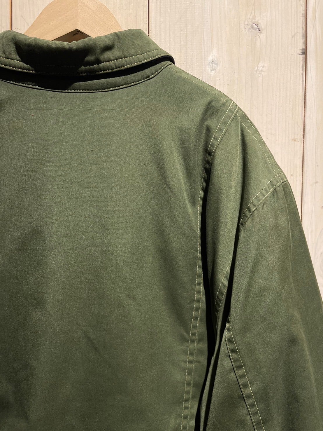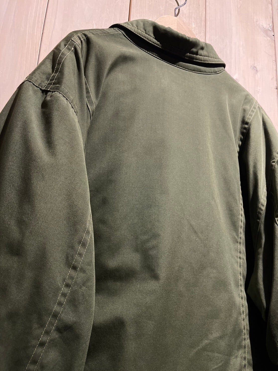 ミリタリーカーキのボディに、両サイドに配された大判なフラップポケットに、比翼仕立てのフロント、袖口や裾に施されたリブなど、フライトジャケットの名作、A-2で見られるディテールを落とし込んだジャケット。