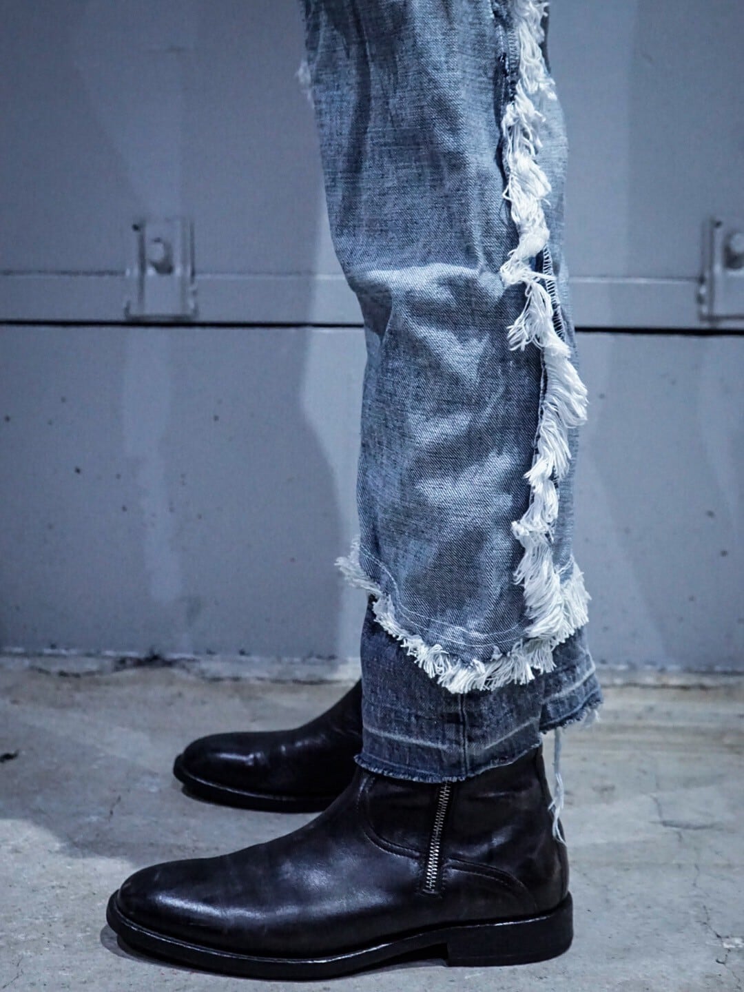 切り替え部分は、デニム生地の断ちはしの糸を一本一本解き、フリンジ状に表現。全体に深い奥行きが生まれる絶妙なバランスに落とし込まれています。