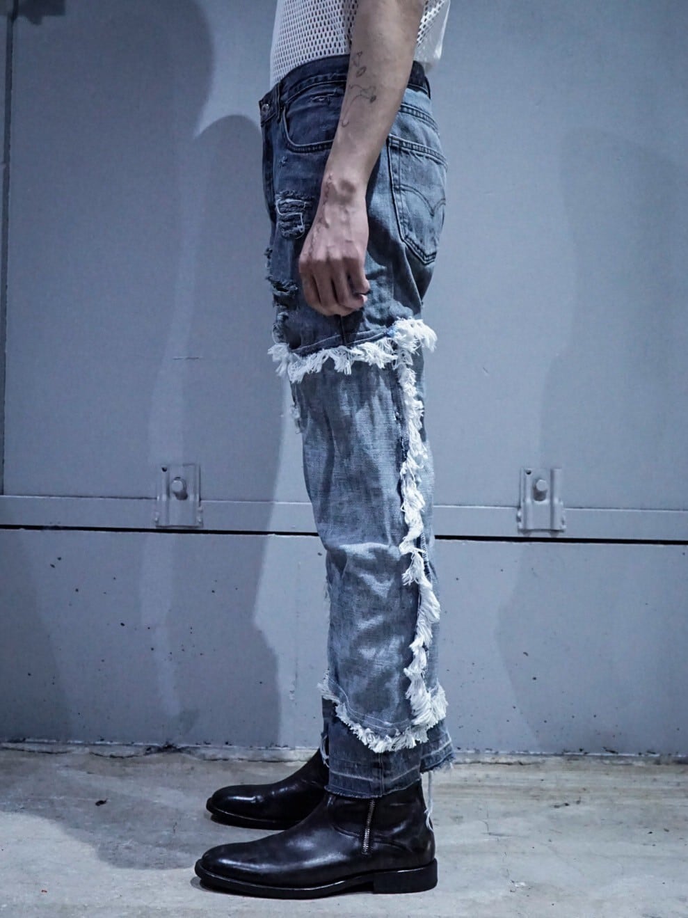 そしてボディ本体にはボロの加工。デニムの風合いにデザインがマッチして生まれた退廃感がめちゃくちゃ良い、、、