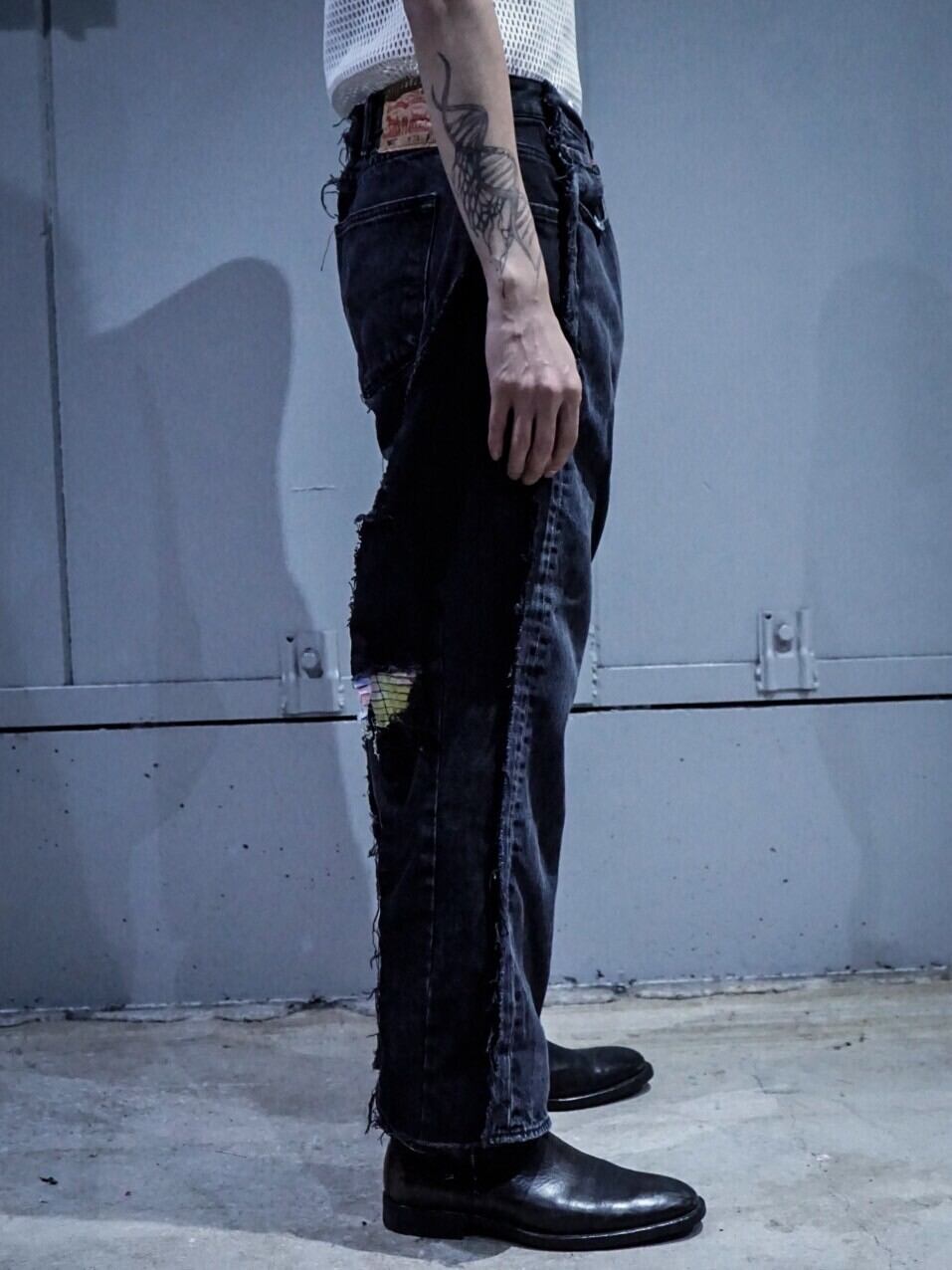 ボディサイドにトーンの異なるブラックデニムを切り替え、元のボディよりもワイド目にリサイズ。
