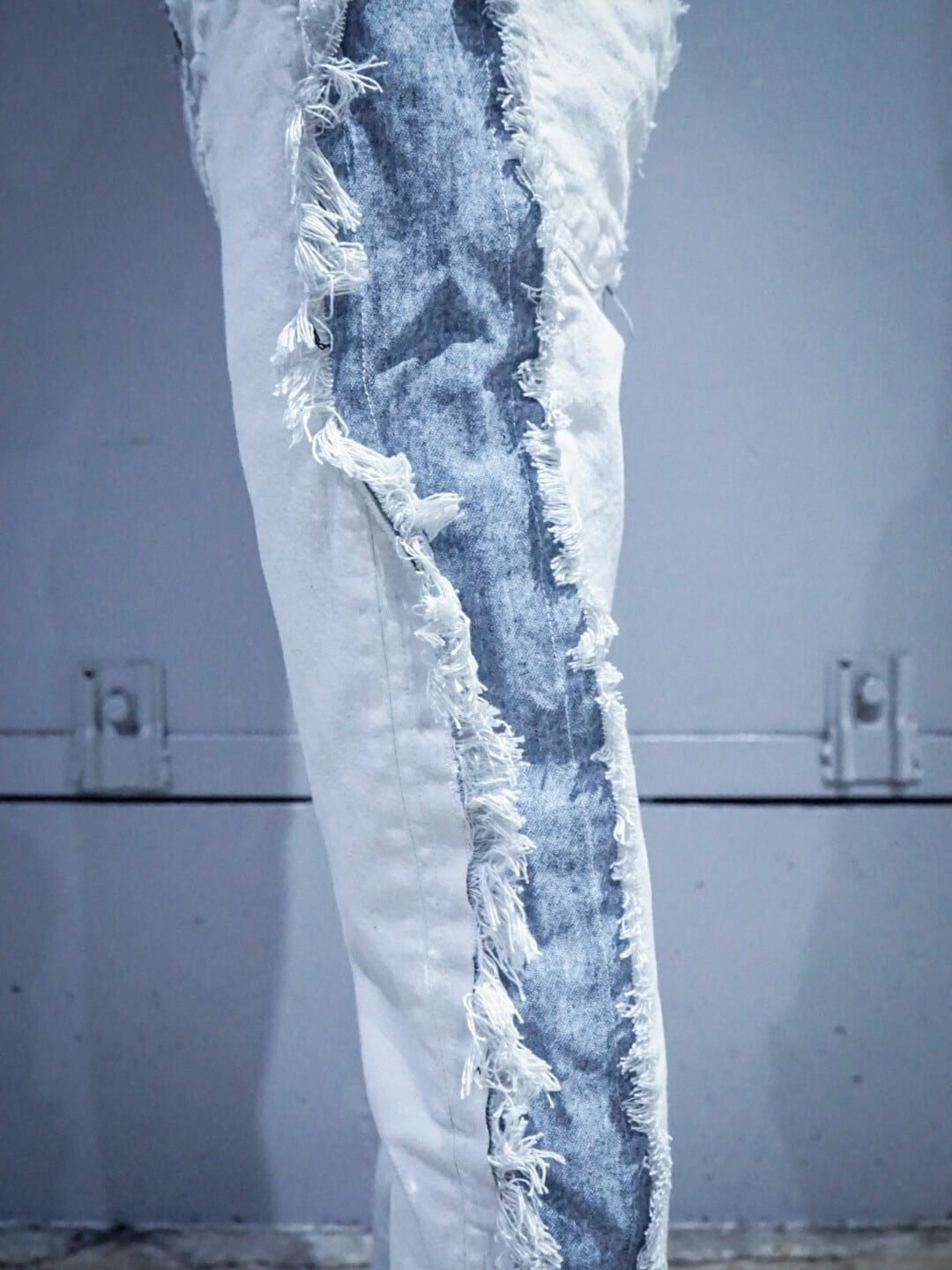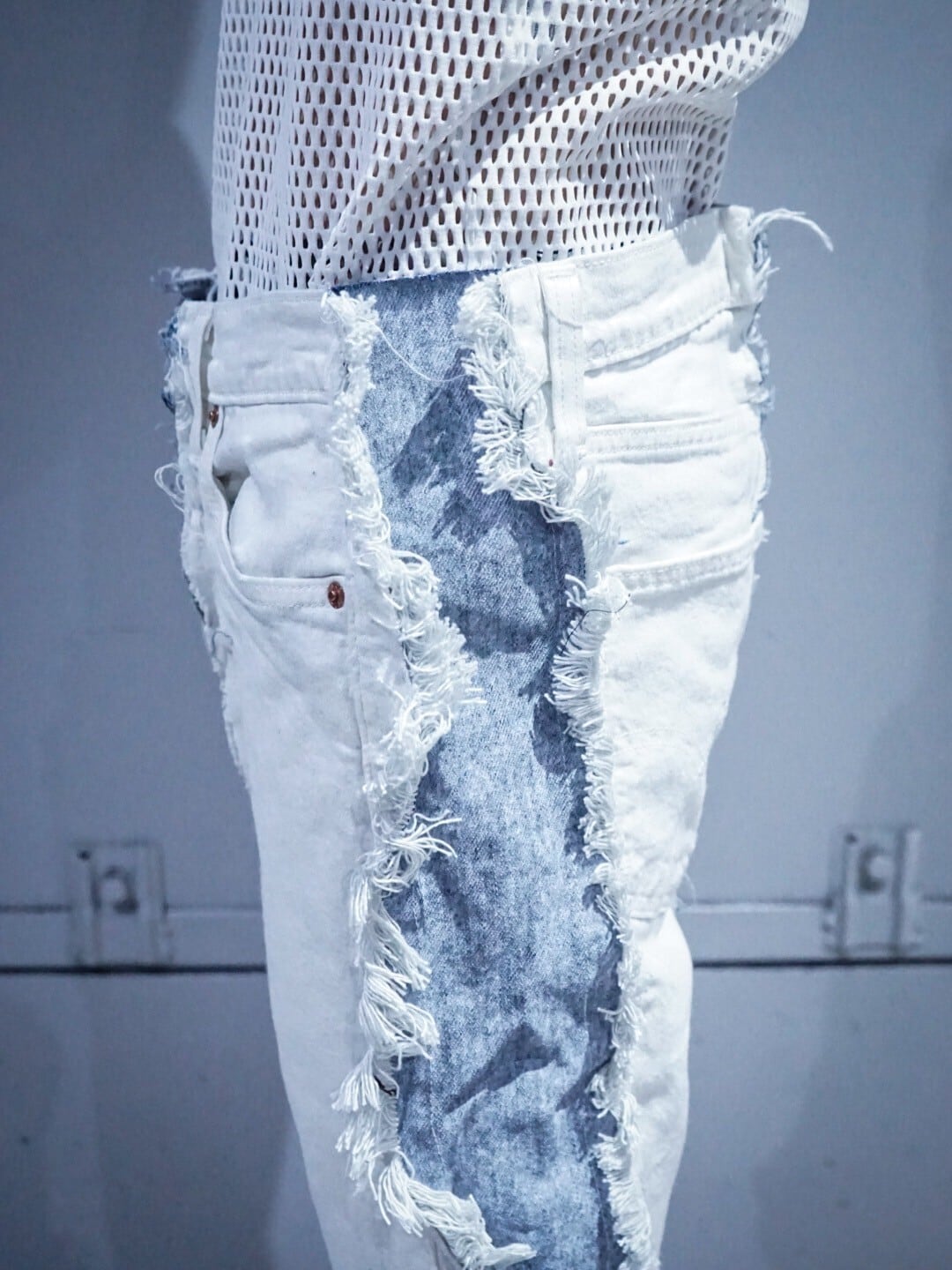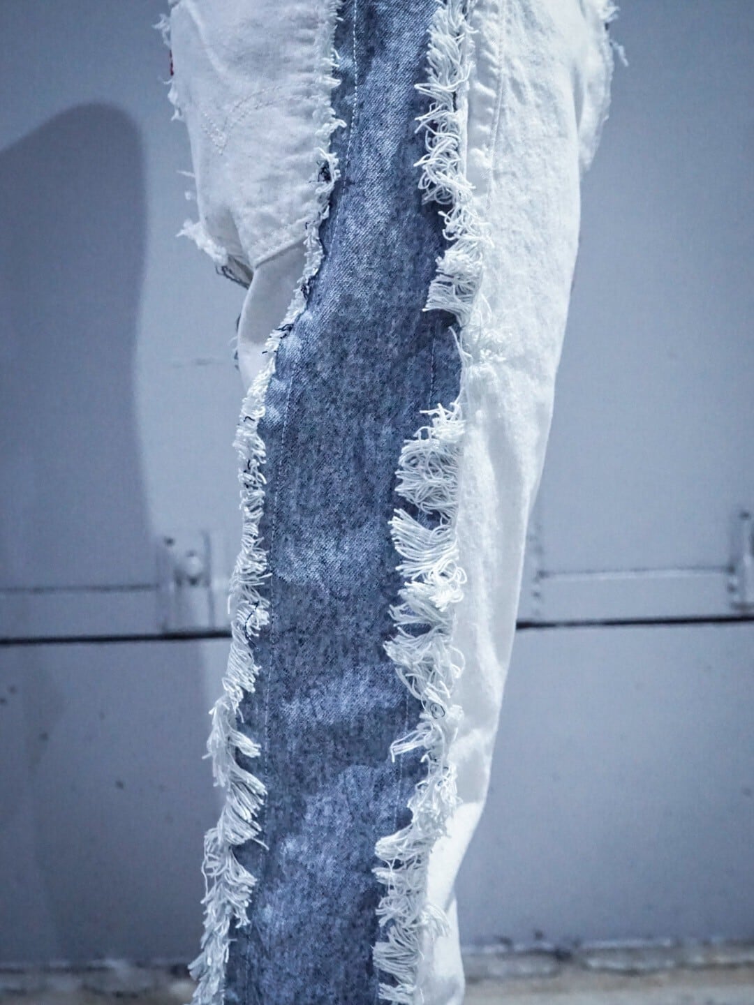 ホワイトジーンズをベースとし、レディースのジャケットに用いられるパネルパターンを施し、シルエットを改造したスペシャルなOriginal Remakeの1本。