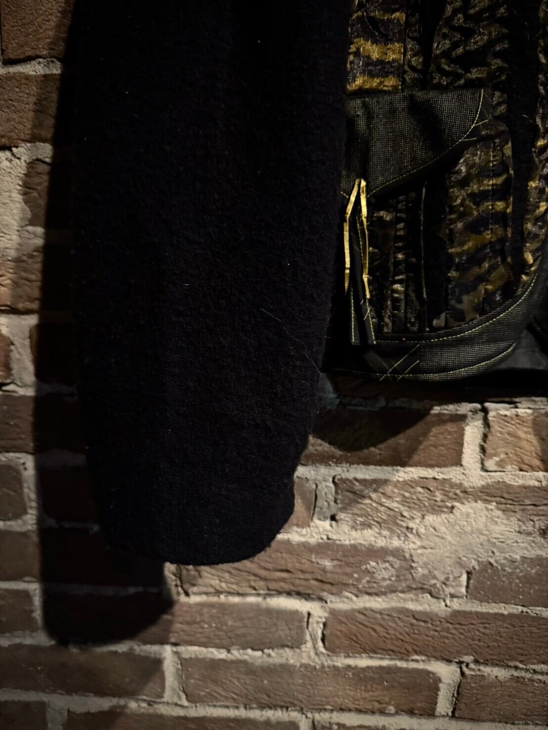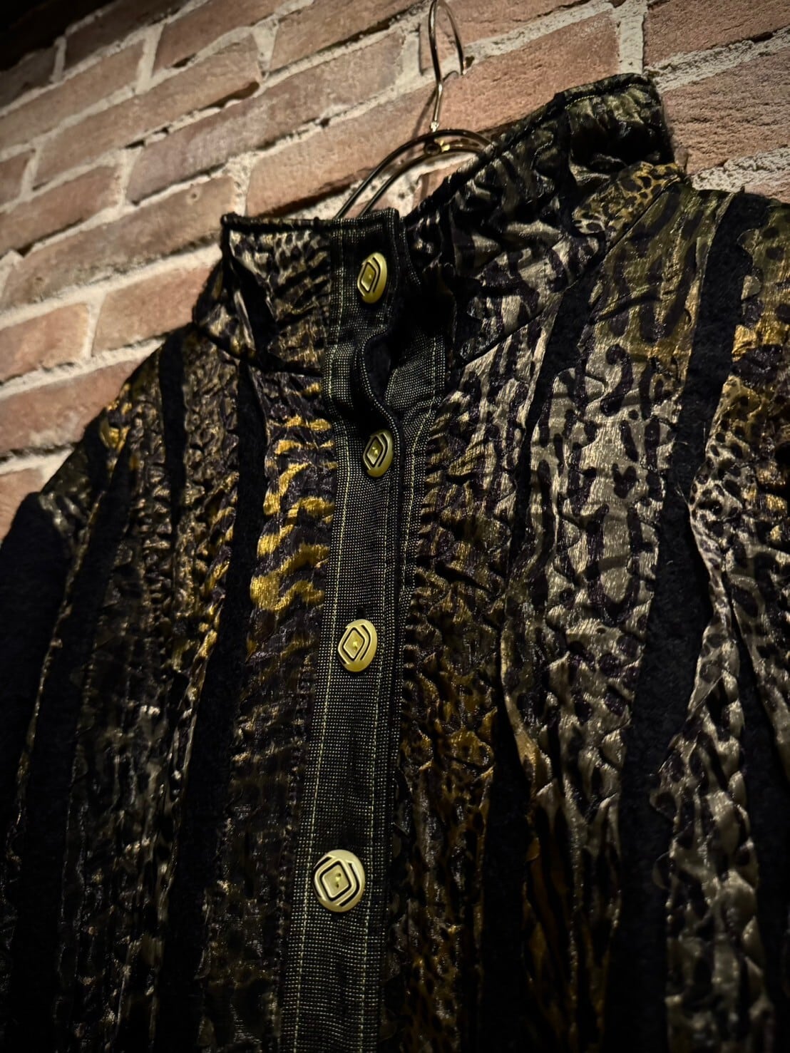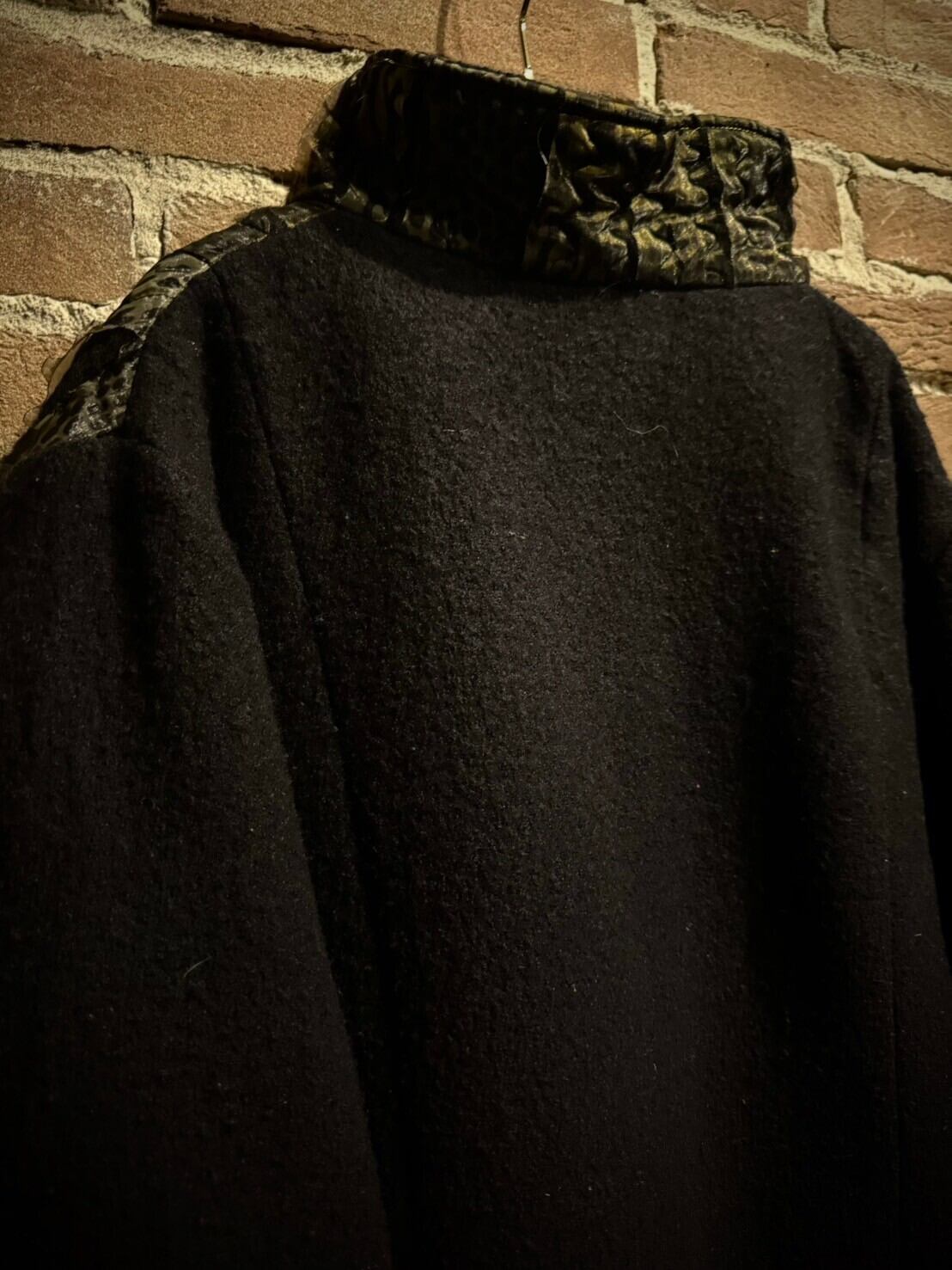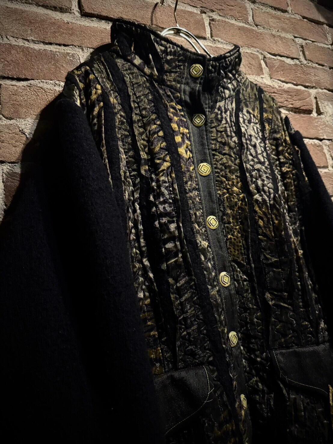 フワッと柔らかなブラックのウールを用いたボディに、フロント身頃や首元にアニマル柄を切り替えた、モードかつラグジュアリーな雰囲気を漂わせるジャケット。