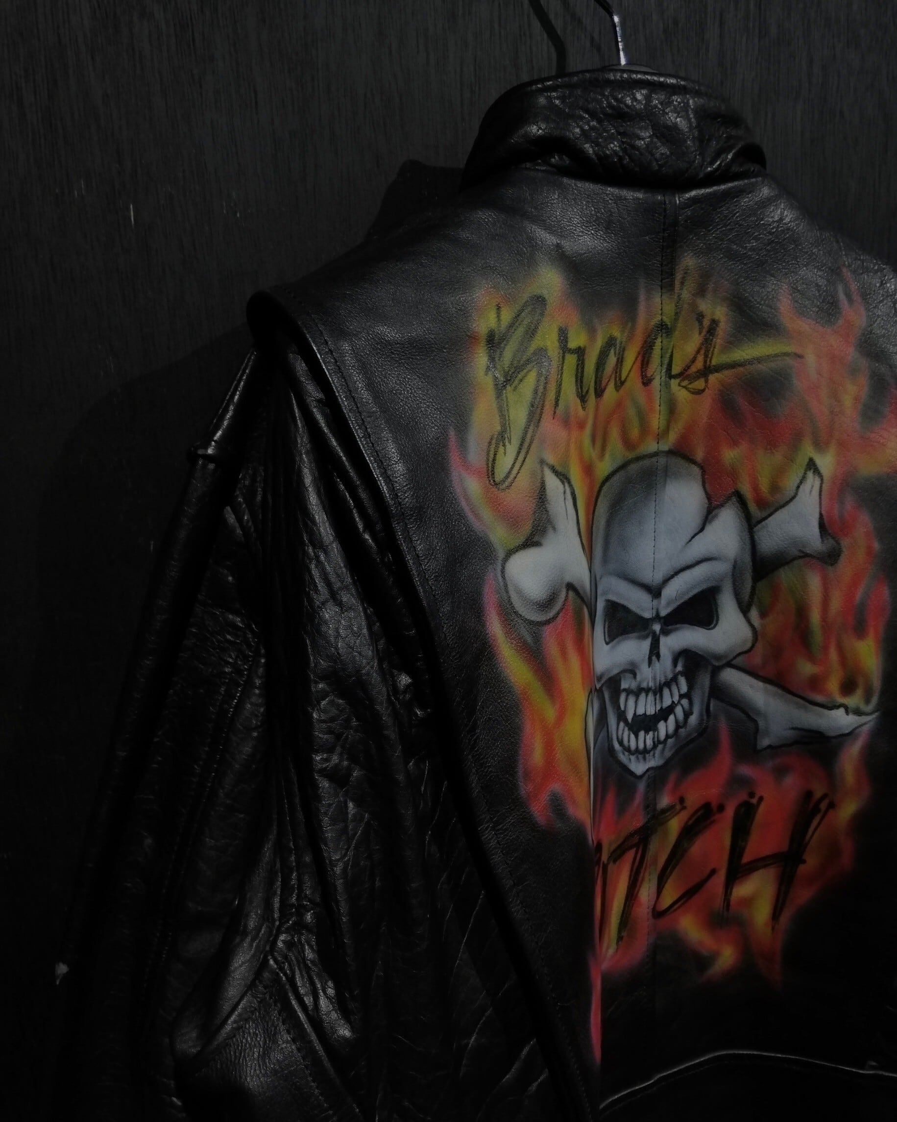 ハリとしなやかさを併せ持った上質なブラックレザーを用いたシングルライダースを使用し、背面にエアブラシによる前所有者のペイントカスタムが加えられた唯一無二な一点モノ。