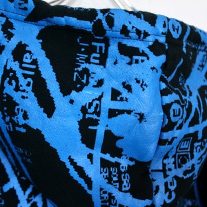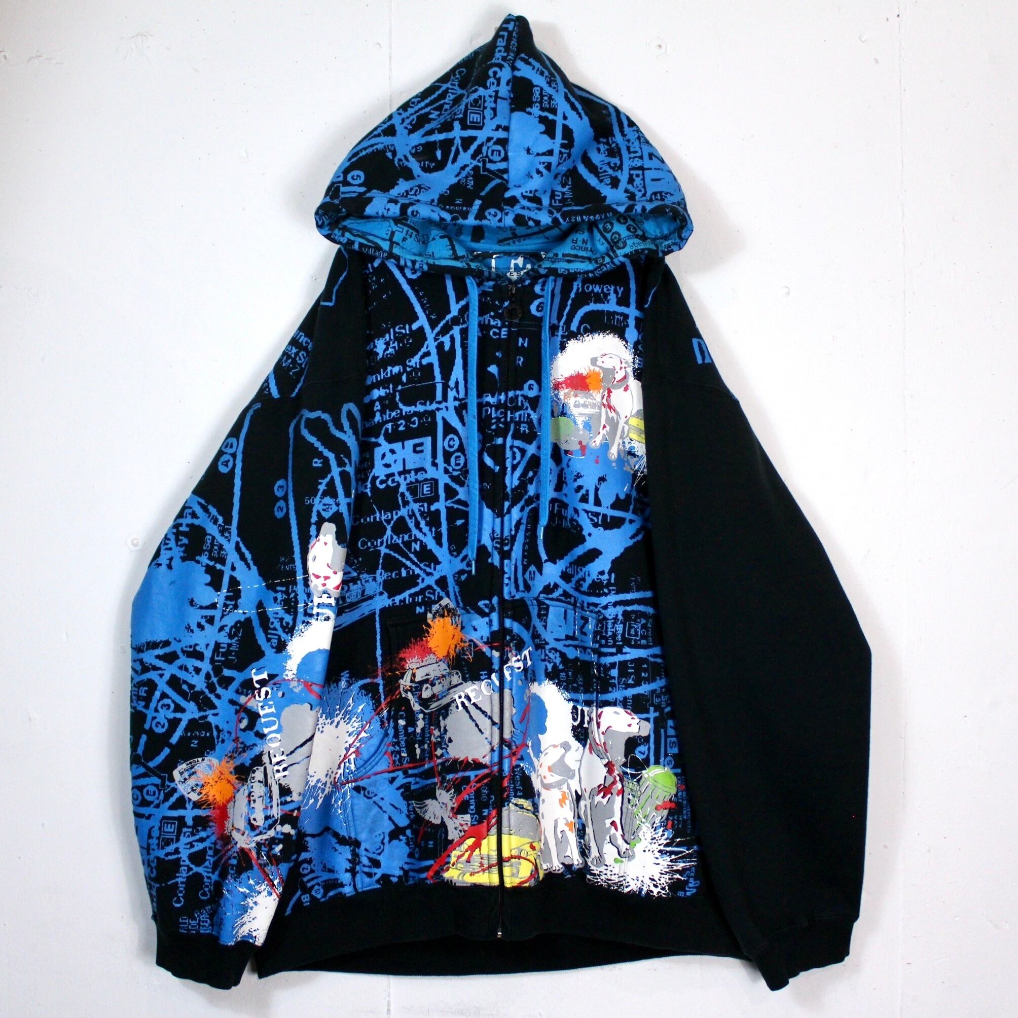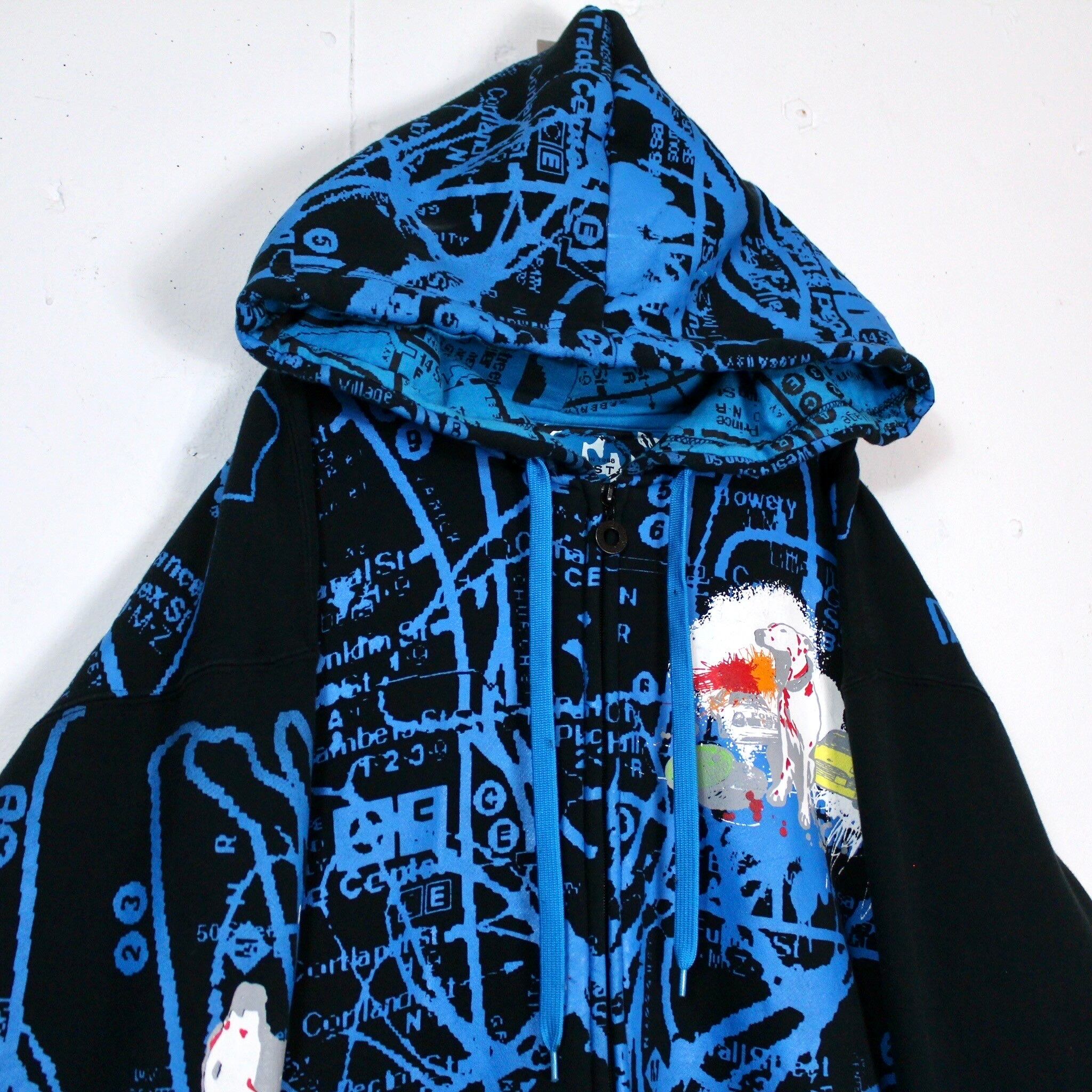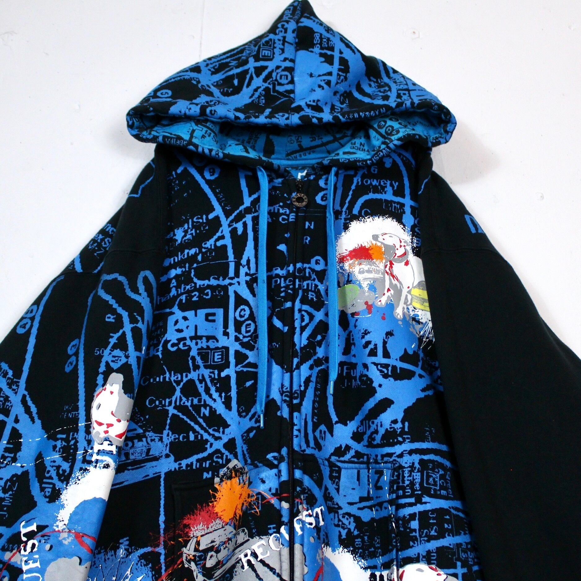 ブラックのボディをベースに、レタリング、犬や車などをストリート風のデザインに落とし込んだ、当店らしい雰囲気を纏ったジップアップフーディ。