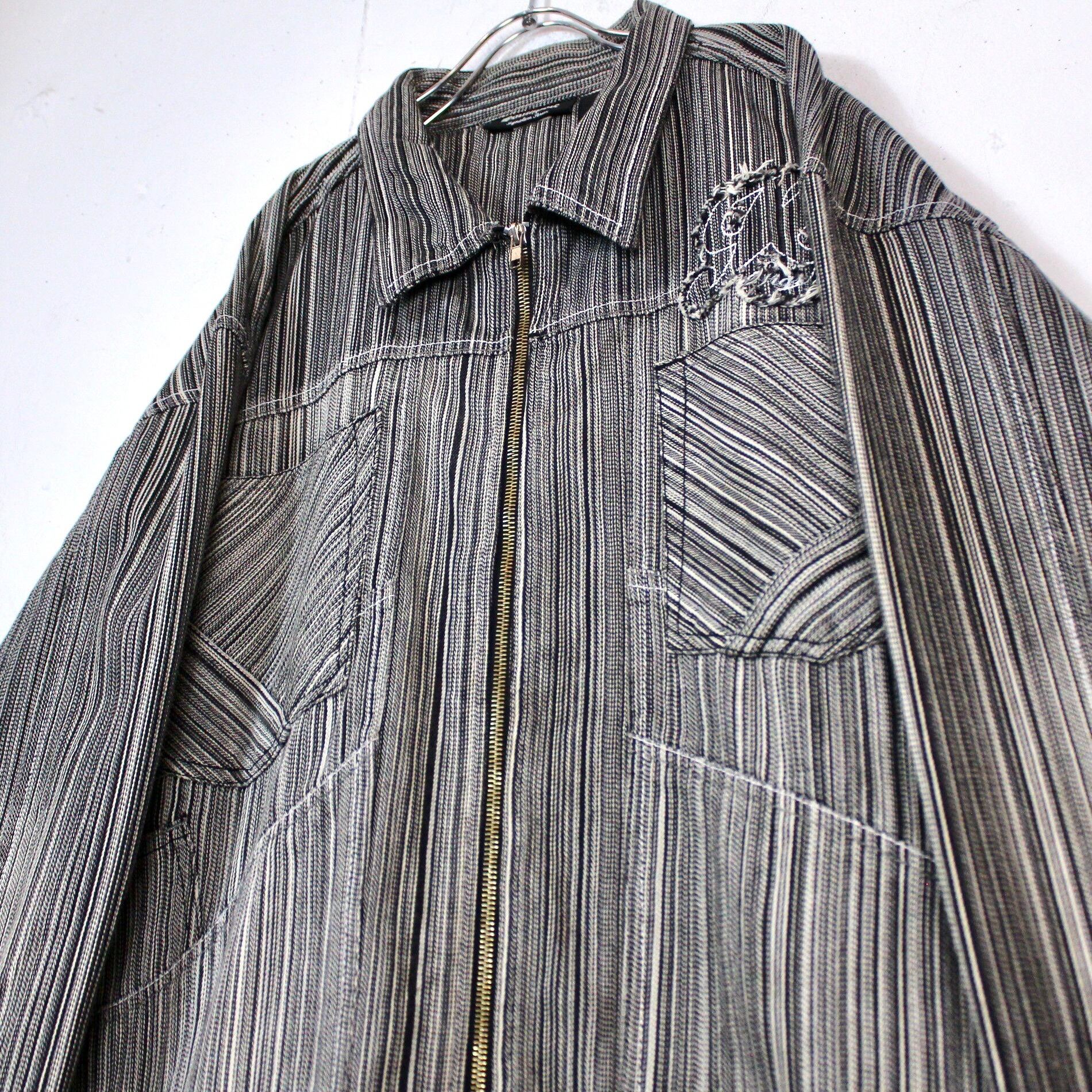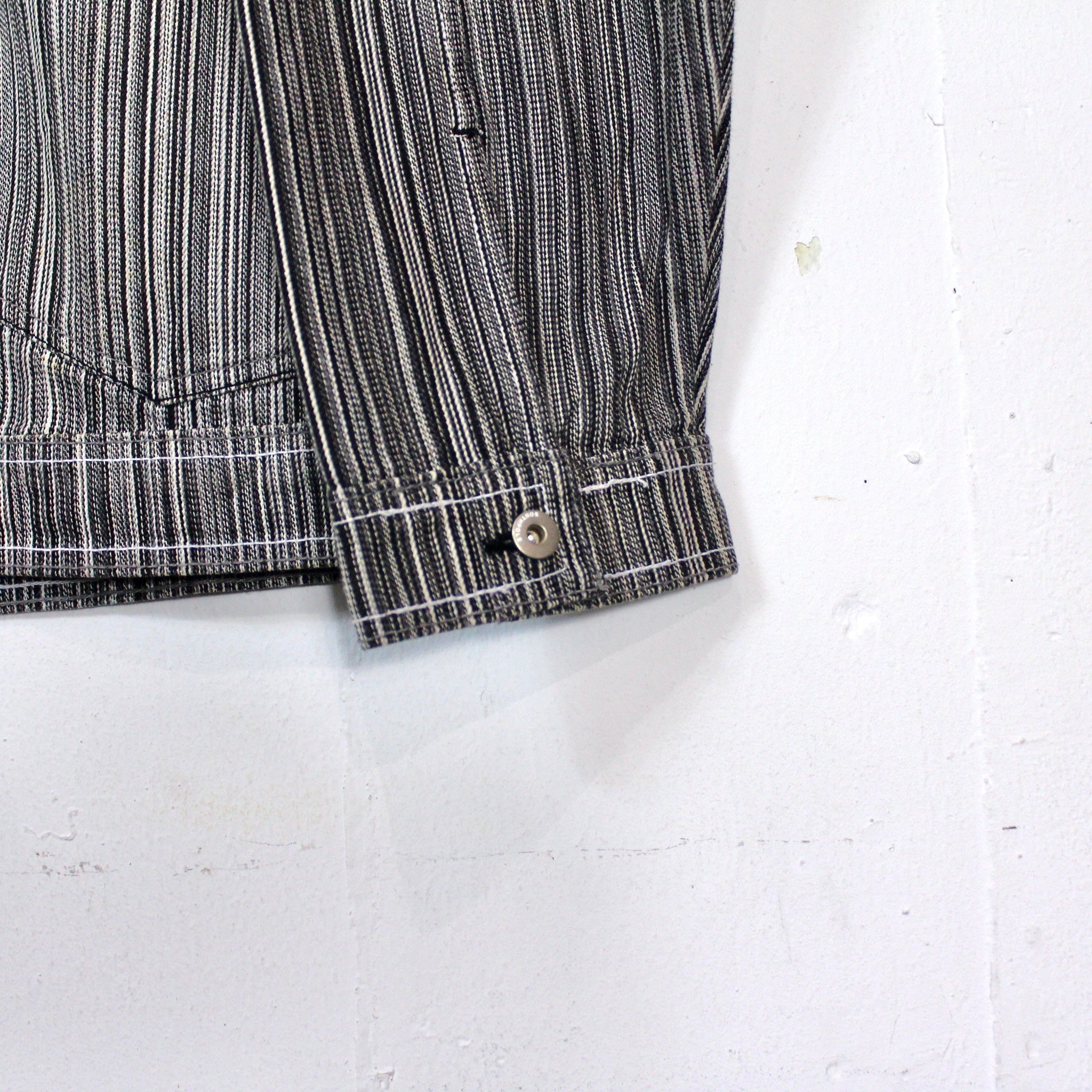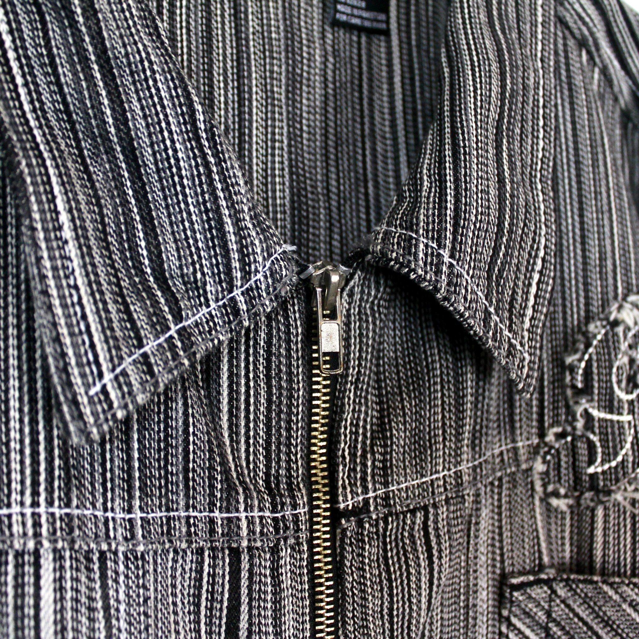 白、グレー、黒のモノトーンのカラーリングの糸を用いて、絶妙なフェード感を表現したデニムジャケット。