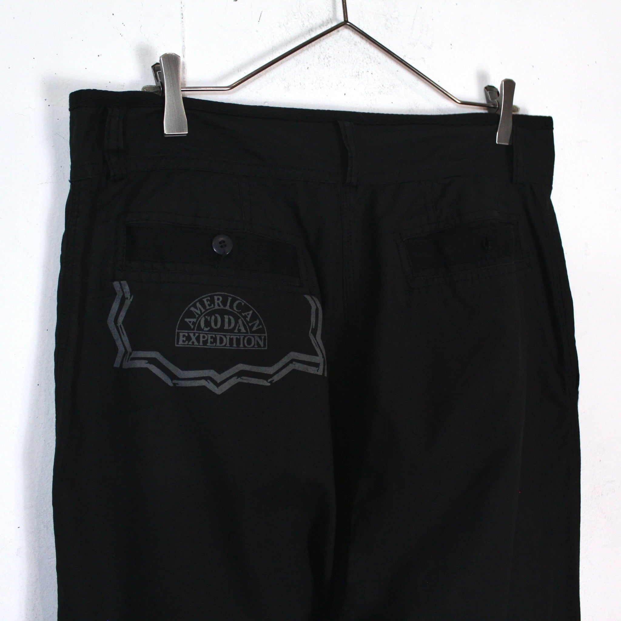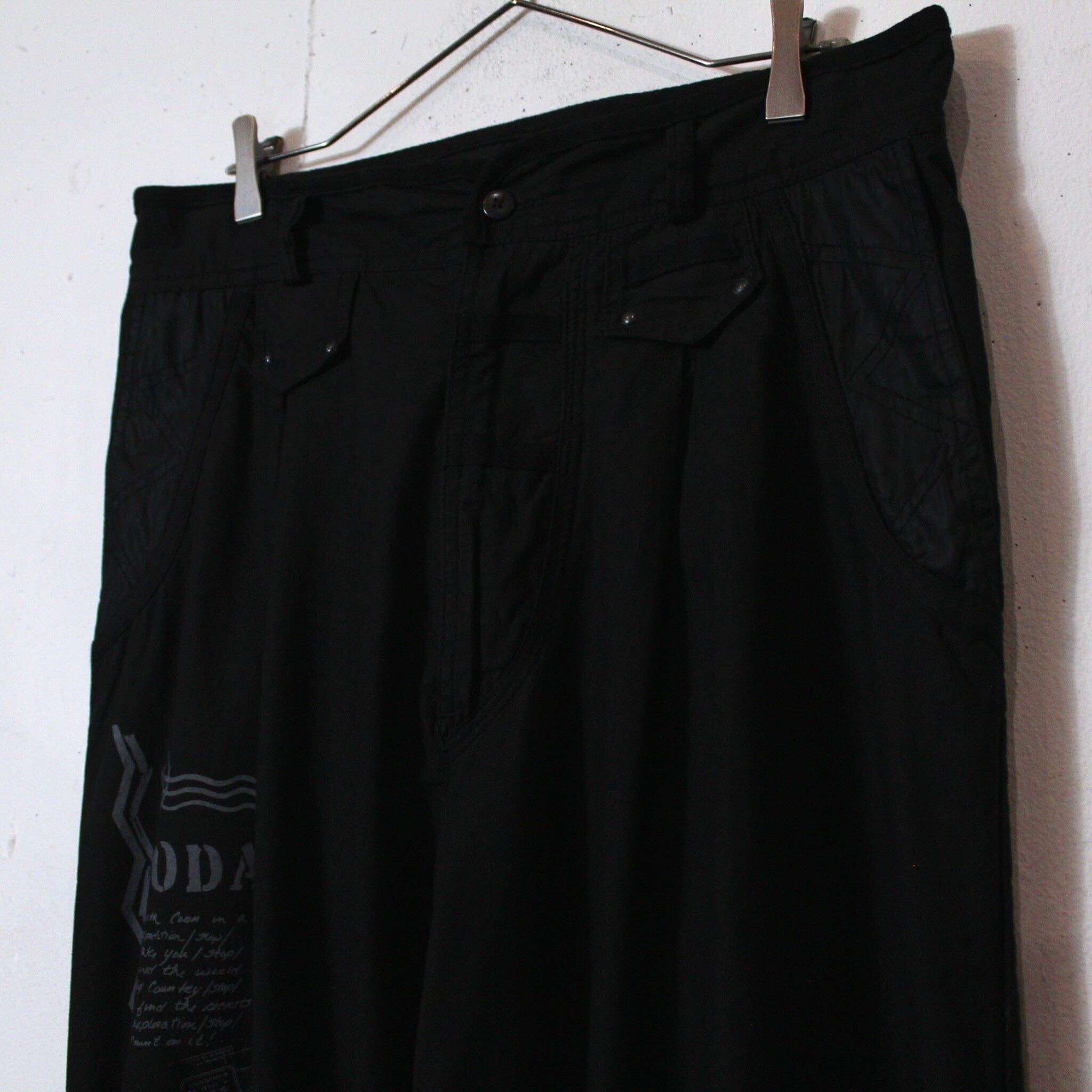 ハリのある薄手のブラックのボディに、右太腿にレタリングのデザインをプリントしたワイドパンツ。