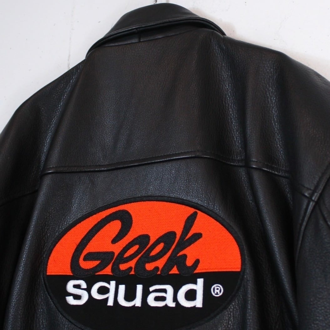 ハリ、コシを兼ね備えた上質なブラックレザーを用いたボディに、左身頃にはベージュ×オレンジのライン、背面にはワッペンを載せた企業モノのレザージャケット。