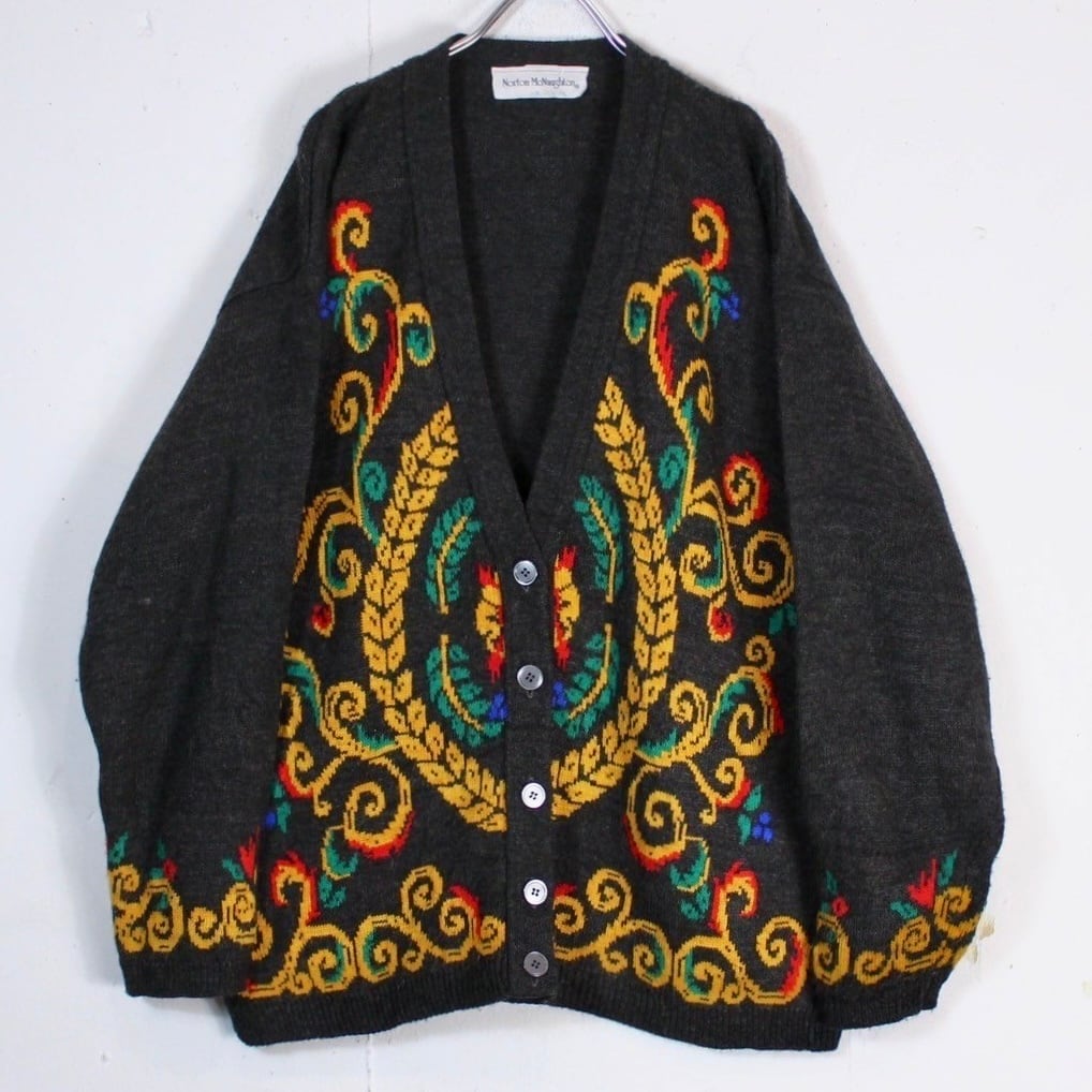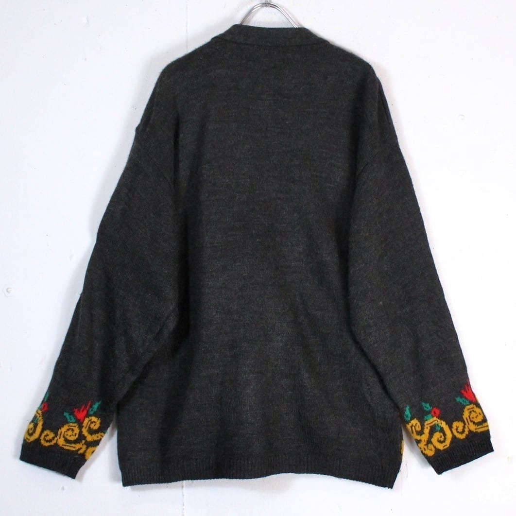 グレーのボディをベースに、ヨーロピアンかつラグジュアルな雰囲気を纏ったデザインを表現した、高級感漂うニットカーディガン。