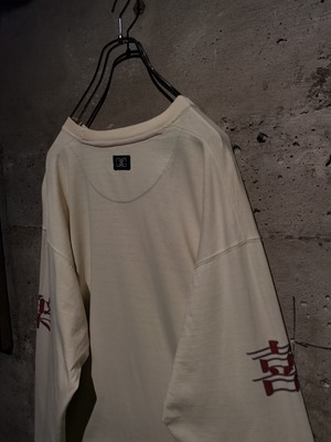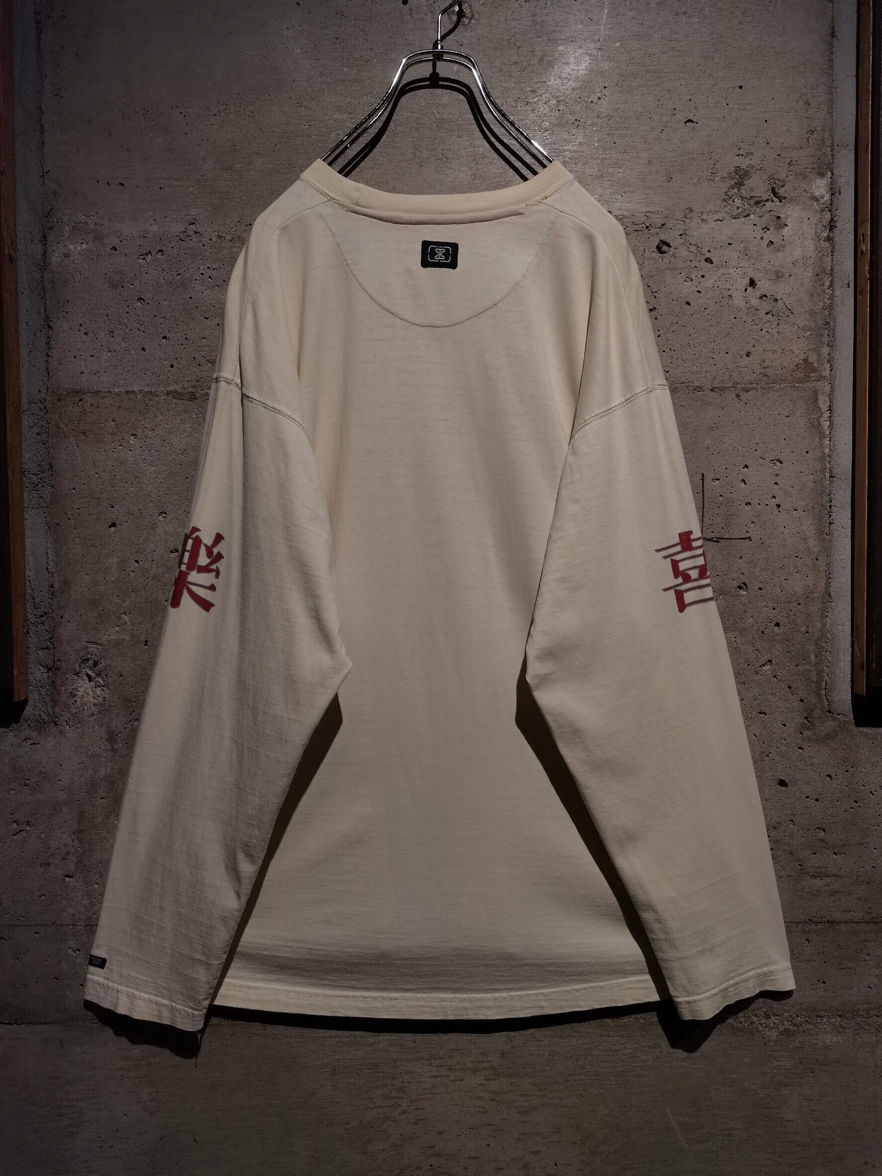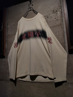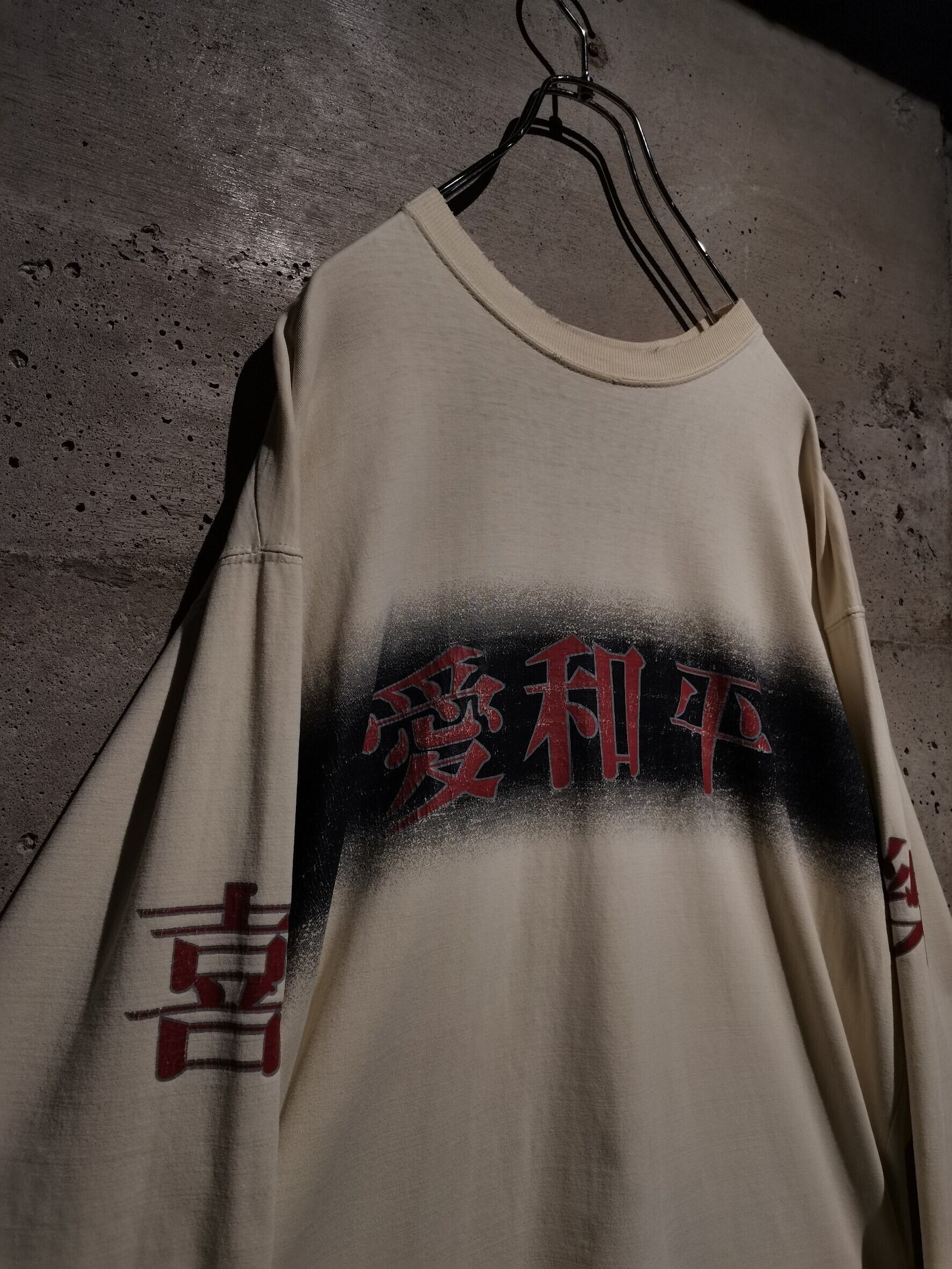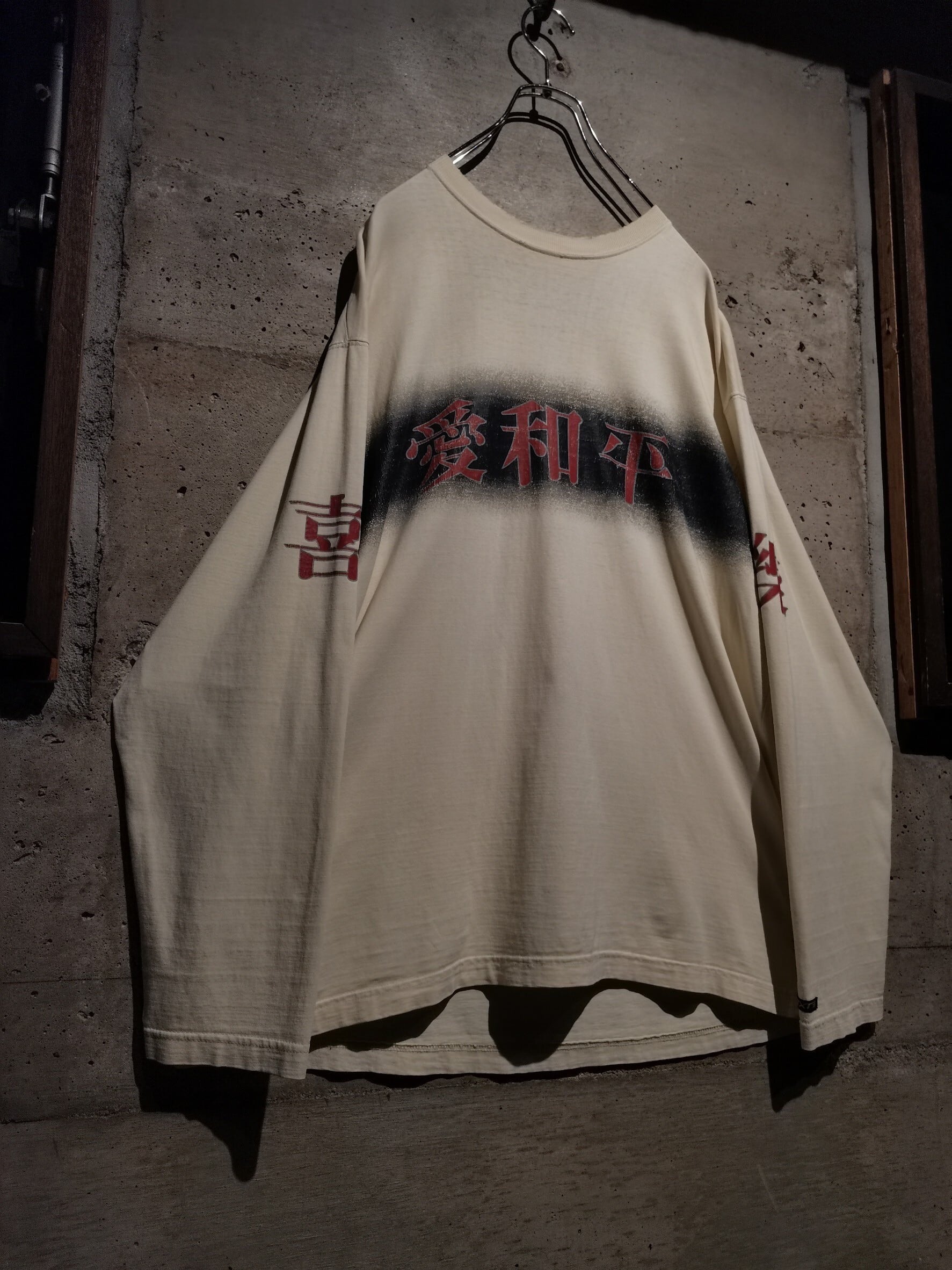生成りのボディをベースに、"平和" "愛" "楽" などのかなりパピネスかつハートフルな漢字をプリントで載せたロンT。