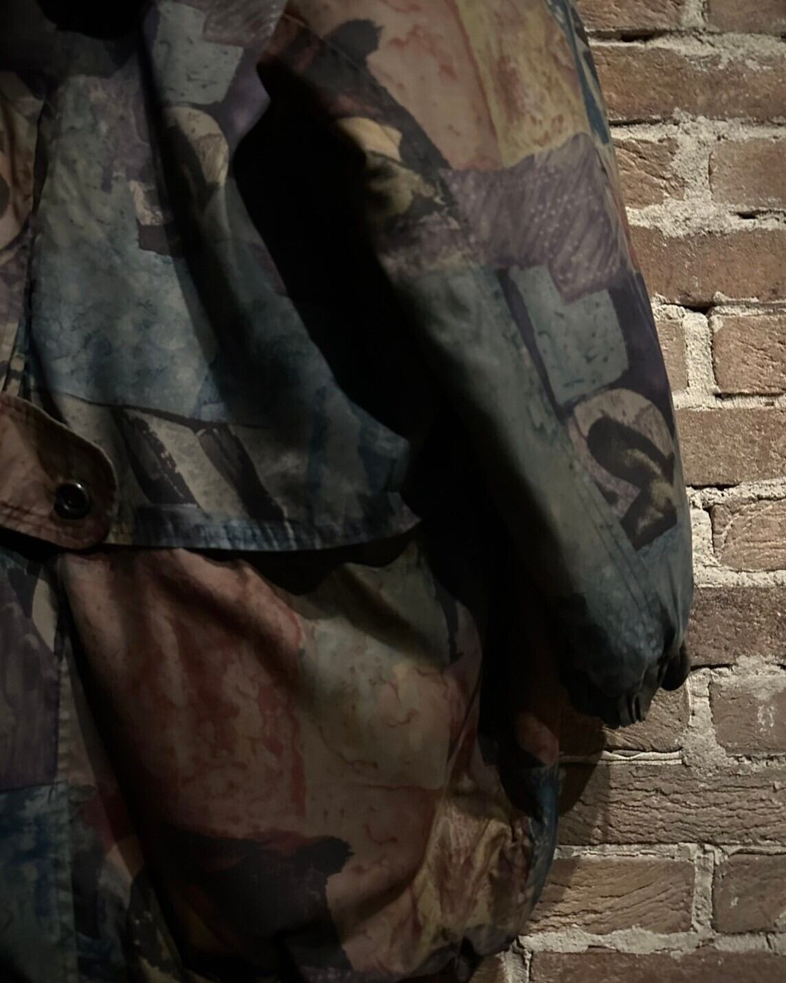 柄だけでなくギミックも盛り沢山なのがこのアイテムのポイント。襟と裾に施されたドローコードでシルエットを変化させ、レイヤードした前合せは着こなしにテクニカルな要素を加えます。