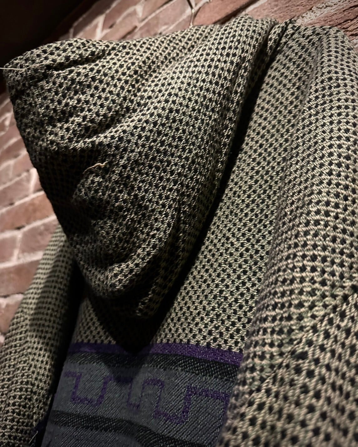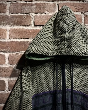ハリ、コシのあるボディをベースに、身頃、アームにネイティブ柄を切り替えたジップアップフーディ。
