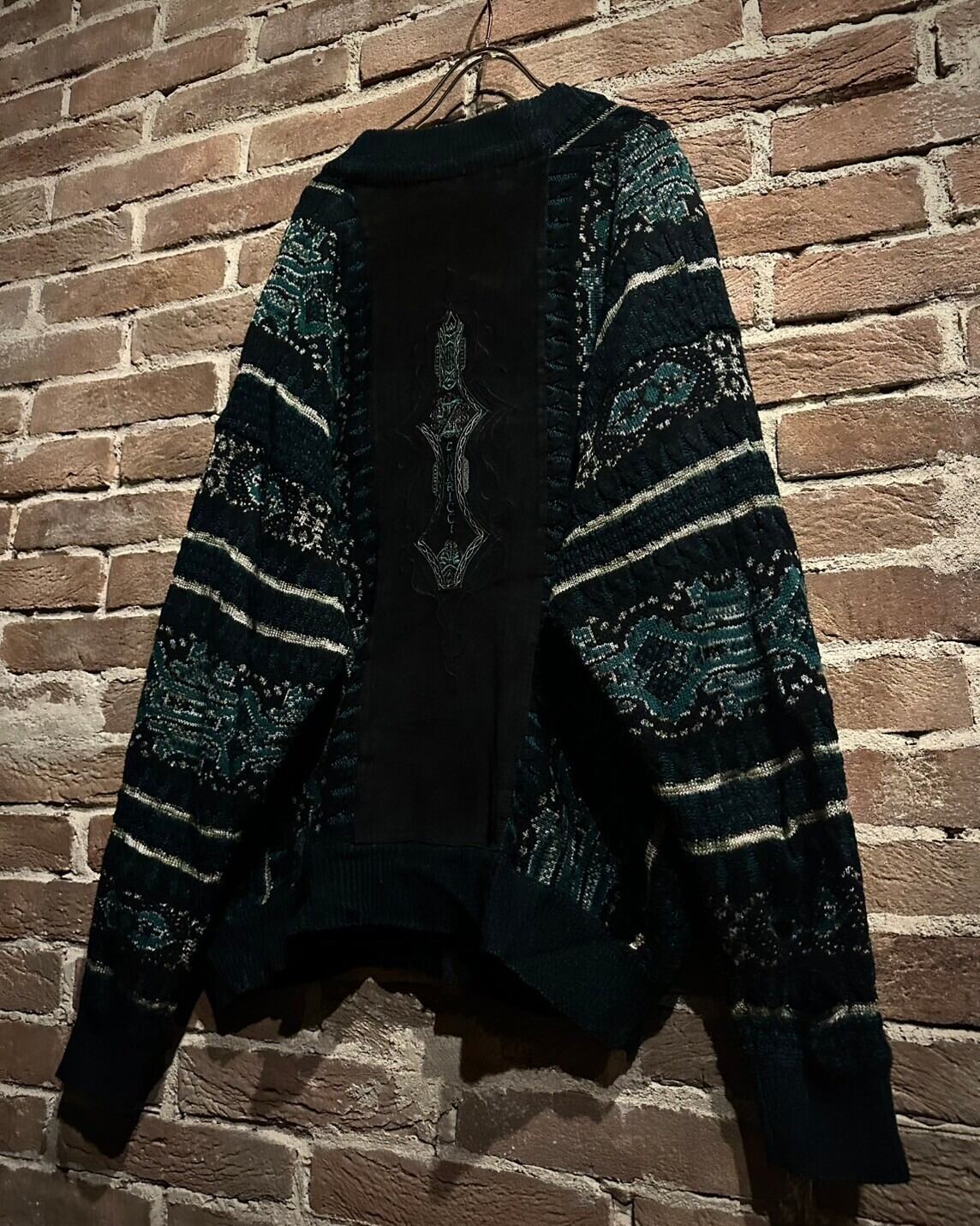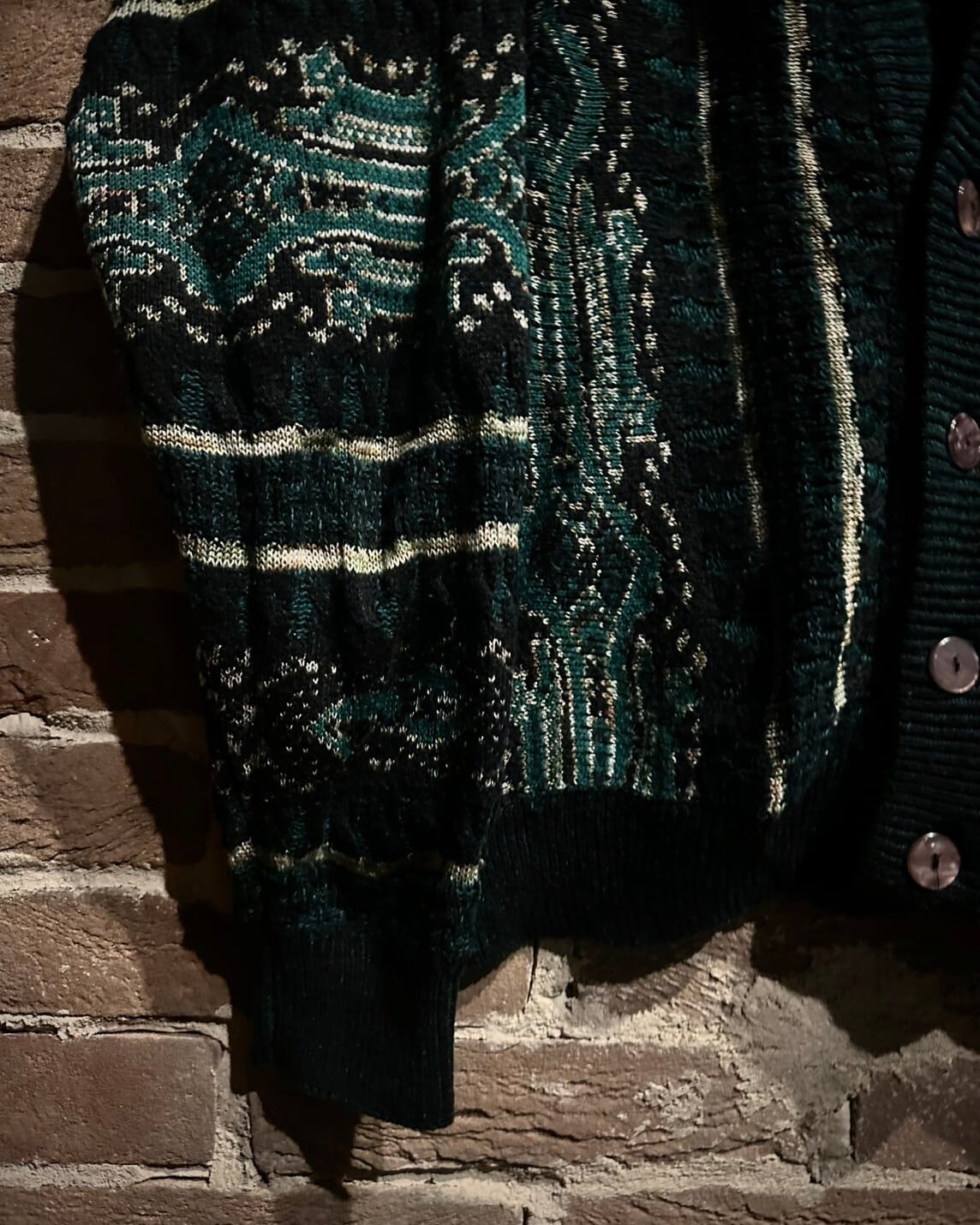 ダークグリーンのボディをベースに、ヨーロピアンな柄模様を繊細なニッティングで表現したカーディガン。