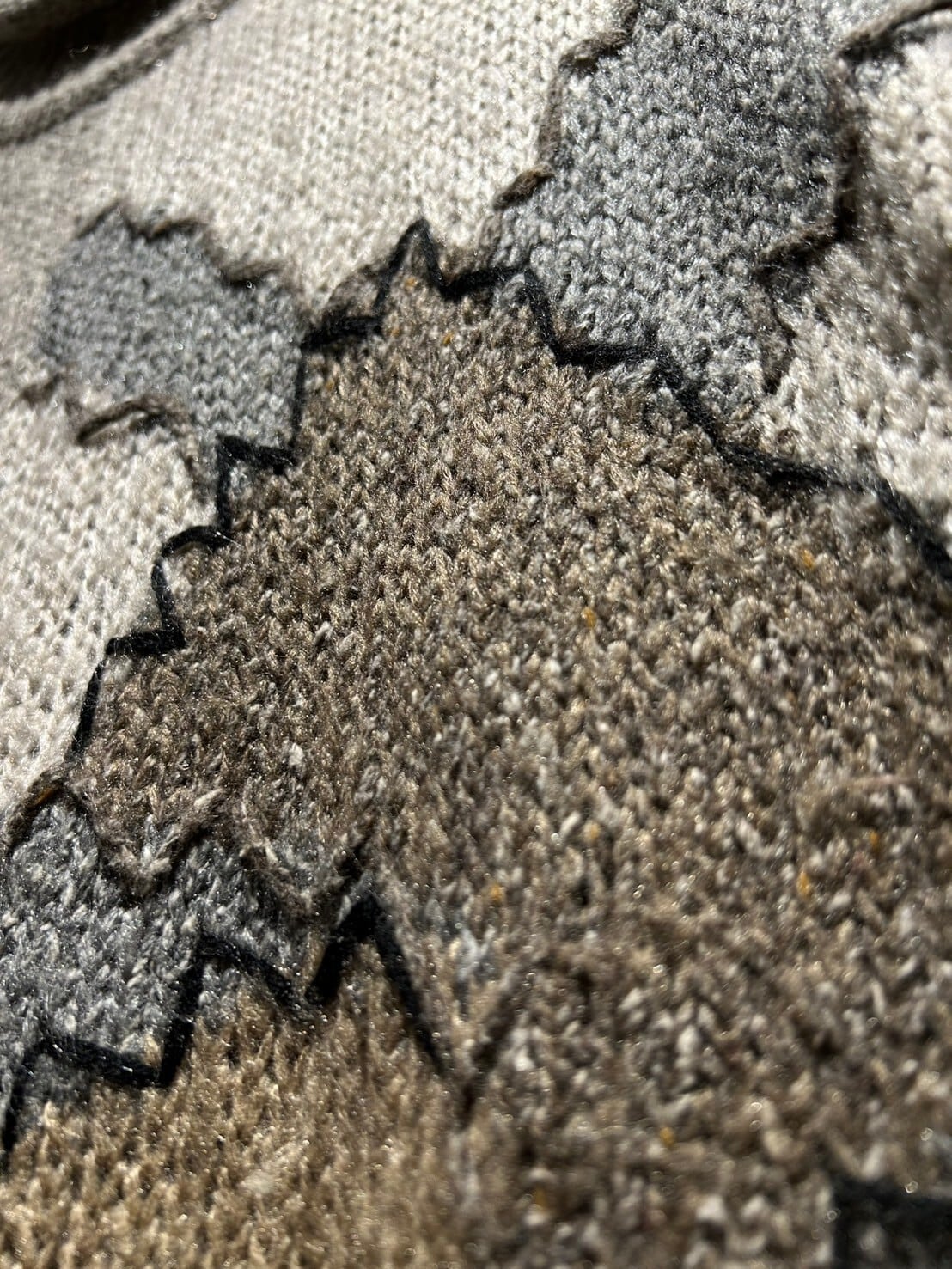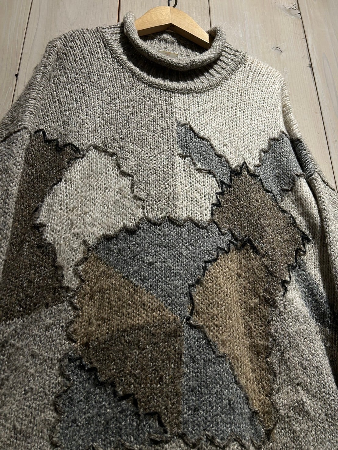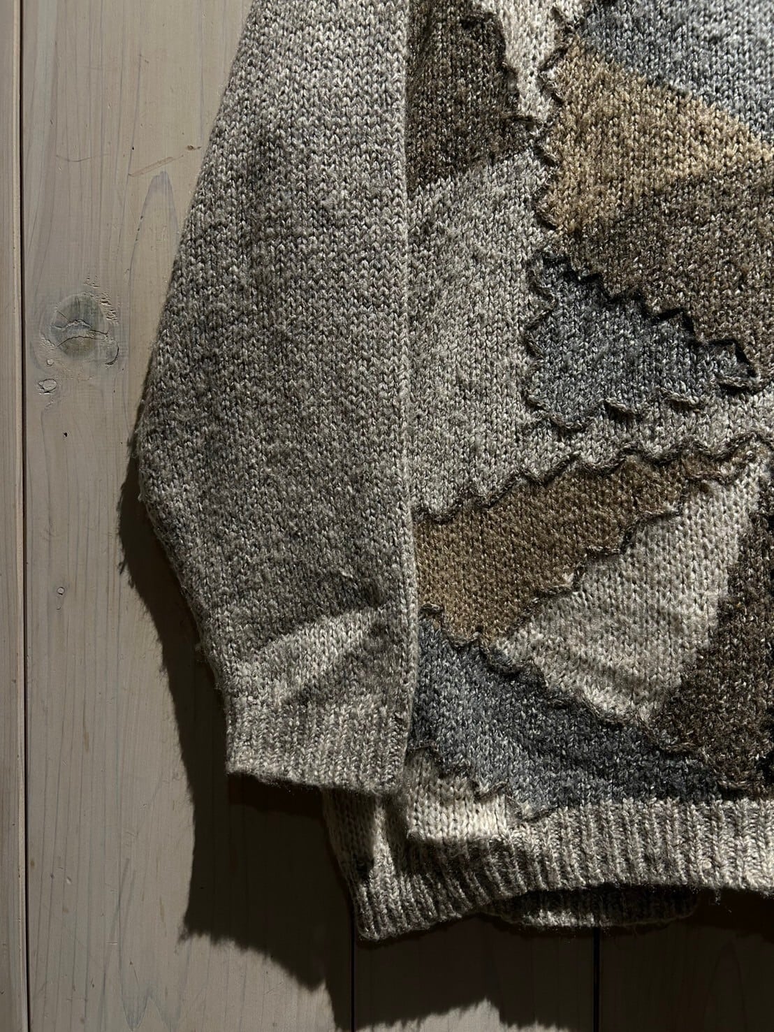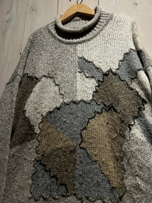 アイボリーやグレー、ベージュ、ブラウンの温かみのあるカラーリングでランダムに切り替えを施し、カラーの切り替えに沿ってジグザグのハンドステッチを施したプルオーバーニット。