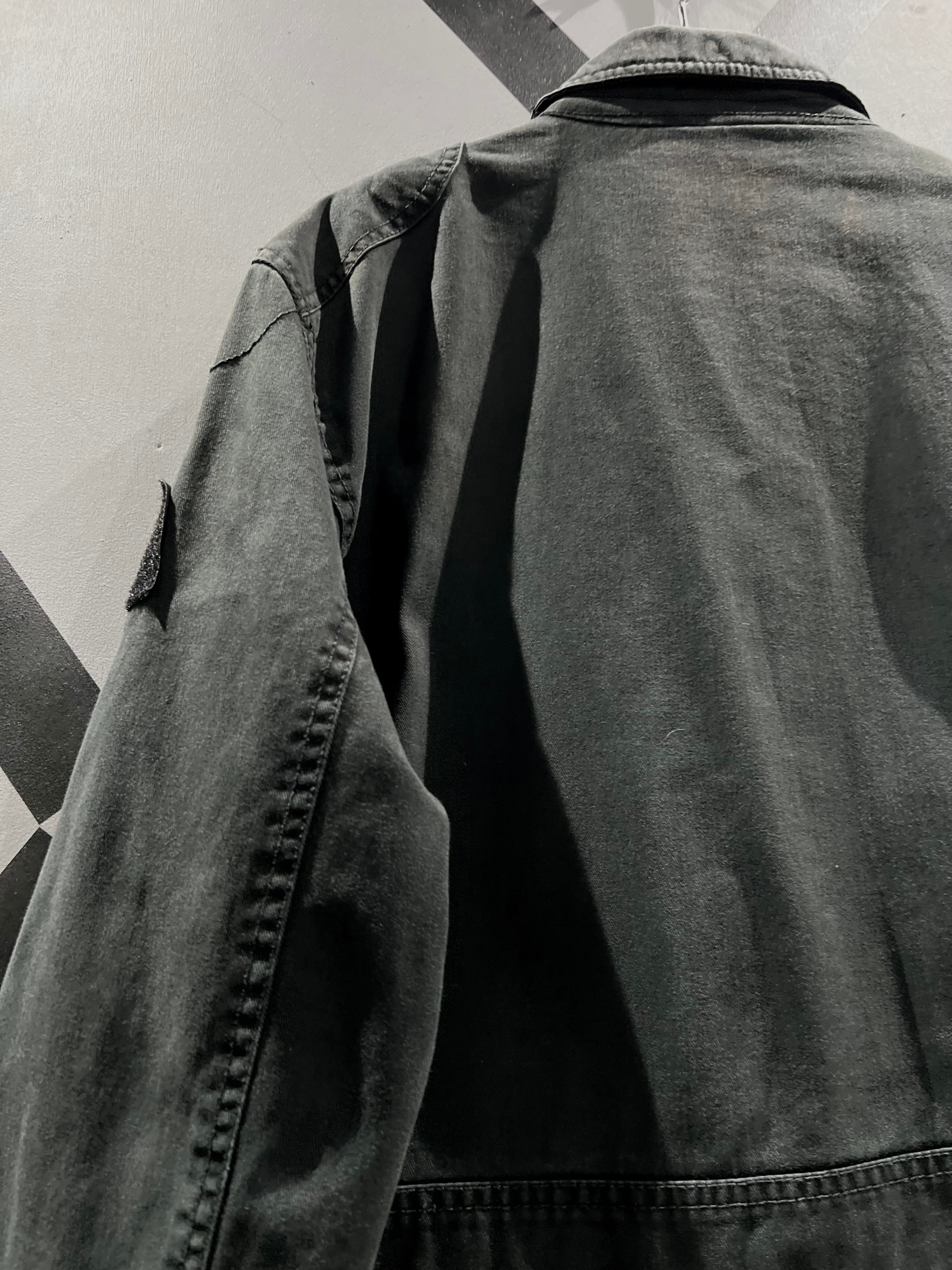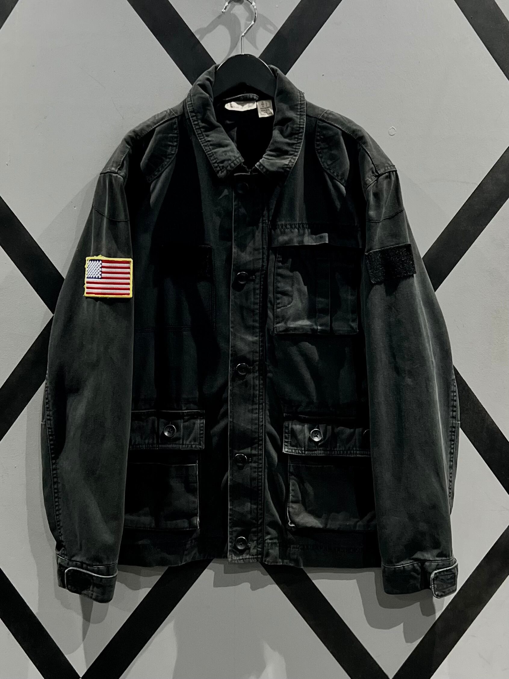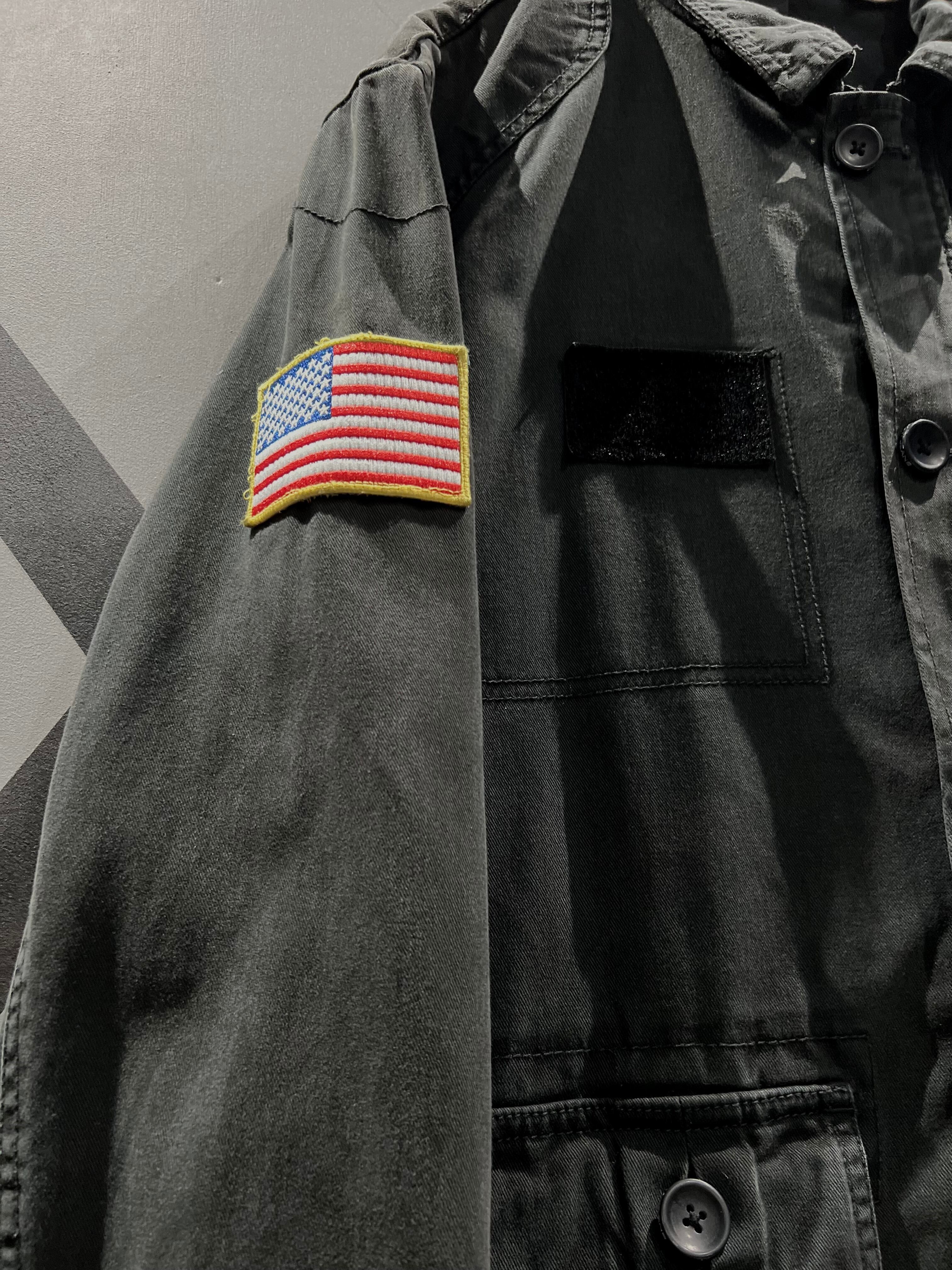 ガシッとハリのある素材を用いて、BDUジャケットのような、ミリタリーモチーフのデザインに仕上げた逸品。