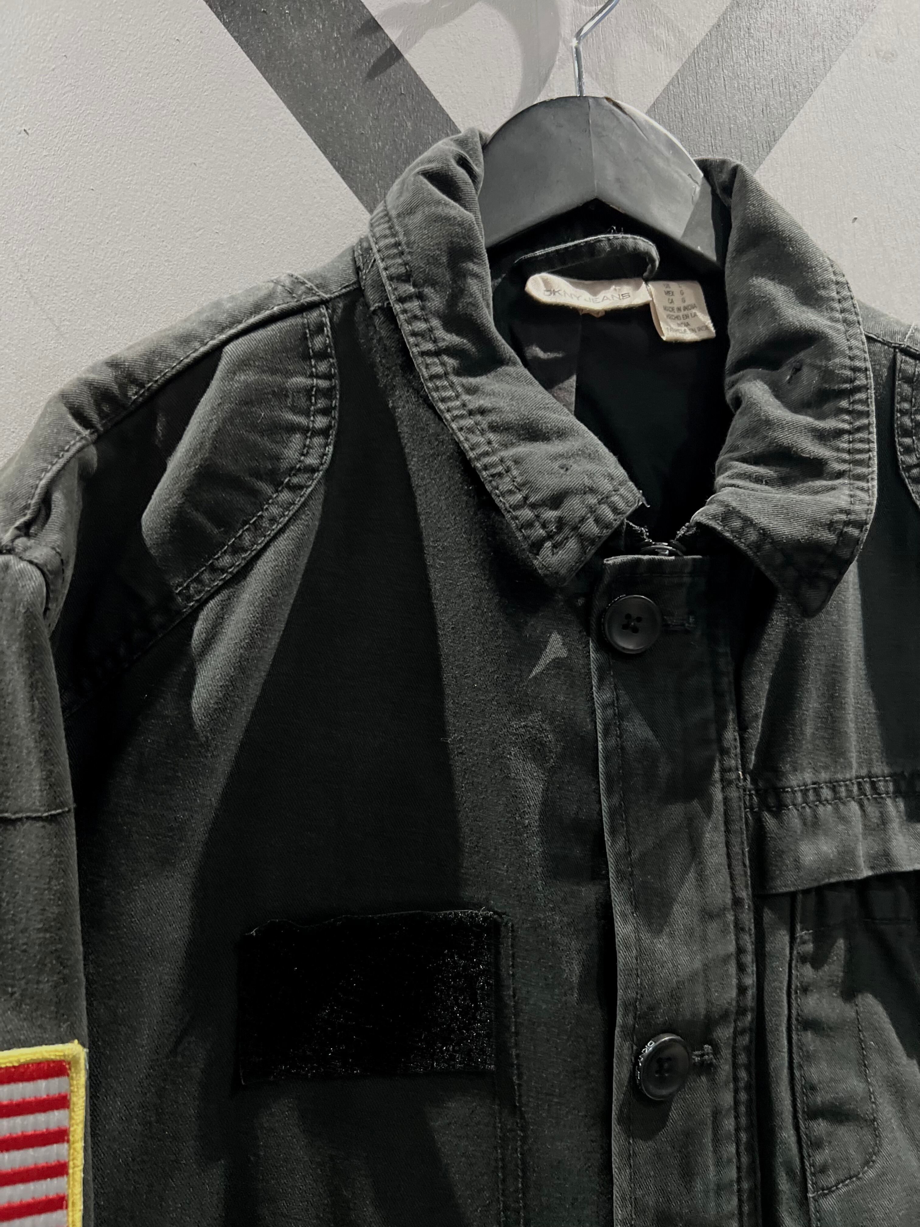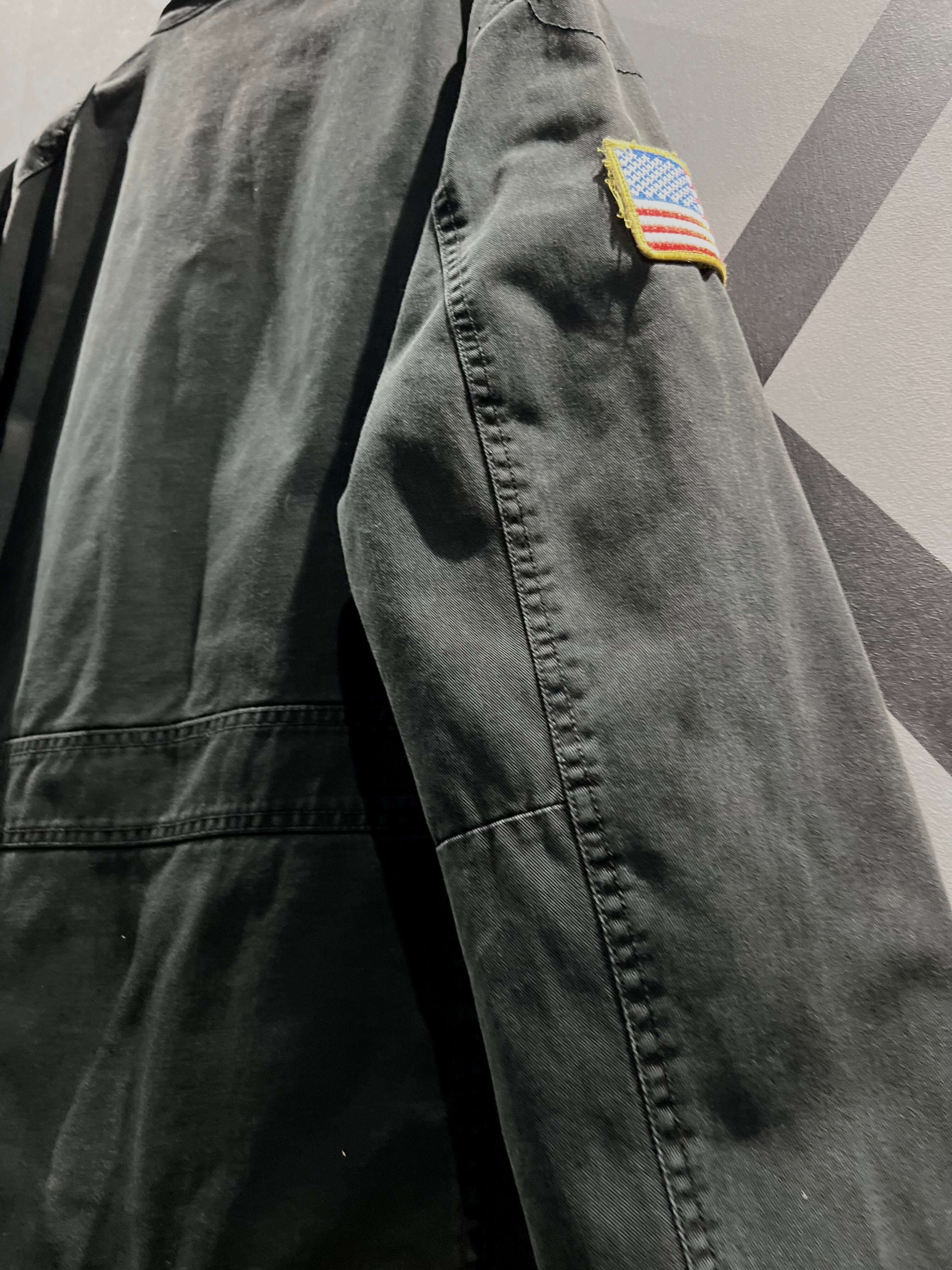 フロントのフラップポケット、アームのベルクロ、袖口のアジャスターベルト、肩の補強のためのパッチなど、ミリタリーらしいギミックがありつつ、このブランドならではの洗練された仕上がりに。