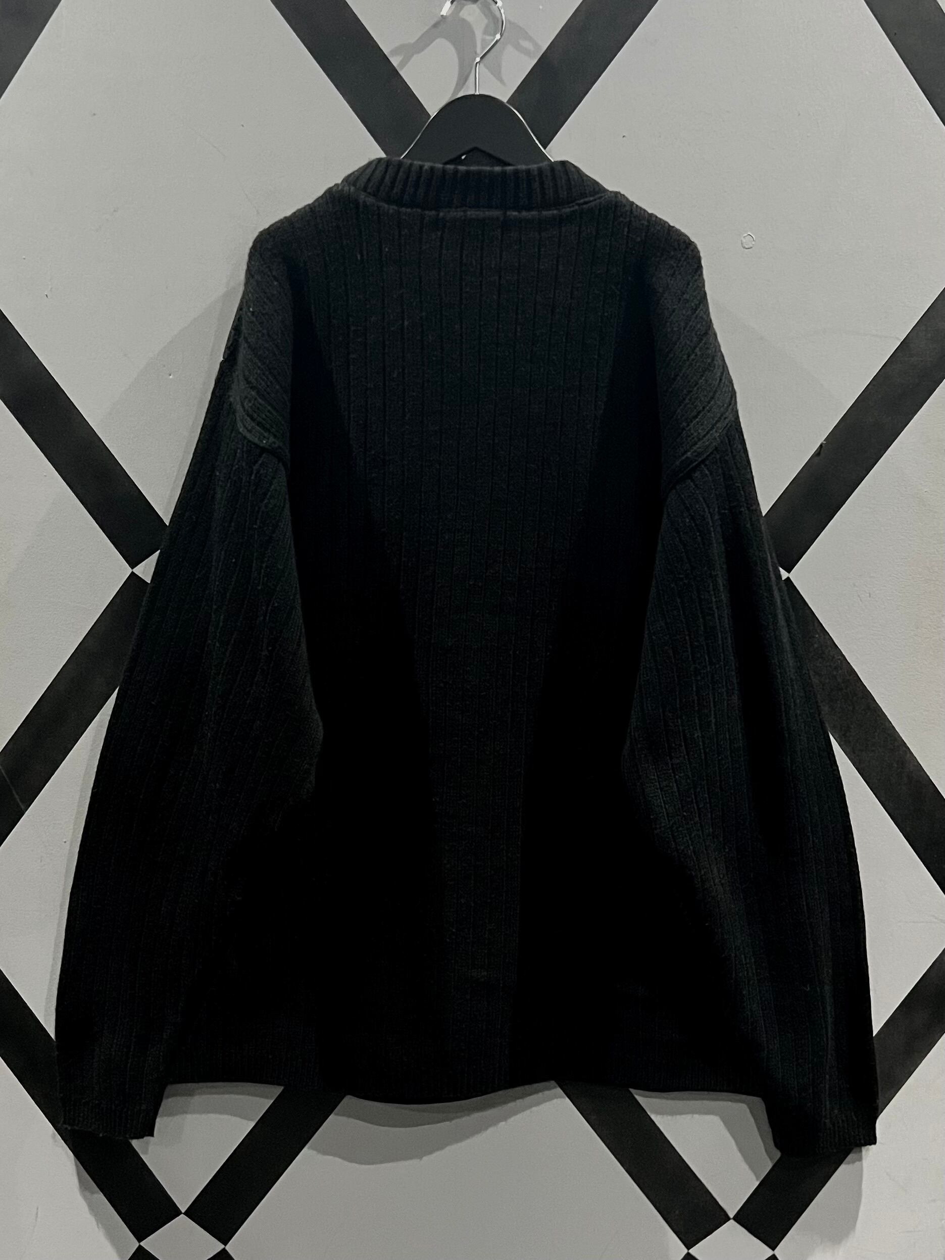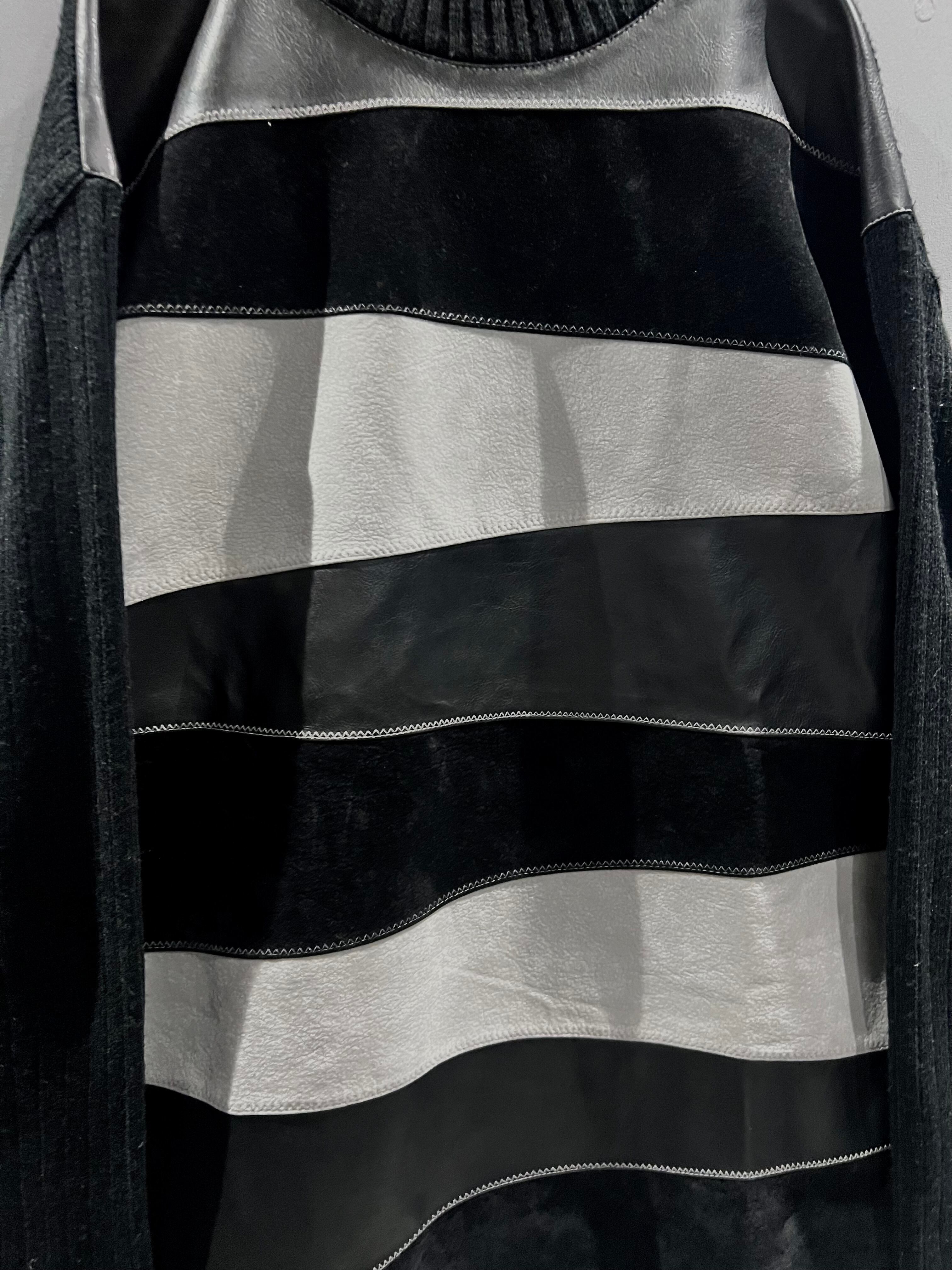 ブラックのニットボディに、しっとりと手触りの良いフェイクのスムースレザー、スエードレザーをボーダー状に切り替えたたプルオーバーニット。