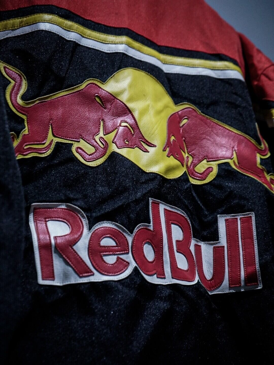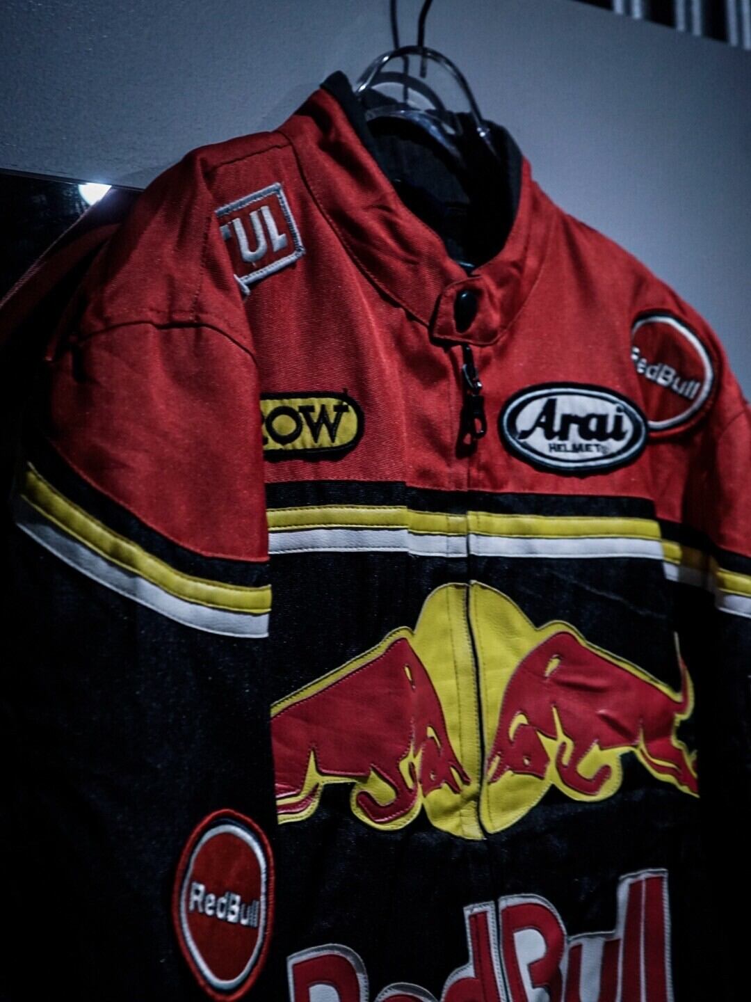ハリ、タフさを兼ね備えた素材を用いて、赤×黒を切り替えた"RedBull"のレーシングジャケット。