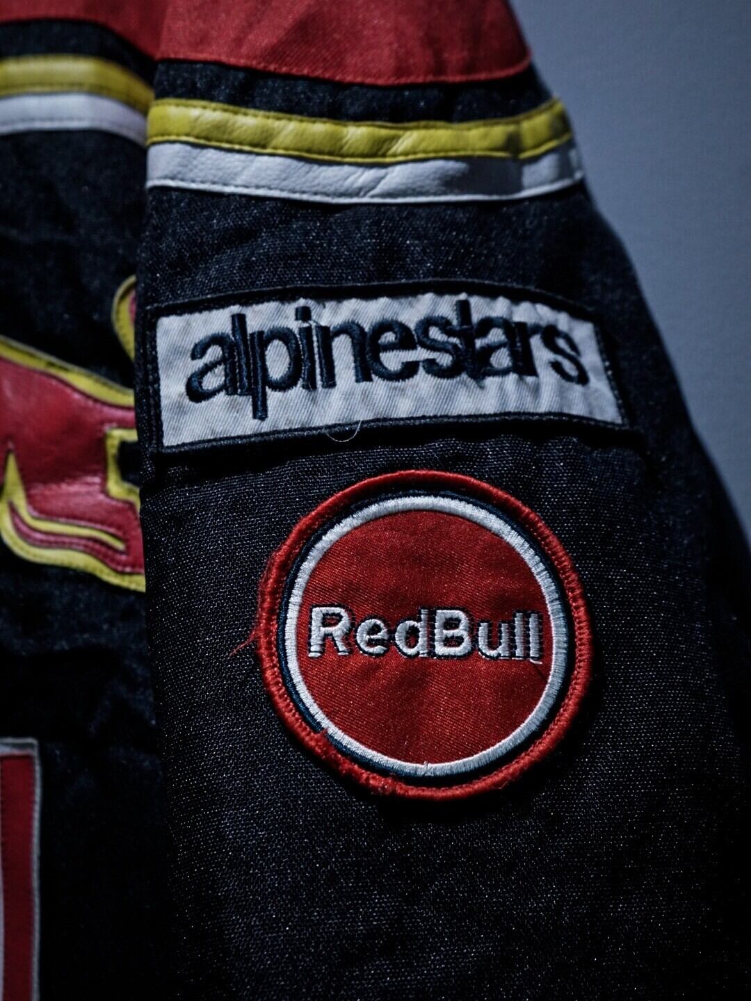 "RedBull"のロゴをレザーパッチで、その他も企業ロゴパッチを載せレーシングらしさがしっかりとありながら、ファッション的な目線で見てもめちゃくちゃイケます。