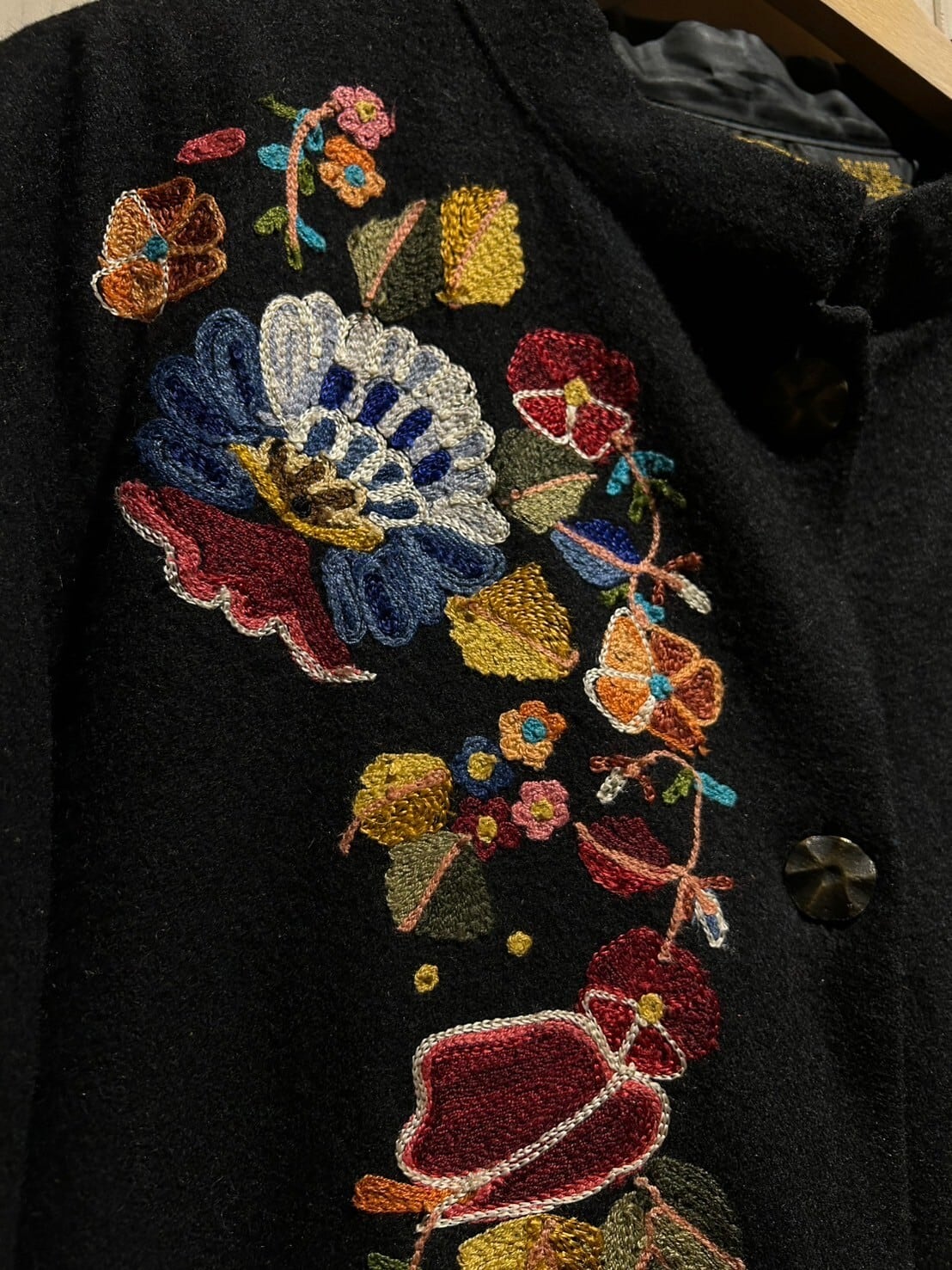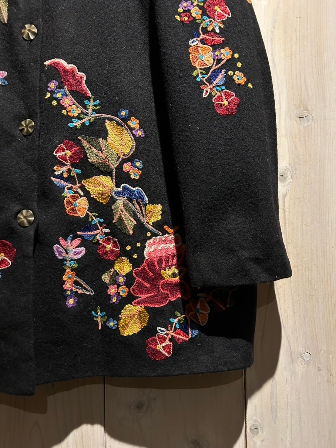 ギュッと目の詰まった上質なウールを用いたボディに、美しい花の刺繍を刻んだウールジャケット。