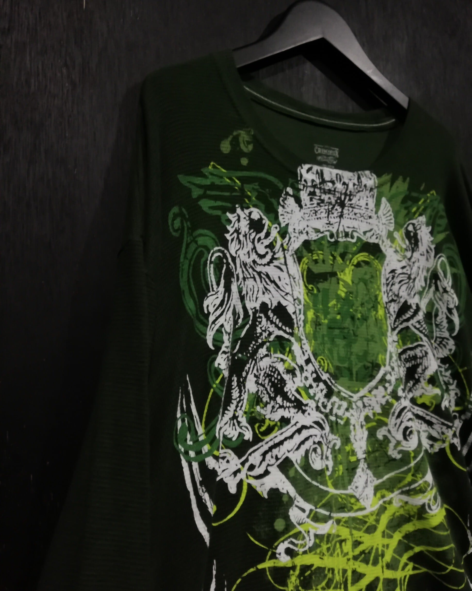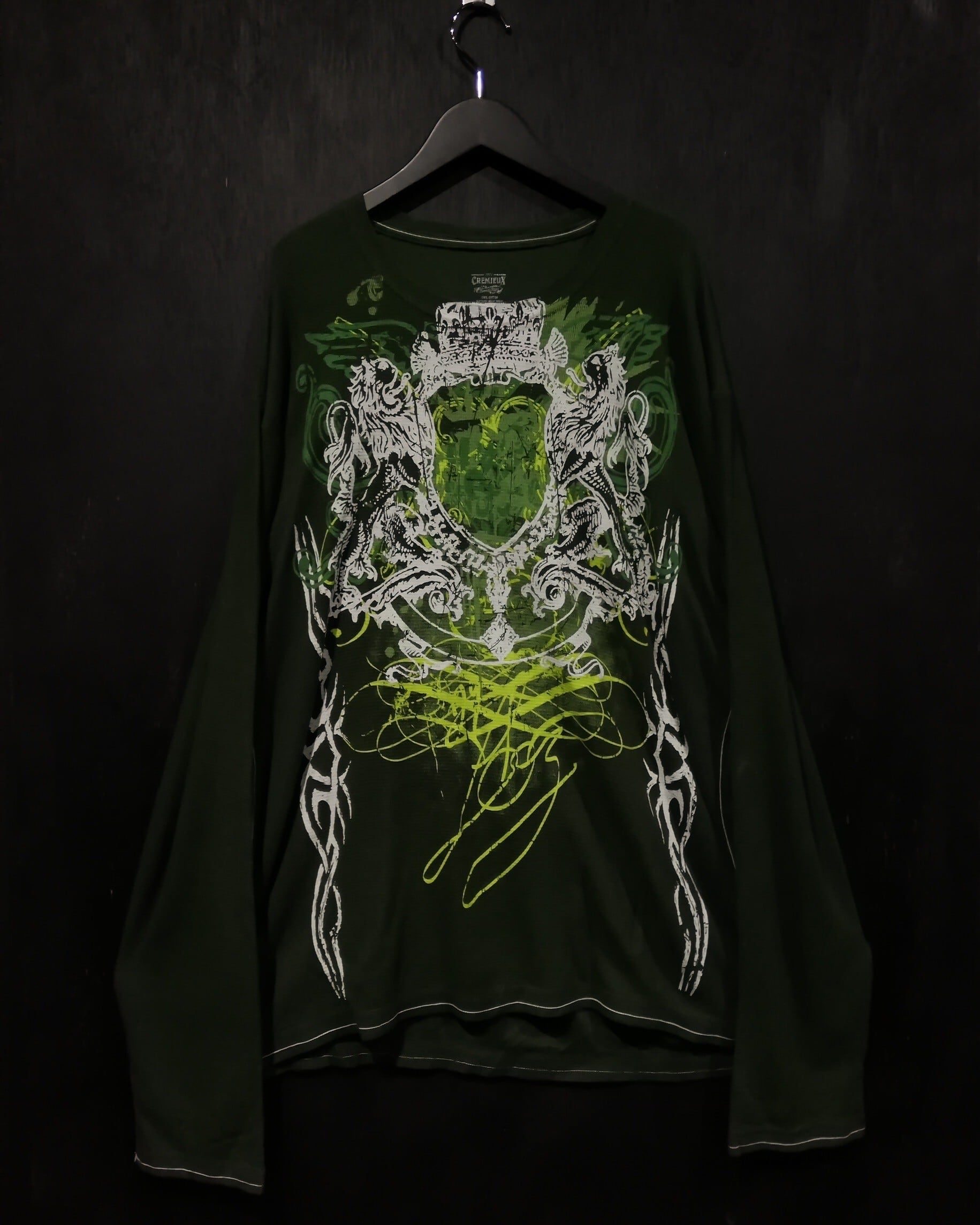 深いグリーンのボディに、ゴシックかつトライバルなデザインをプリントで載せたサーマルロンT。