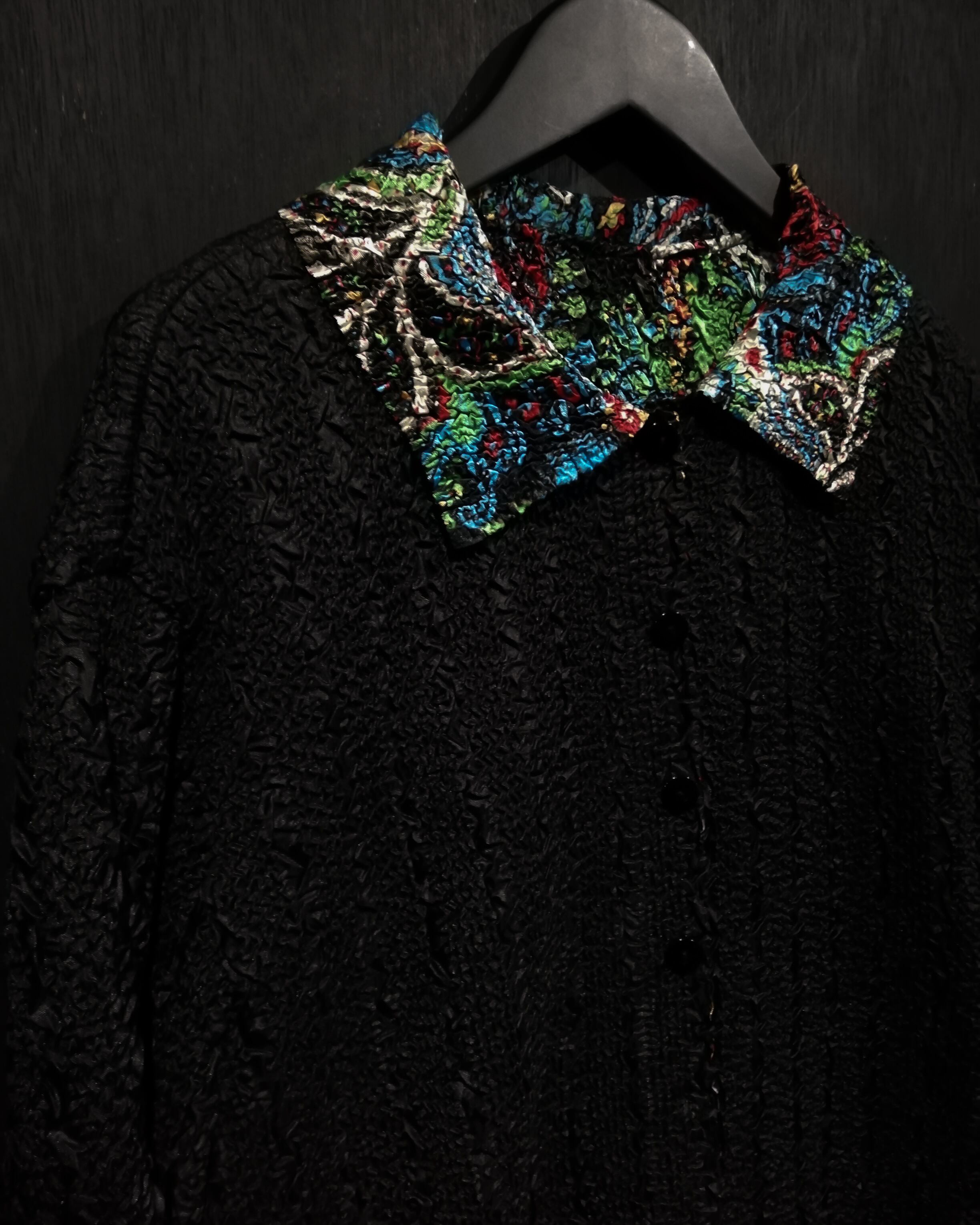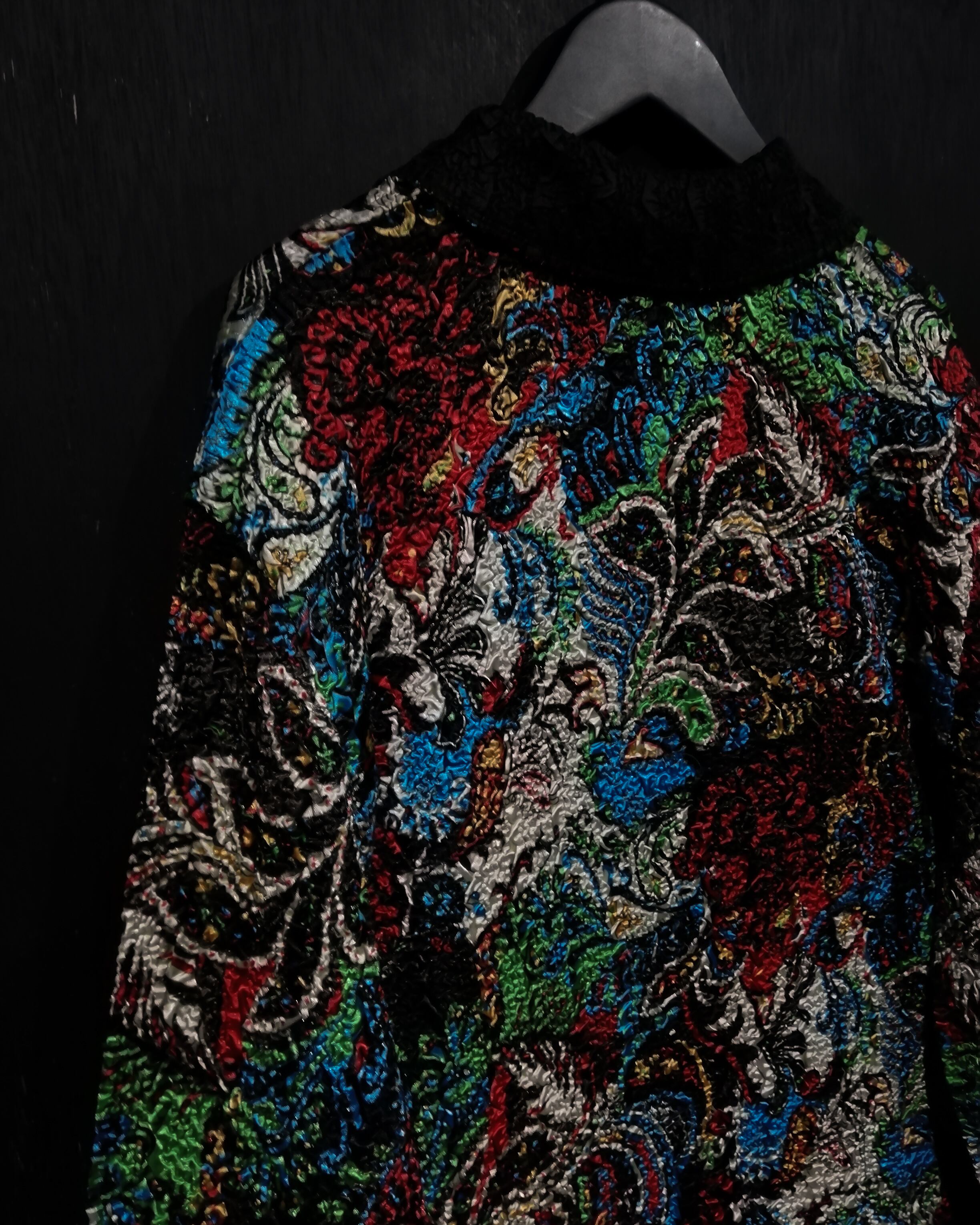 立体感のあるポップコーン素材を用いて、アーティスティックかつモードな花柄を載せたシャツジャケット。