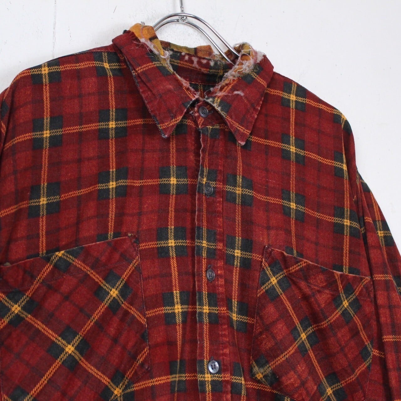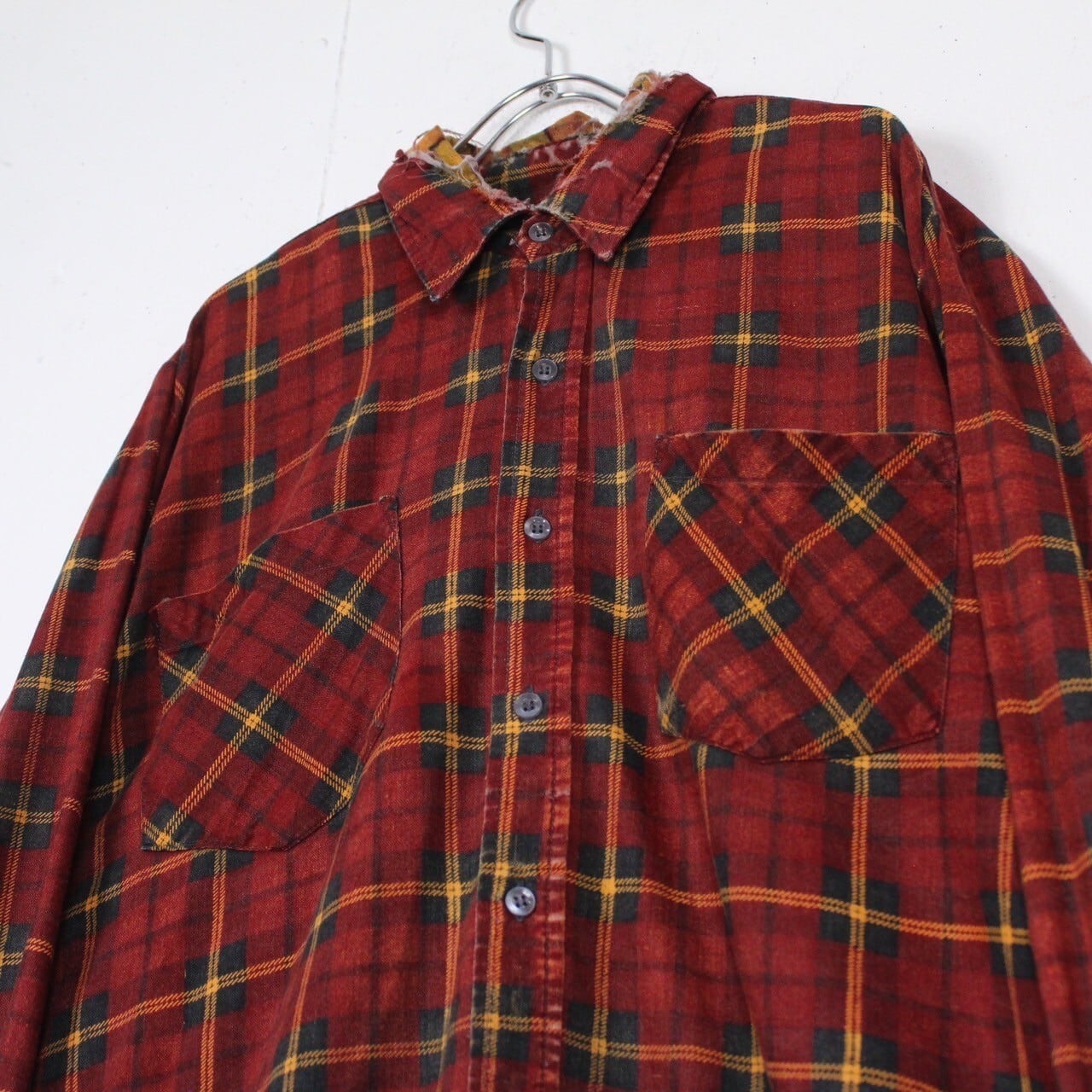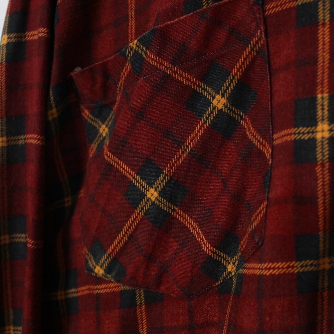 赤色のボディをベースに、緑×黄のチェック柄を載せた長袖シャツ。