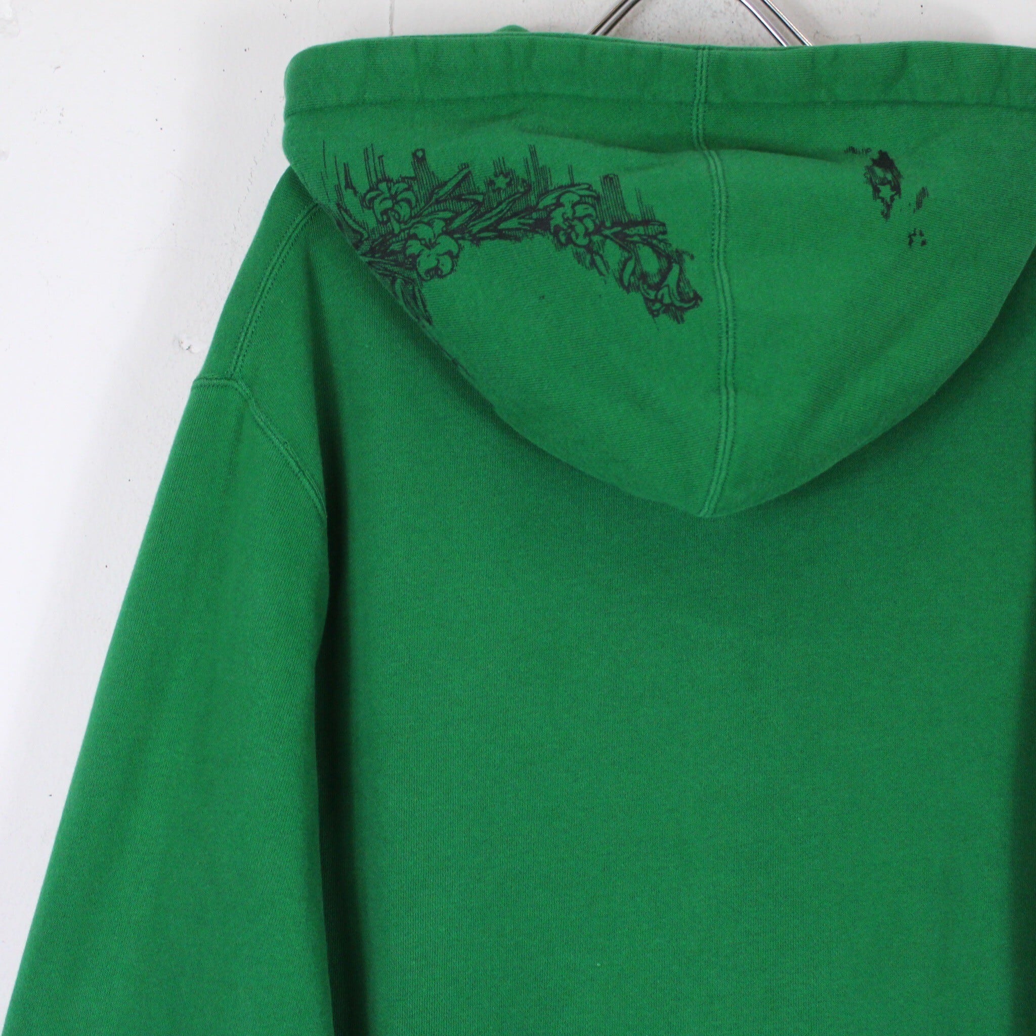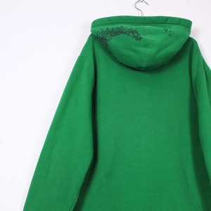 鮮やかなグリーンのボディに、ゴシックデザインをプリントで、アイコニックな狐、ブランドネームをパッチで載せた1着。
