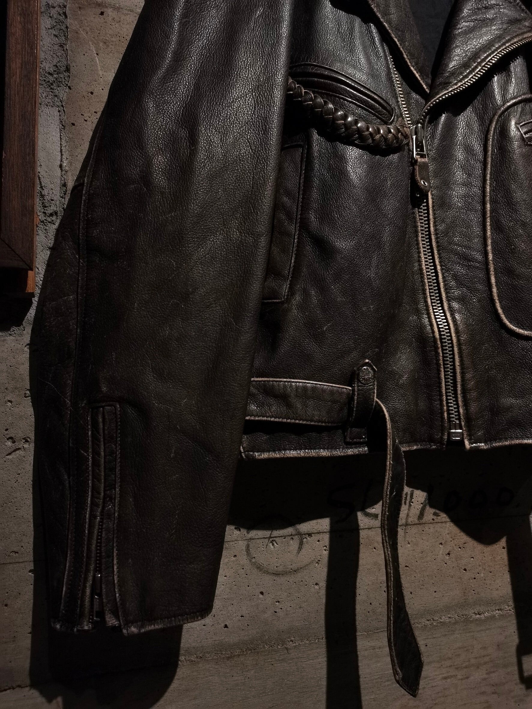 エイジングによって生み出された、退廃的かつ美しい表情を見せるダブルライダースレザージャケット。